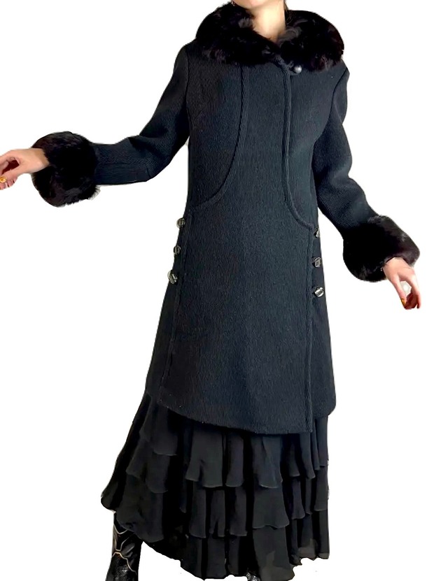 60’sモダンのお洒落すぎるファー付きコート。 目を引く個性的な曲線デザインの打ち合わせは、大変美しく、アーティスティック! 60’sならではの柔らかなAラインと、クラシックな切り替えしによるデザインがたまりません! 襟とカフスに施された大胆なブラック系のファー使いは大変クールで、モダンなデザインにとてもよくマッチしています。 ポケットあり 裏地あり Made in USA モデル身長:171cm <<MATERIAL>> おそらくウール リアルファー <<SIZE>> A 92cm B 56cm C 43cm D 47cm E 51cm F 79cm ※寸法は一番最後に掲載している画像をご参照ください。 ※全て平置きの寸法です。若干の誤差はご容赦ください。 ※著作権法により、弊店投稿写真の無断転載は一切お断りしております。 *** オンラインショップにアップしているアイテムは、Frescadeのインスタグラム、動画等で掲載の予定がございます。ご了承下さい。 Frescadeでお取り扱いしている商品は全てヴィンテージ品(中古商品)です。 古着の特性上、ほつれやダメージ等がある場合がございます。それも古着ならではの良さとご了承の上でお買い求めいただきますようお願いいたします。 ご購入後の返品は一切お受けできませんので、ご注意くださいませ。 *** できる限り実物の色に近いものを掲載しておりますが、ご覧になられているブラウザやパソコン等の環境により、実際の色や印象と若干異なる場合がございます。何卒ご了承ください。 *** 不明点が御座いましたら、弊店メールまでご連絡くださいませ。 *** 当店のオンラインショップおよびSNS等に掲載している画像・文章等につきまして、著作権法に基づき、使用、転載、複製、改変使用を禁止いたします。 上記著作物の無許可での使用、転載、複製、改変使用が判明した場合、使用を即時中止する旨のご連絡を差し上げた後、法的措置を執ることも検討いたしますのでご了承下さい。 ============================== ヴィンテージ ビンテージ vintage ユーズド used 古着 アンティーク antique