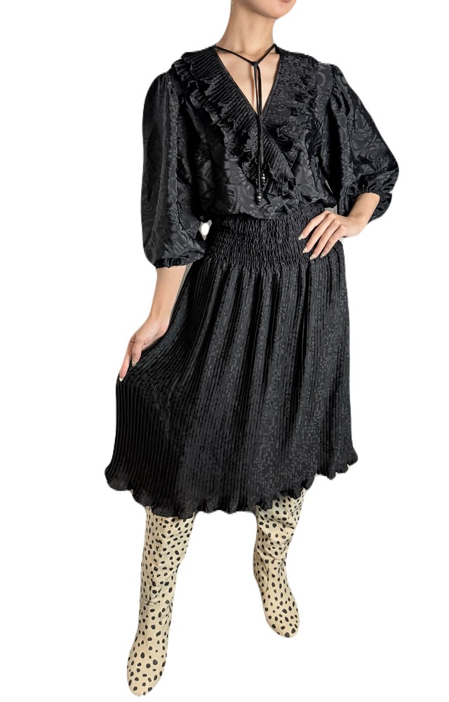 カラフルなプリントで人気のSusan Freisですが、こちらは大変レアな単色ブラックのワンピース! ジオメトリックなパターンが織り込まれたテキスタイルは、光の当たり具合でデザインが浮き上がり、オールブラックながら華があります。 ボトムは細かいプリーツ広がりすぎず、ガーリーな印象にならず大人な印象です。 Made in USA モデル身長:164cm <<MATERIAL>> 100%ポリエステル <<SIZE>> A 113cm B 46cm C 40cm D 51cm E 30cm〜(ウエストゴムあり/ 最大D幅程度) F 35cm〜 G 66cm H 9cm〜(袖口ゴムあり) I 30cm ※寸法は一番最後に掲載している画像をご参照ください。 ※全て平置きの寸法です。若干の誤差はご容赦ください。 ※著作権法により、弊店投稿写真の無断転載は一切お断りしております。 *** オンラインショップにアップしているアイテムは、Frescadeのインスタグラム、動画等で掲載の予定がございます。ご了承下さい。 Frescadeでお取り扱いしている商品は全てヴィンテージ品(中古商品)です。 古着の特性上、ほつれやダメージ等がある場合がございます。それも古着ならではの良さとご了承の上でお買い求めいただきますようお願いいたします。 ご購入後の返品は一切お受けできませんので、ご注意くださいませ。 在庫の無いSOLD OUT商品はシステム上¥50としております。販売中となっていましても¥50の商品は購入不可商品です。ご注意ください。 *** できる限り実物の色に近いものを掲載しておりますが、ご覧になられているブラウザやパソコン等の環境により、実際の色や印象と若干異なる場合がございます。何卒ご了承ください。 *** 不明点が御座いましたら、弊店メールまでご連絡くださいませ。 *** 当店のオンラインショップおよびSNS等に掲載している画像・文章等につきまして、著作権法に基づき、使用、転載、複製、改変使用を禁止いたします。 上記著作物の無許可での使用、転載、複製、改変使用が判明した場合、使用を即時中止する旨のご連絡を差し上げた後、法的措置を執ることも検討いたしますのでご了承下さい。 =========================== ヴィンテージ ビンテージ vintage ユーズド used 古着 アンティーク antique