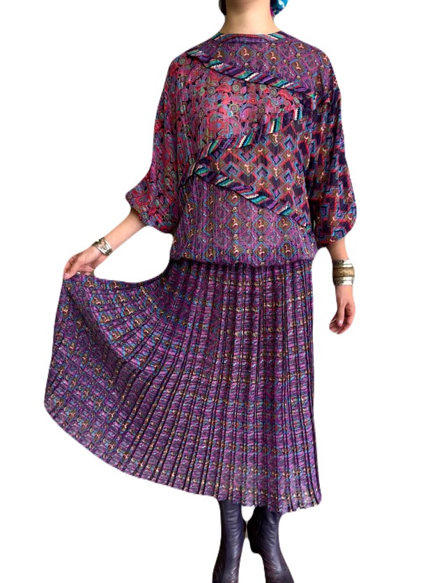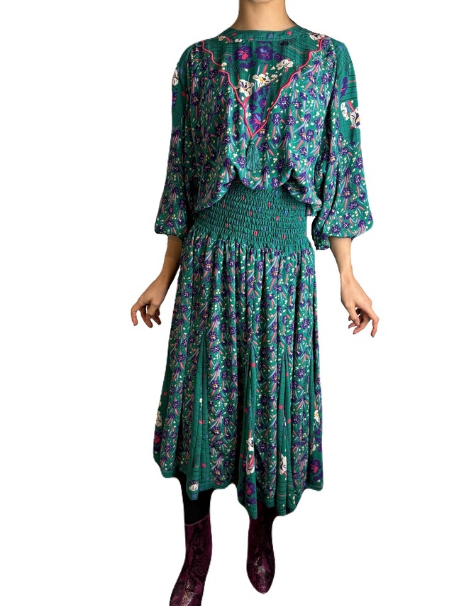Dianeらしさのある色彩。80’sな色柄ですが、シアーな生地により、透明感がプラスされたワンピース。 フラワーやジオメトリックプリントがアートに描かれ、プリーツ加工によって生まれる立体を加えることにより、シアーなテキスタイルに印影をプラスし、深みをプラスします。 軽やかに切り替えられたウエストのシルエットは、ボディラインを拾いすぎず、快適な着心地と華やかさを両立します。 通年様々なスタイルで着用いただけます。 モデル身長:167cm <<MATERIAL>> 100%ポリエステル <<SIZE>> A 136cm B - C - D - E 最大40cm程度(ウエストゴムあり) F 28cm〜最大145cm程度(ウエストゴムの伸び具合により変動します) G 64cm H 9cm〜(袖口ゴムあり) I - ※寸法は一番最後に掲載している画像をご参照ください。 ※全て平置きの寸法です。若干の誤差はご容赦ください。 ※著作権法により、弊店投稿写真の無断転載は一切お断りしております。 *** オンラインショップにアップしているアイテムは、Frescadeのインスタグラム、動画等で掲載の予定がございます。ご了承下さい。 Frescadeでお取り扱いしている商品は全てヴィンテージ品(中古商品)です。 古着の特性上、ほつれやダメージ等がある場合がございます。それも古着ならではの良さとご了承の上でお買い求めいただきますようお願いいたします。 ご購入後の返品は一切お受けできませんので、ご注意くださいませ。 在庫の無いSOLD OUT商品はシステム上¥50としております。販売中となっていましても¥50の商品は購入不可商品です。ご注意ください。 *** できる限り実物の色に近いものを掲載しておりますが、ご覧になられているブラウザやパソコン等の環境により、実際の色や印象と若干異なる場合がございます。何卒ご了承ください。 *** 不明点が御座いましたら、弊店メールまでご連絡くださいませ。 *** 当店のオンラインショップおよびSNS等に掲載している画像・文章等につきまして、著作権法に基づき、使用、転載、複製、改変使用を禁止いたします。 上記著作物の無許可での使用、転載、複製、改変使用が判明した場合、使用を即時中止する旨のご連絡を差し上げた後、法的措置を執ることも検討いたしますのでご了承下さい。 =========================== ヴィンテージ ビンテージ vintage ユーズド used 古着 アンティーク antique