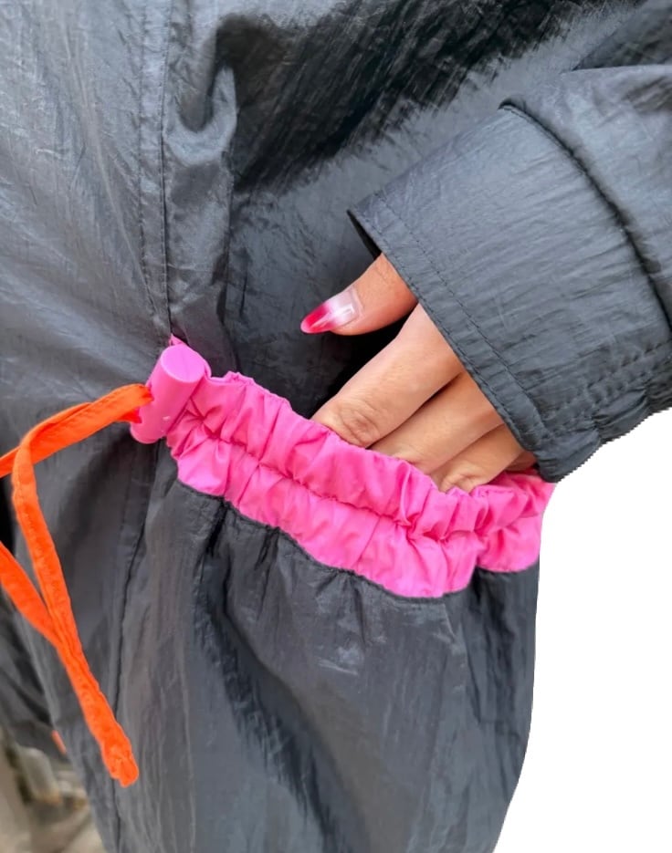 使いやすいブラックジャケットながら、ドローコードまでもが 80’sネオンカラー!そして、袖口や裾から覗く裏地は、アメリカンなヒッコリー柄。あえて見せたい気持ちに駆られてしまう、遊び心くすぐる一枚です。