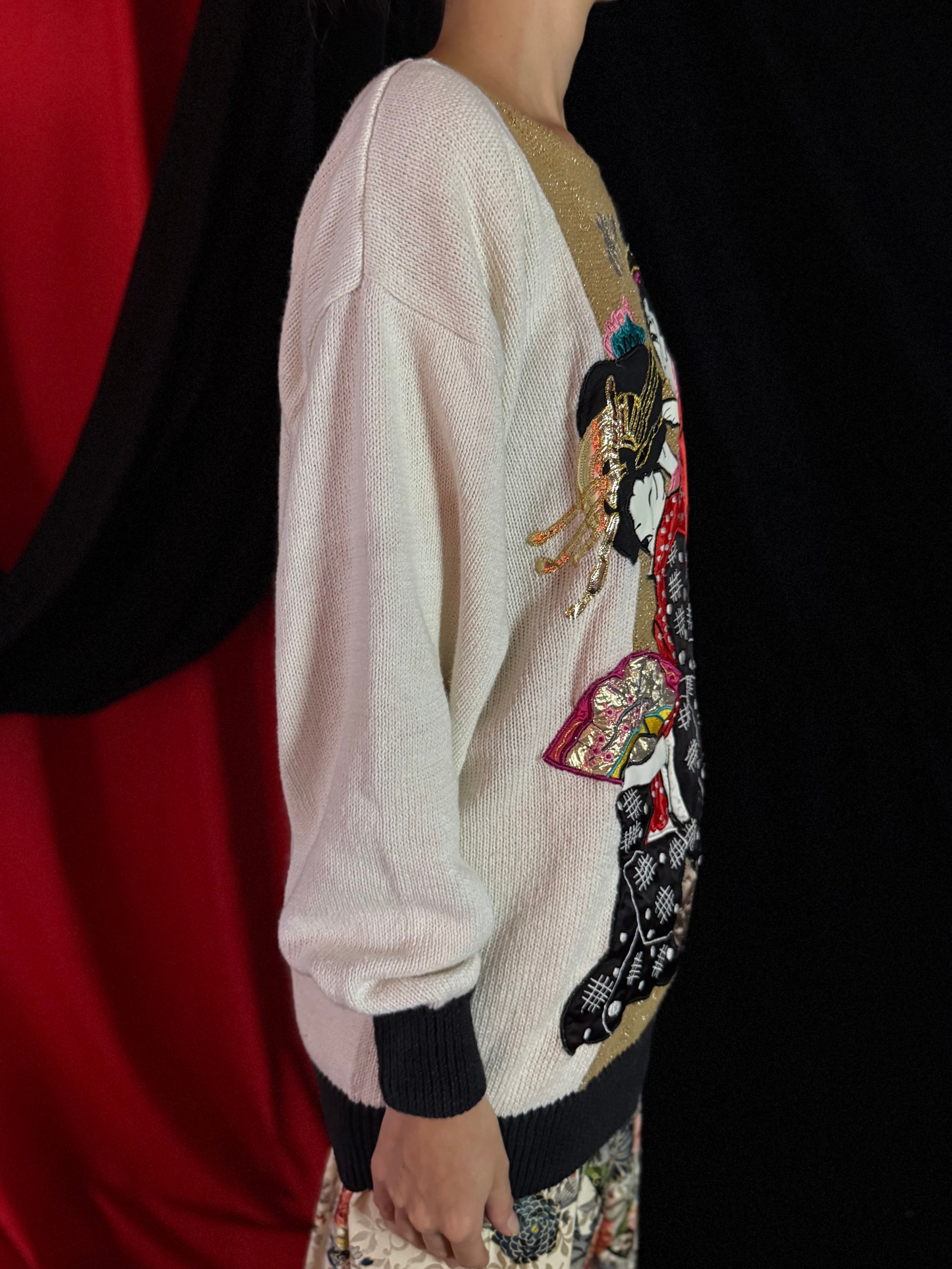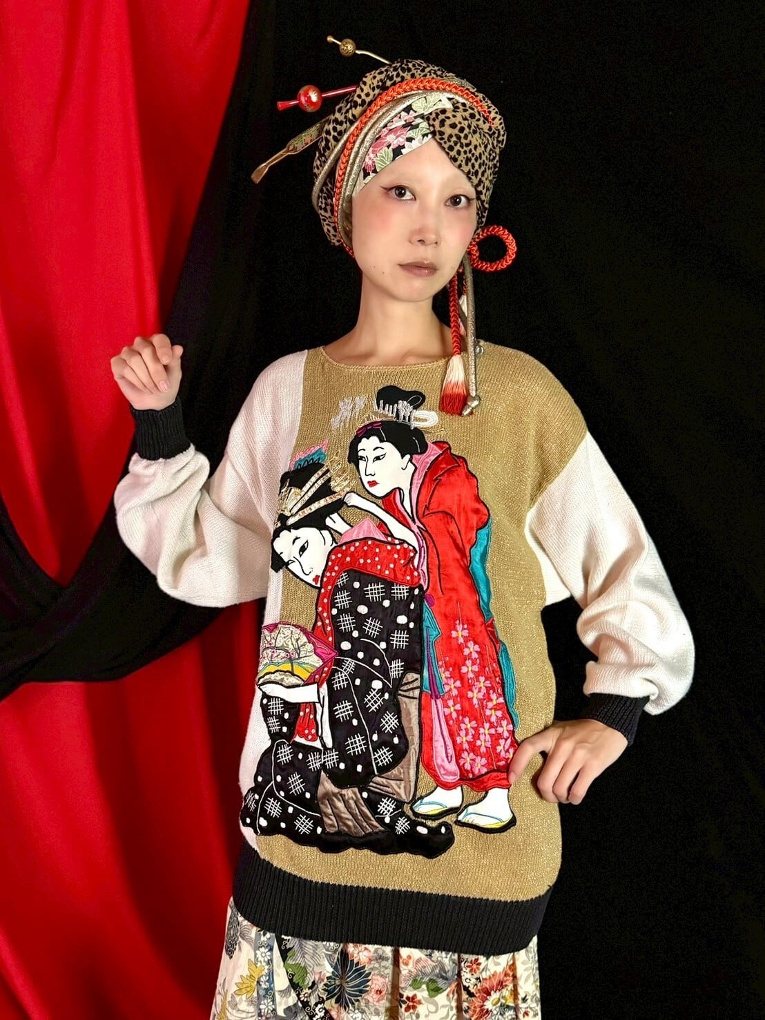 江戸の遊女たちがパッチワークで描かれたとても個性的で希少な80’sニットプルオーバー。