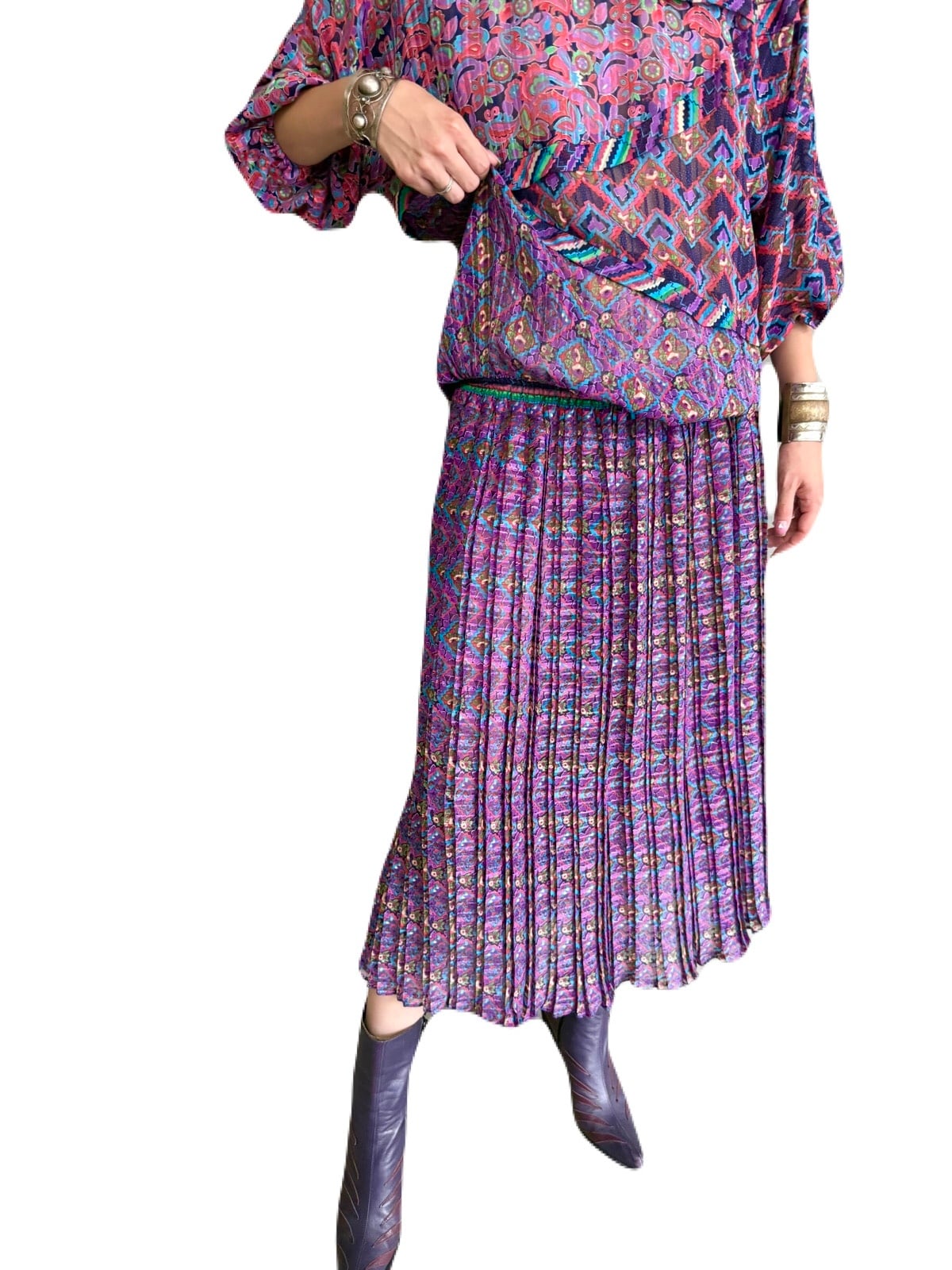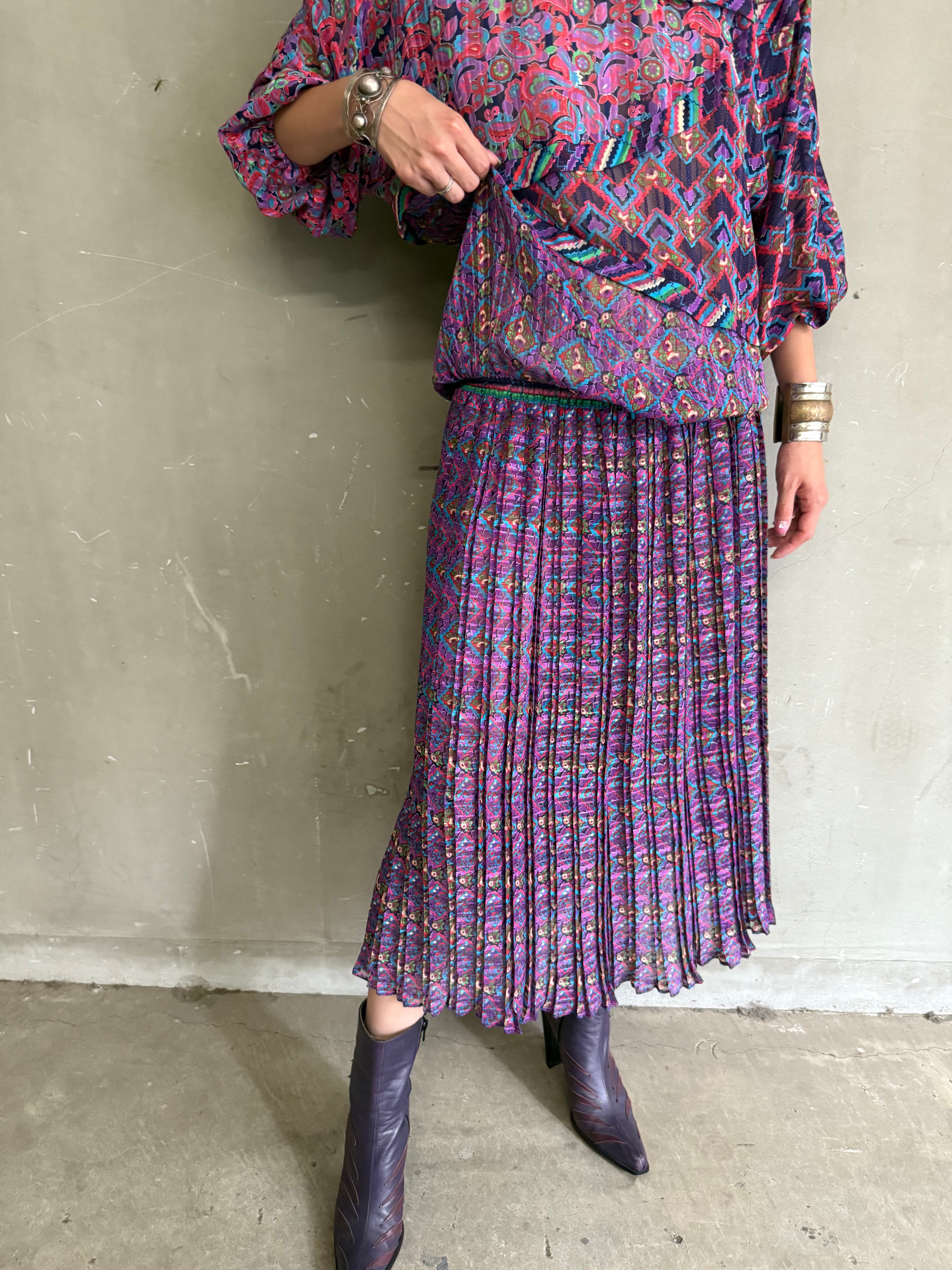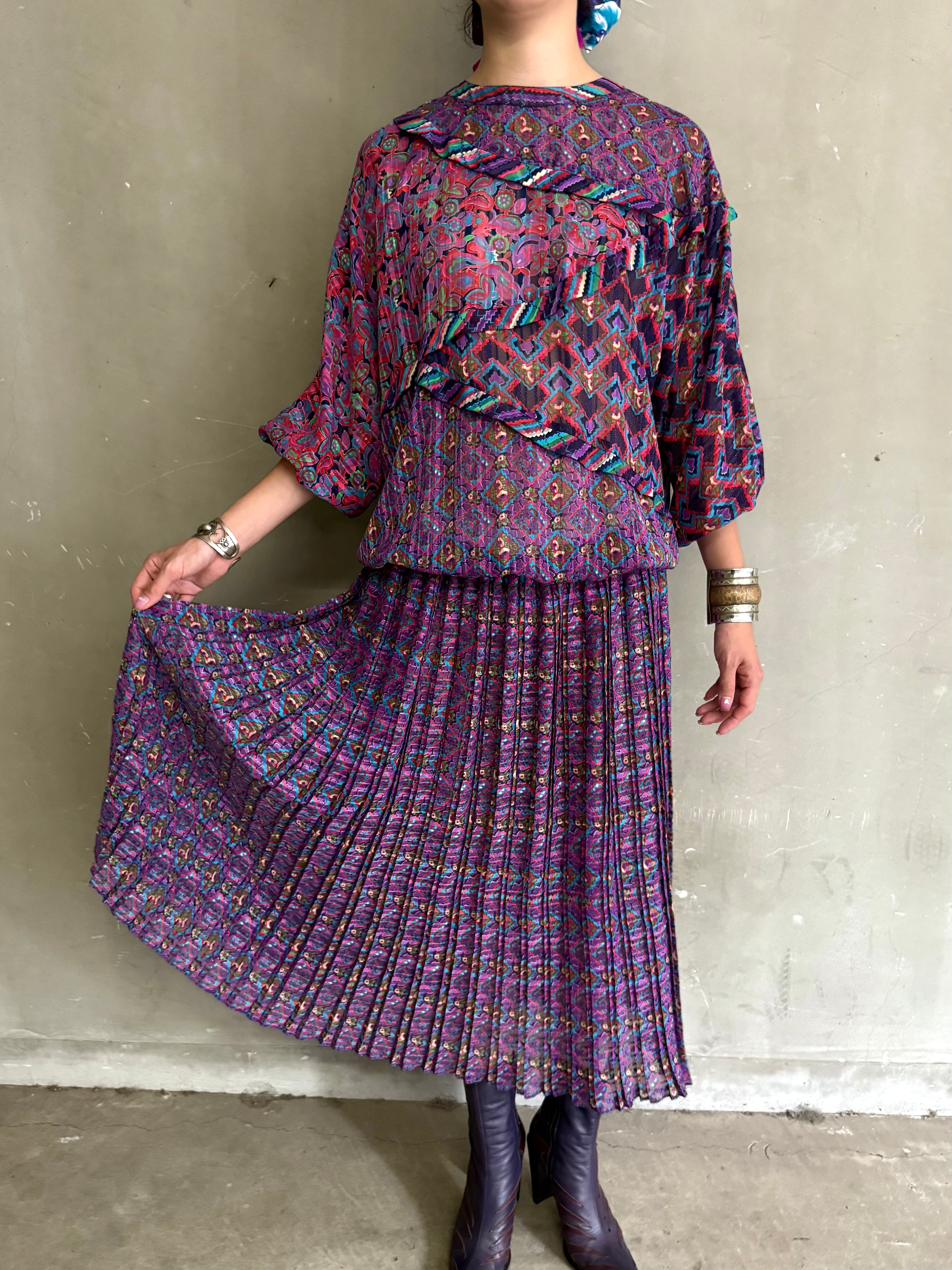 フラワーやジオメトリックプリントがアートに描かれ、プリーツ加工によって生まれる立体を加えることにより、シアーなテキスタイルに印影をプラスし、深みをプラスします。