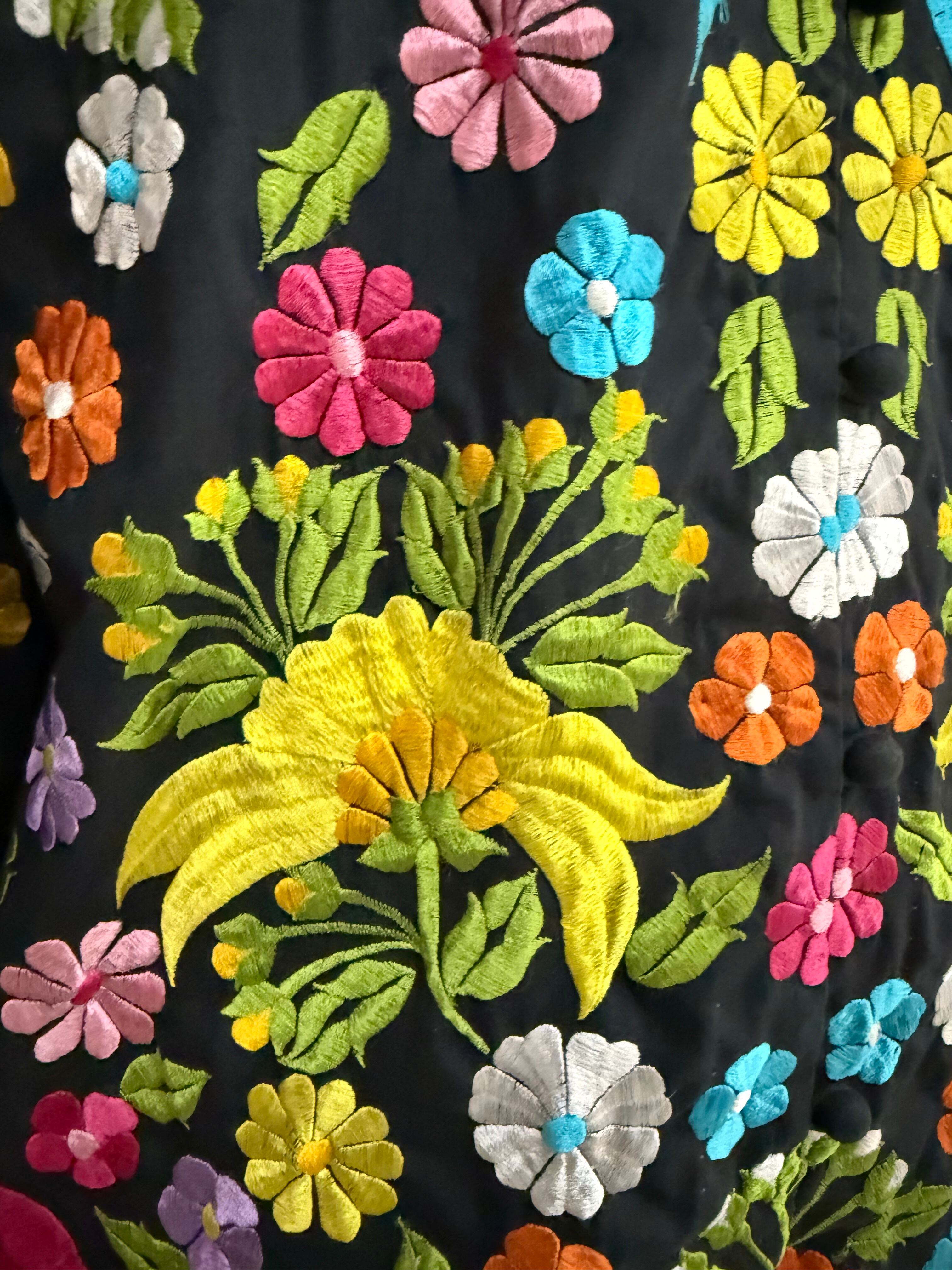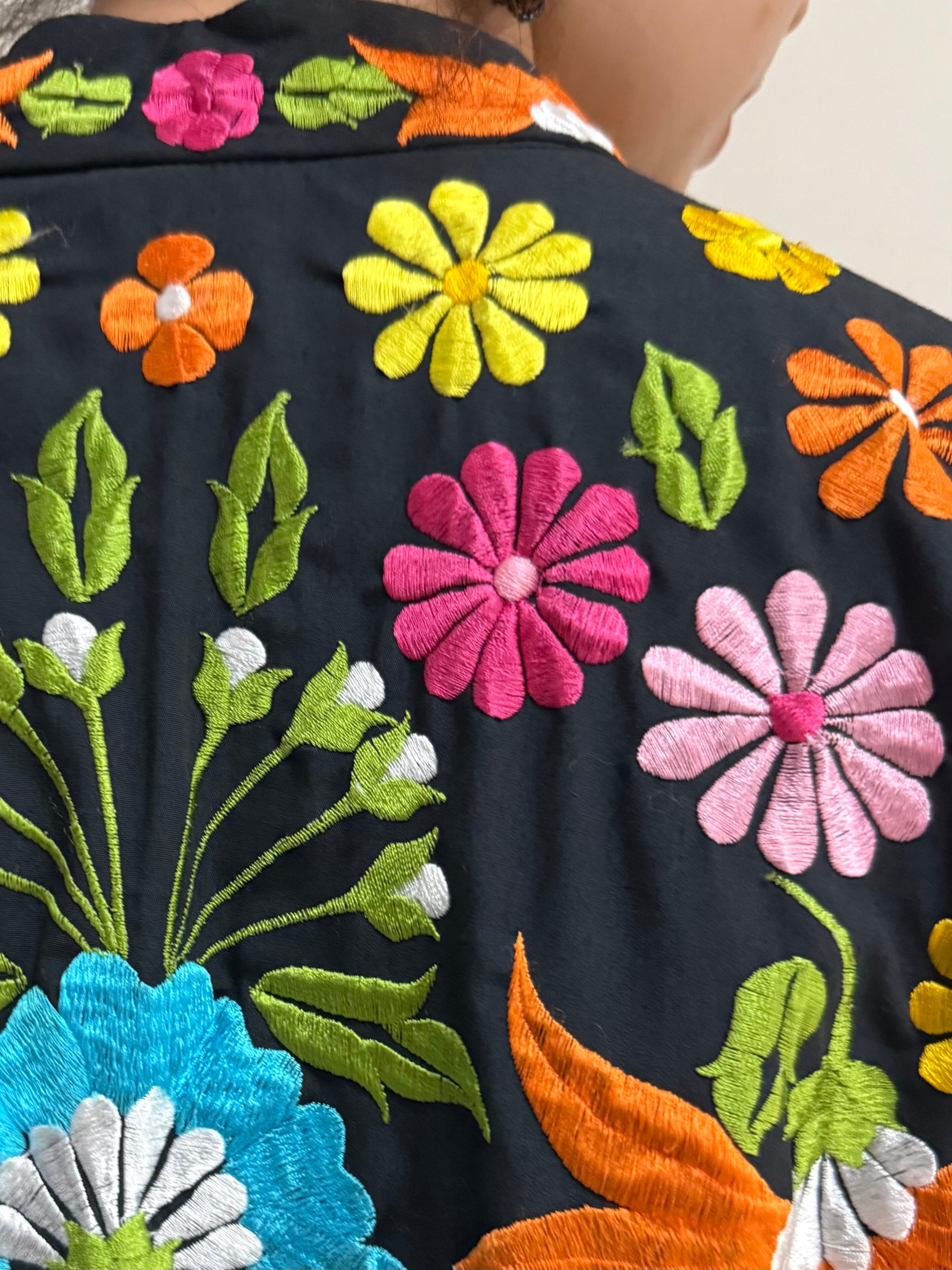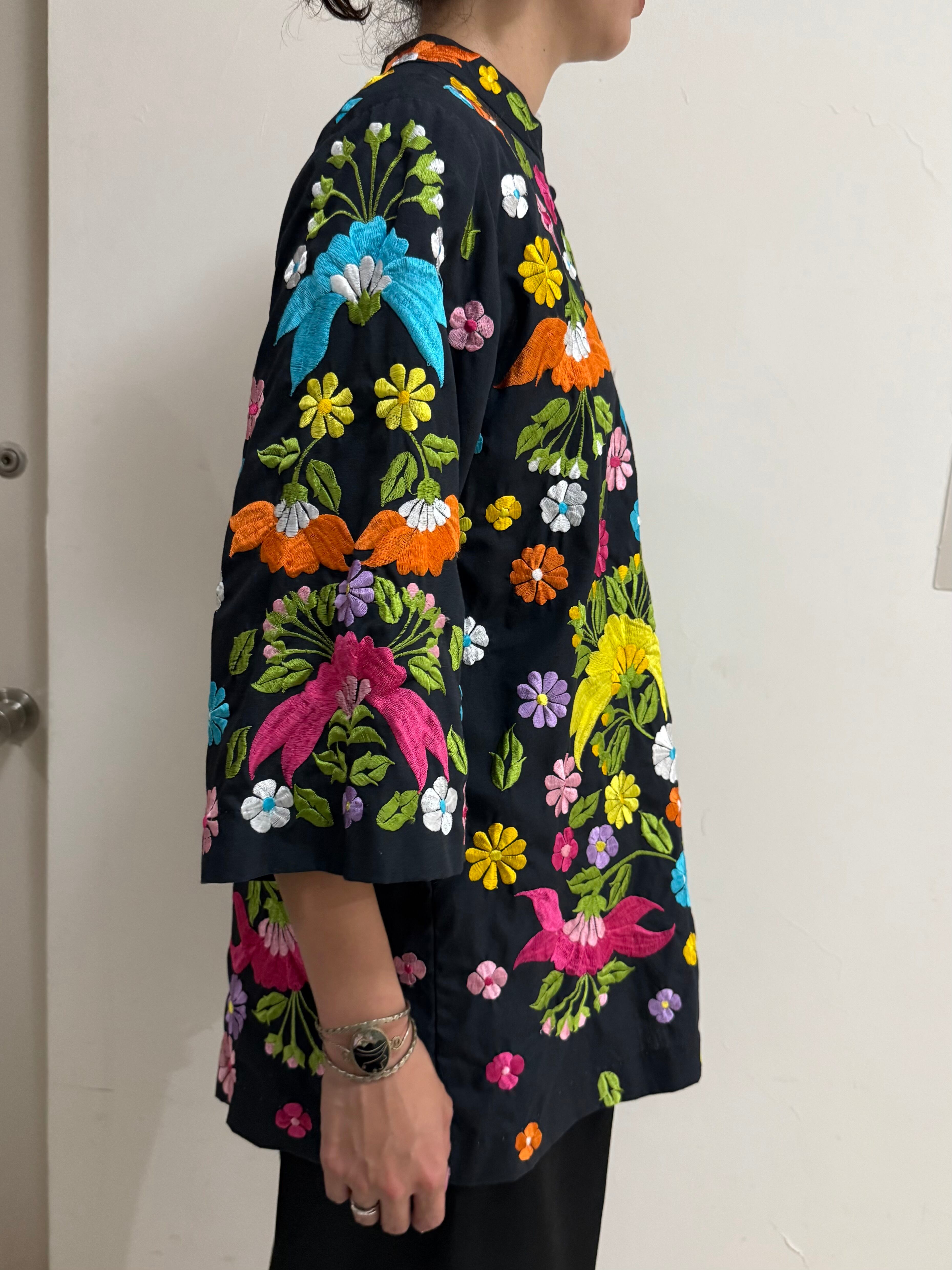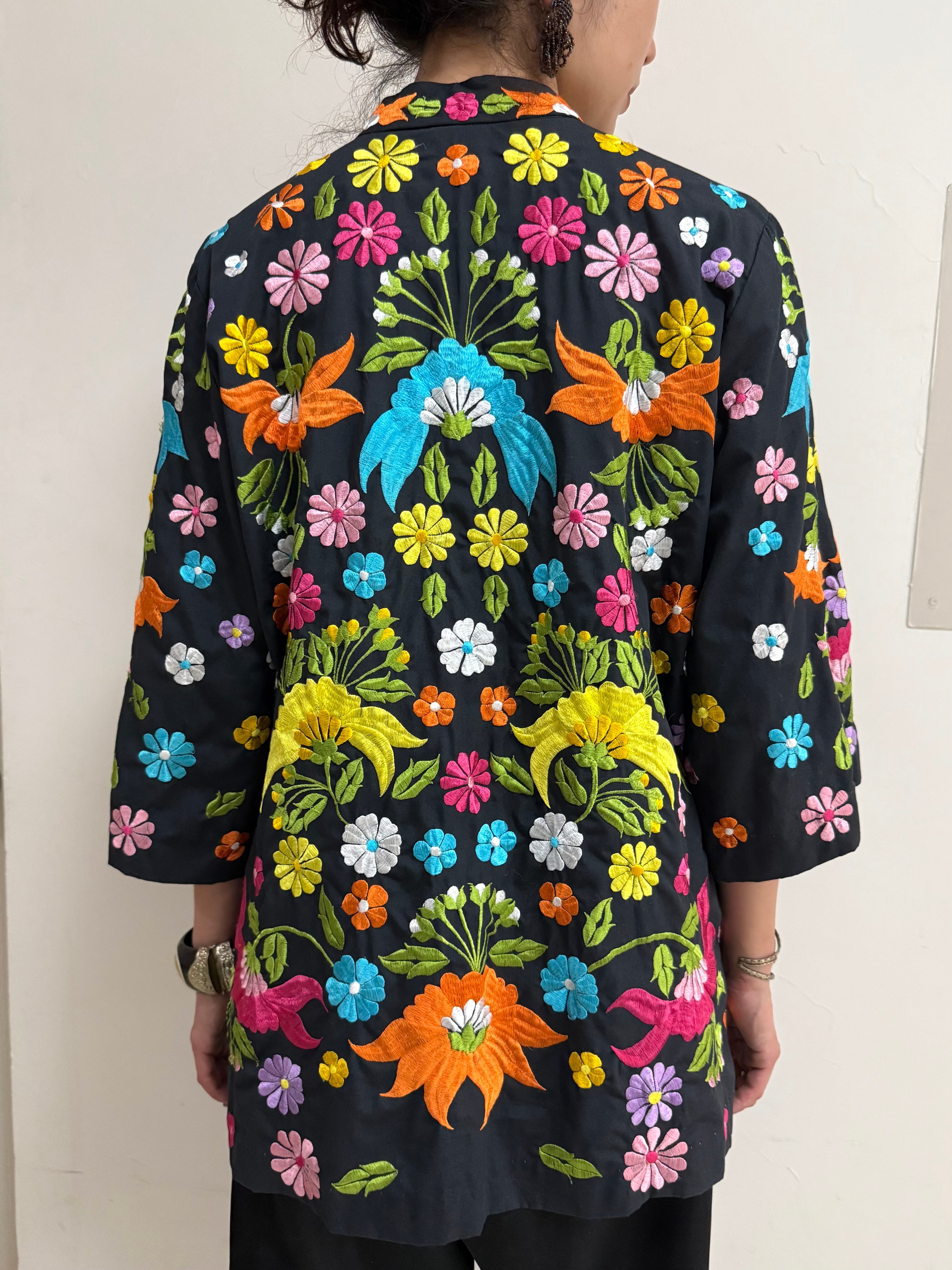 色とりどりの花々を贅沢に密な刺繍で描いた、希少なヴィンテージシャツジャケット。一枚でシャツとして、前を開けて羽織りのようにも使えます。