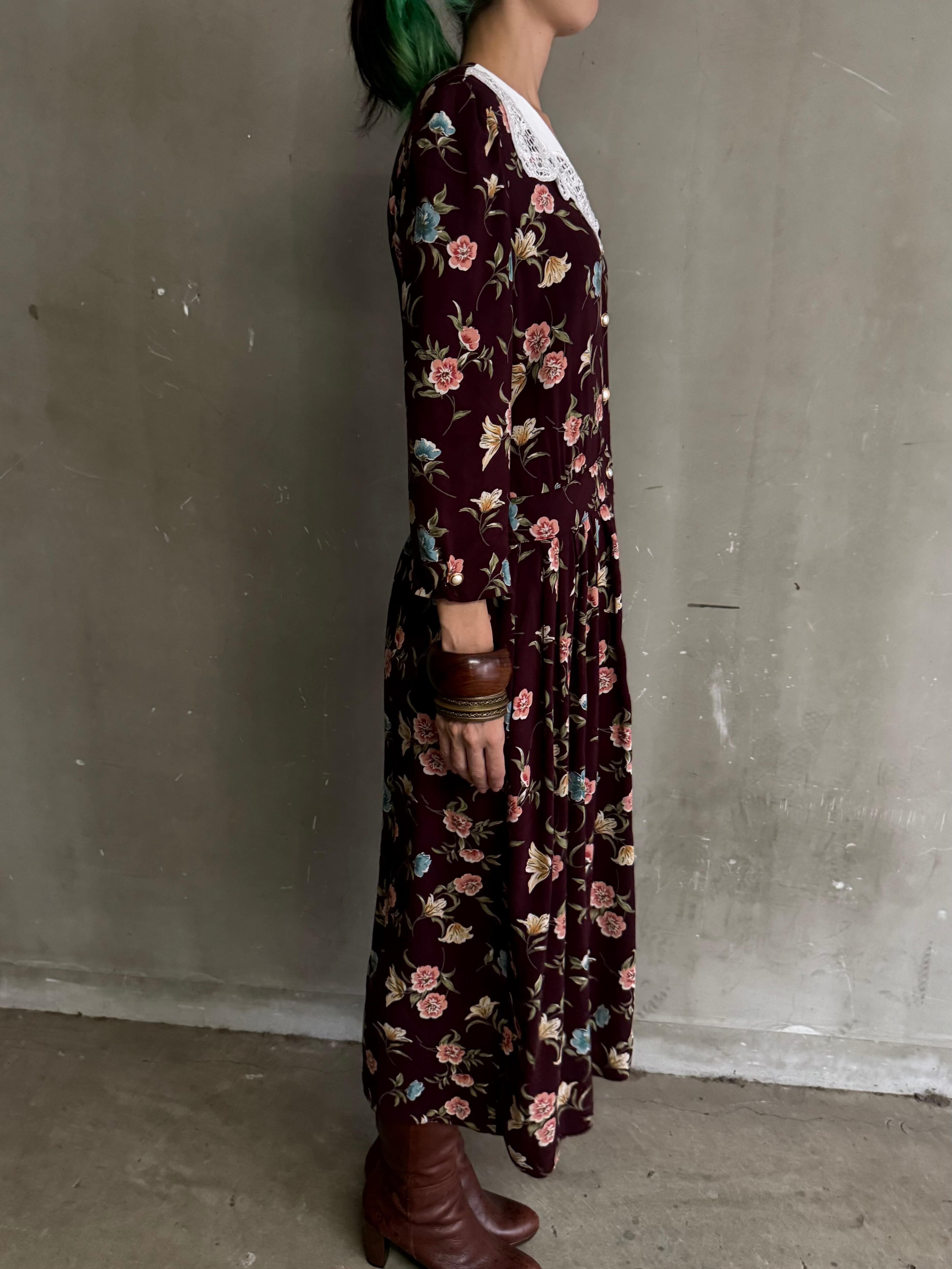 花を散りばめたプリントに、主役と言えそうなほどのクラシックなレース襟に加え、ゴールドボタンも美しくこのワンピースを盛り上げます。