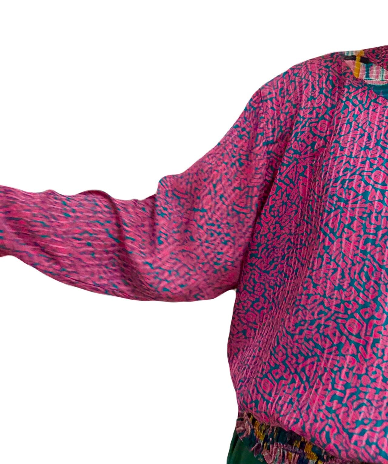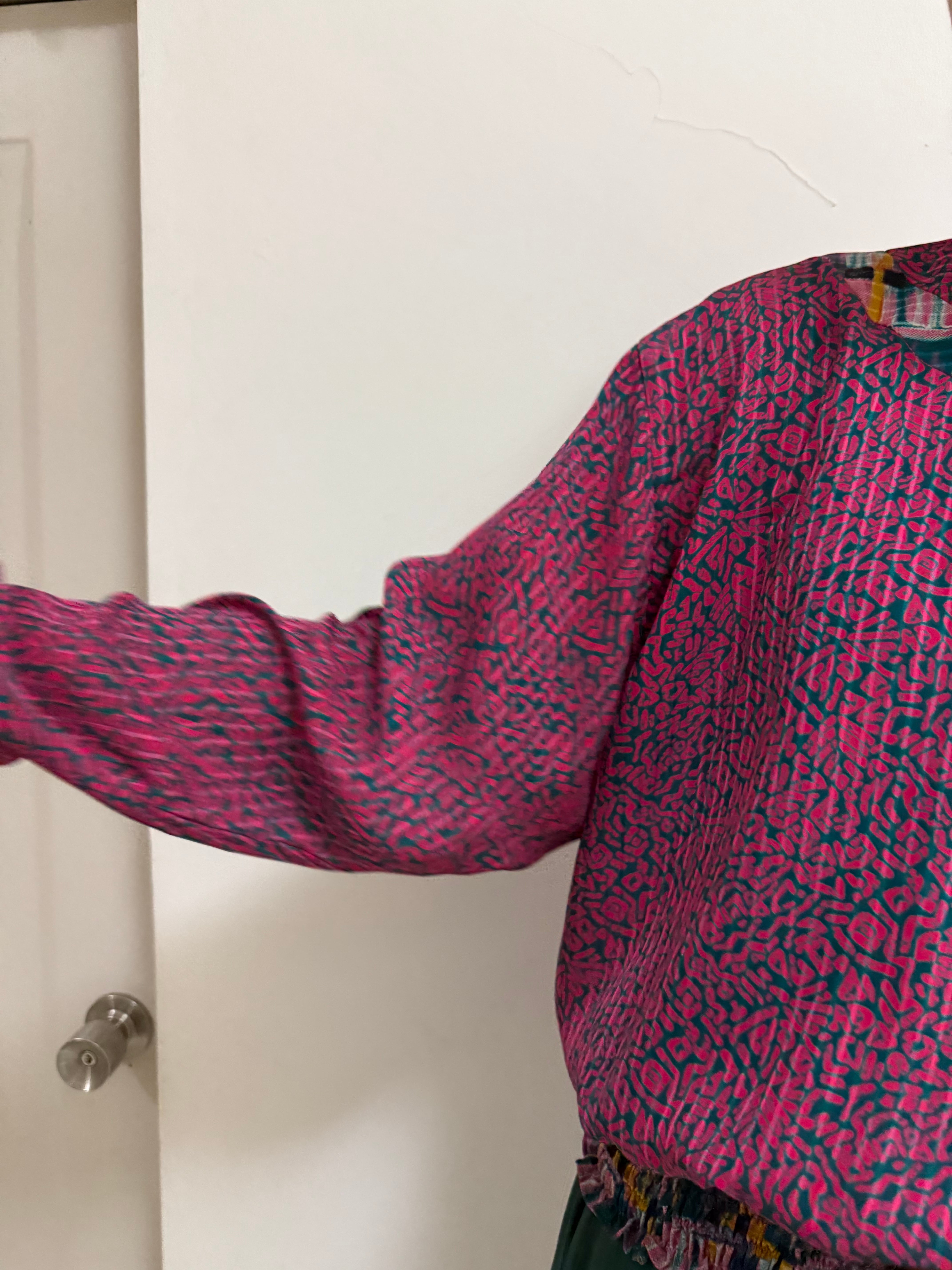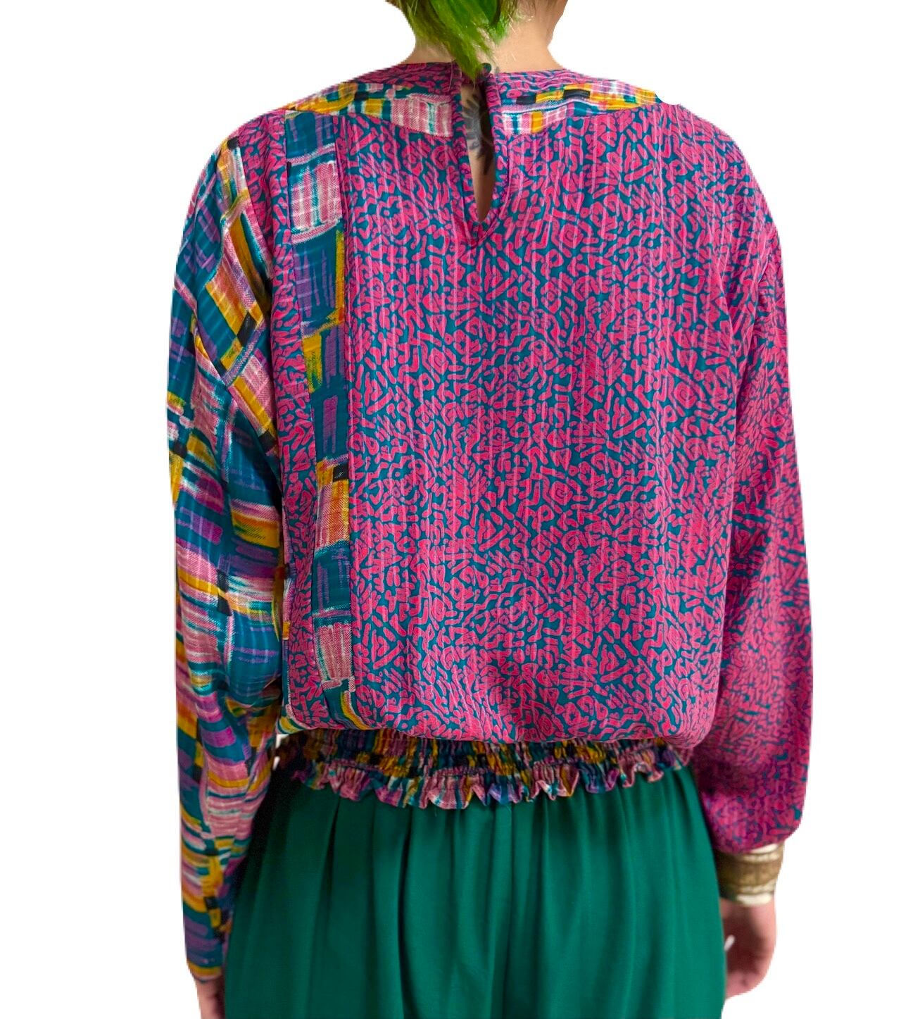 アブストラクトアートを見ているようなSusan Freisのプルオーバー。生地合わせのコントラストとアシンメトリーなデザインは 見た目にも変化があり、とても素敵です。