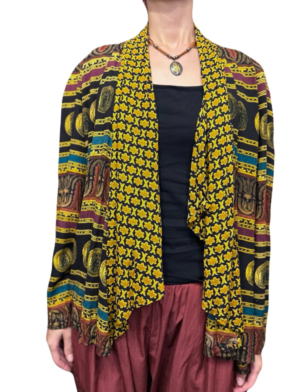 古代の貨幣や建築様式がプリントが組み合わされたユニークなオープンジャケット。ブラックベースなのでシックな雰囲気があり、合わせやすいです。