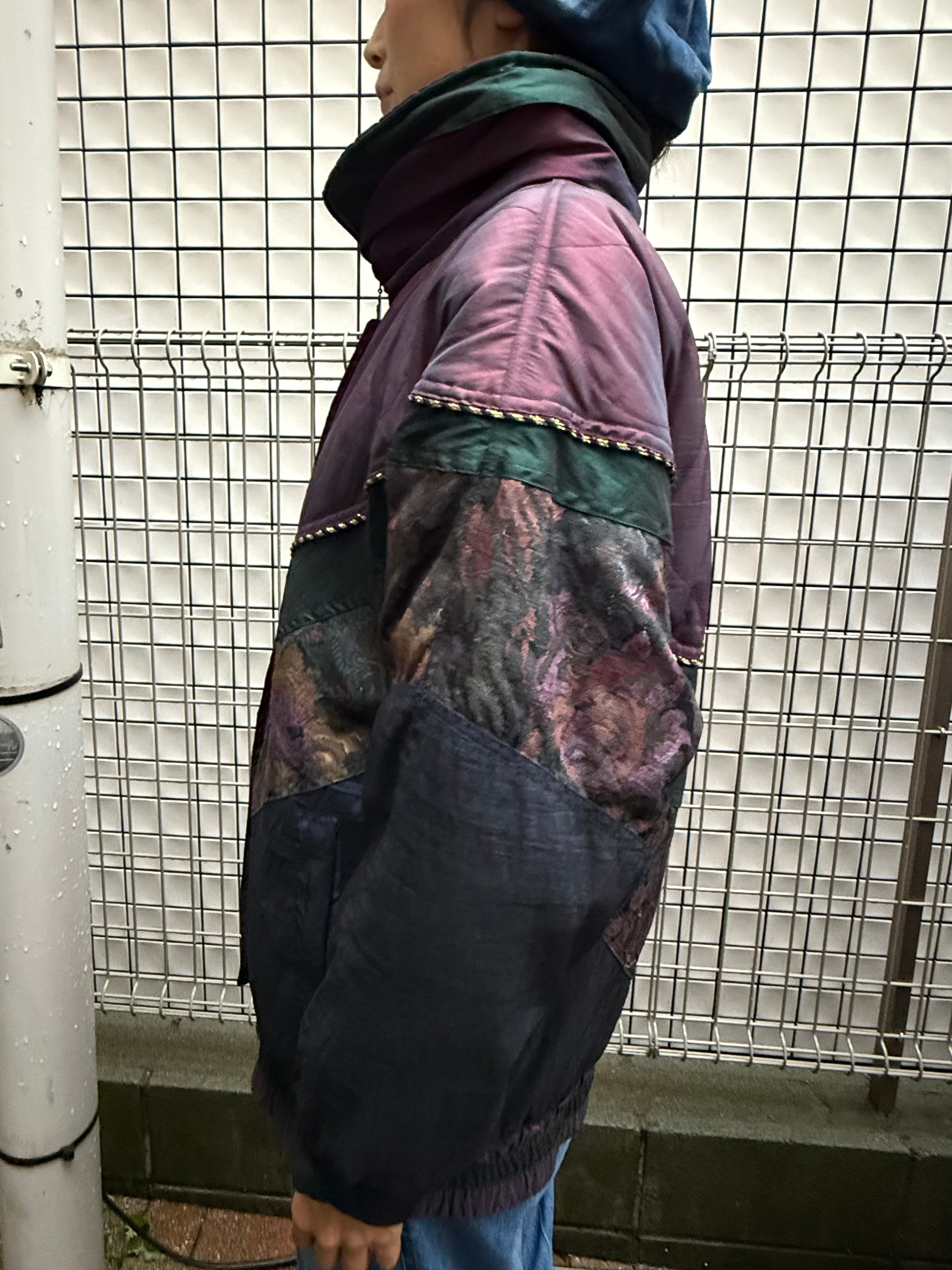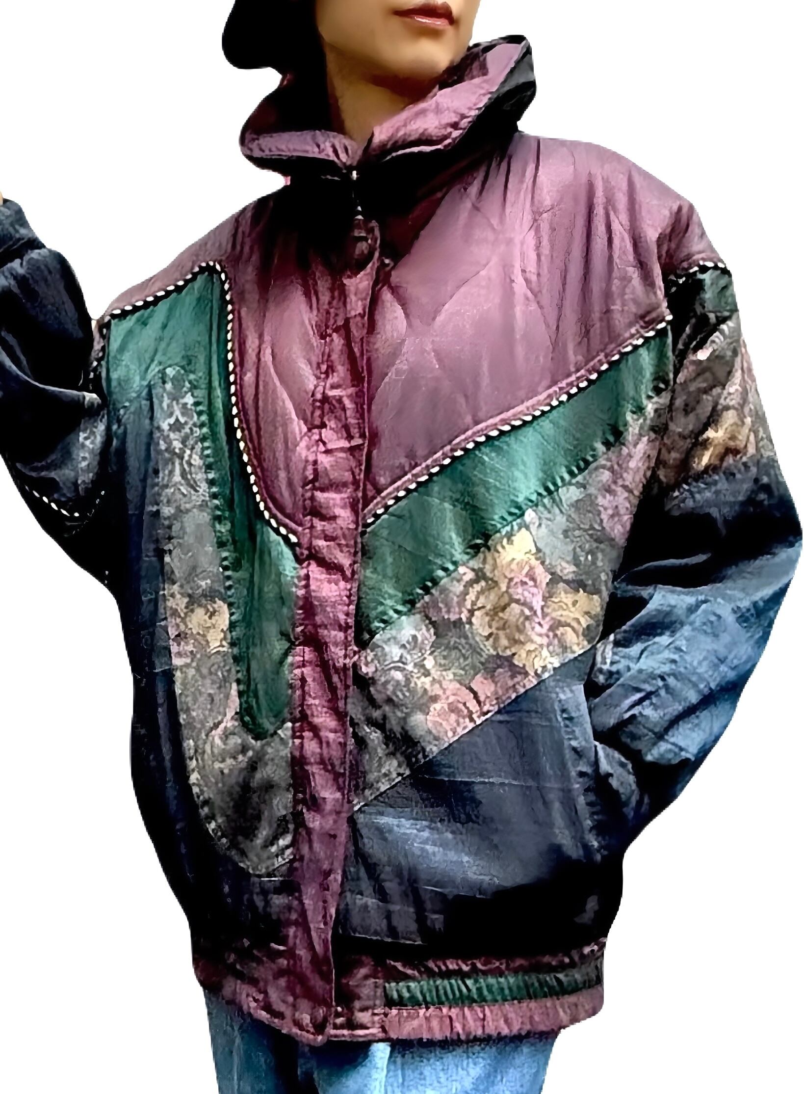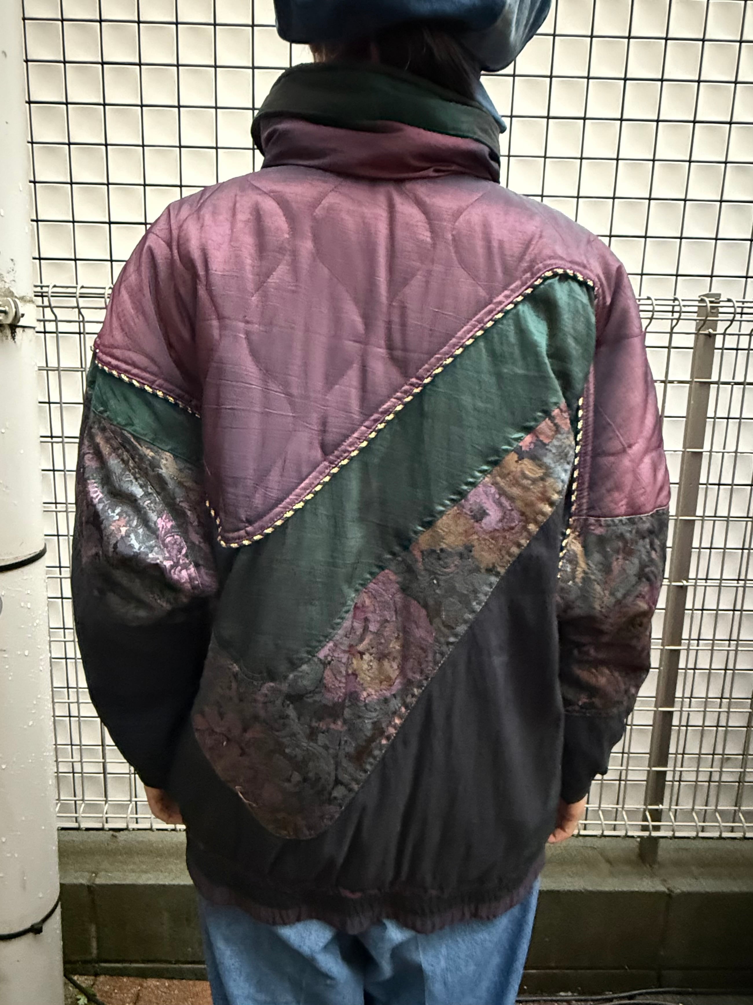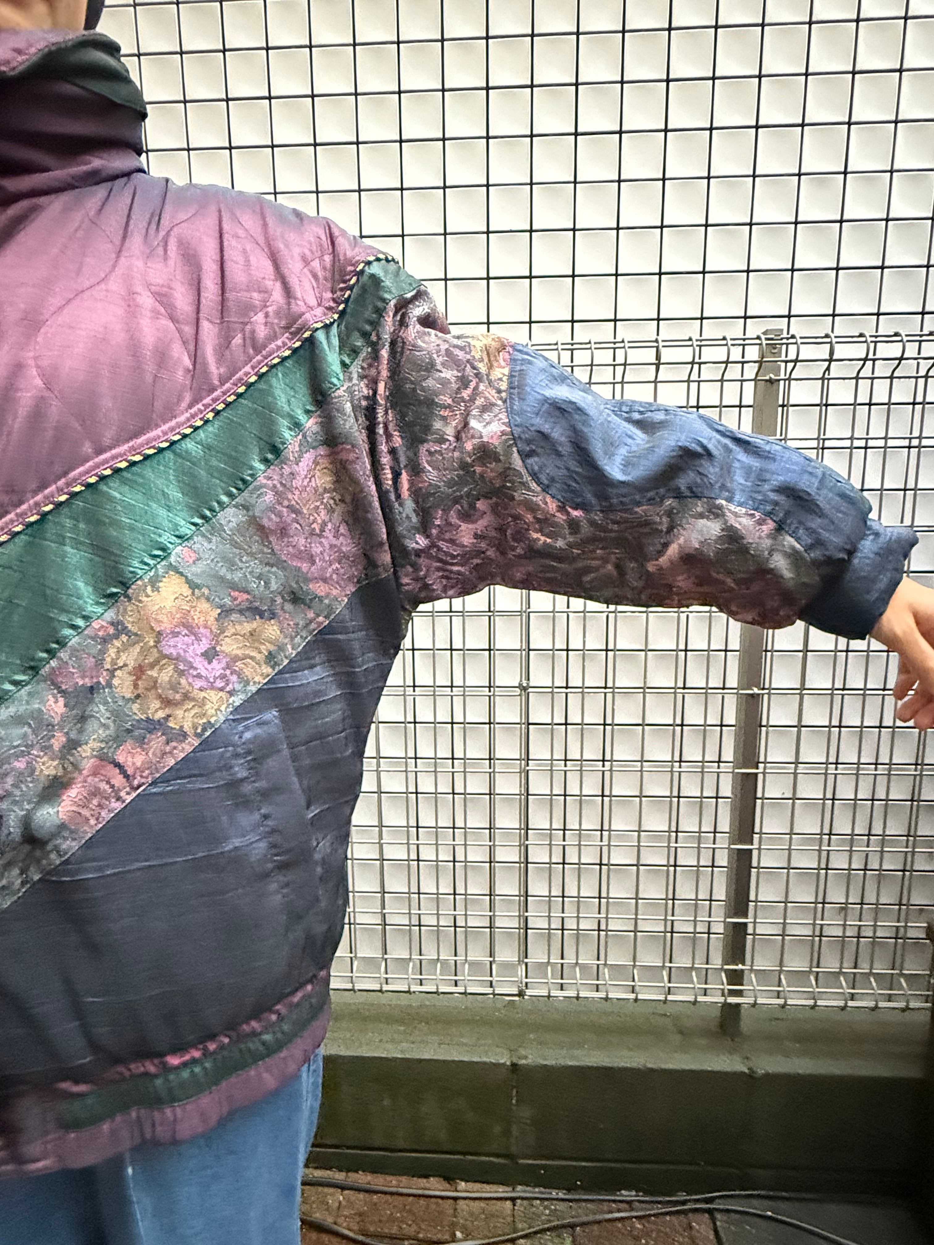 深みのある色合いと優しい光沢のソリッドカラーテキスタイルに、クラシックフローラルをミックス。80’sらしさとクラシックさが融合した中綿入りジャケット。