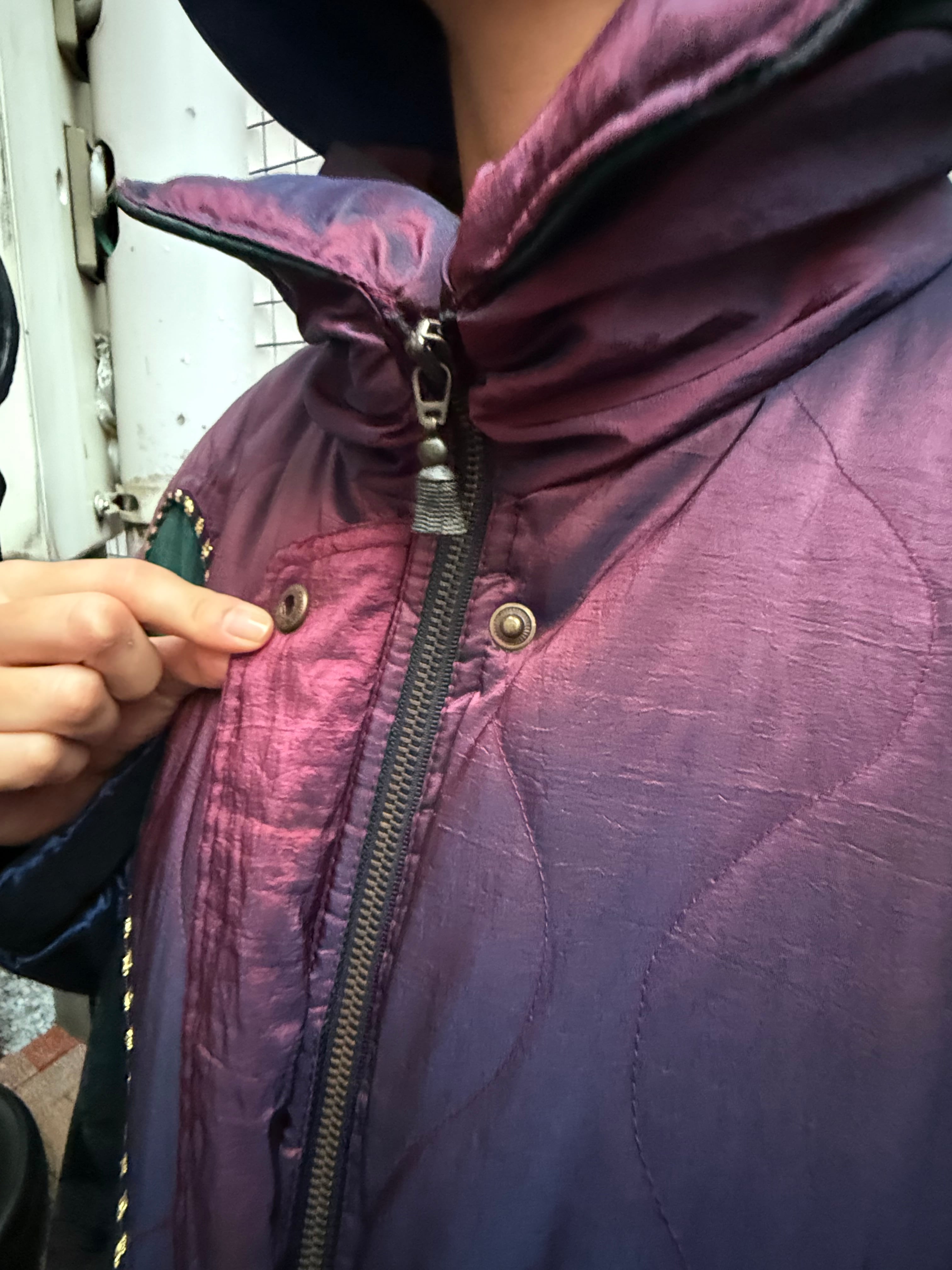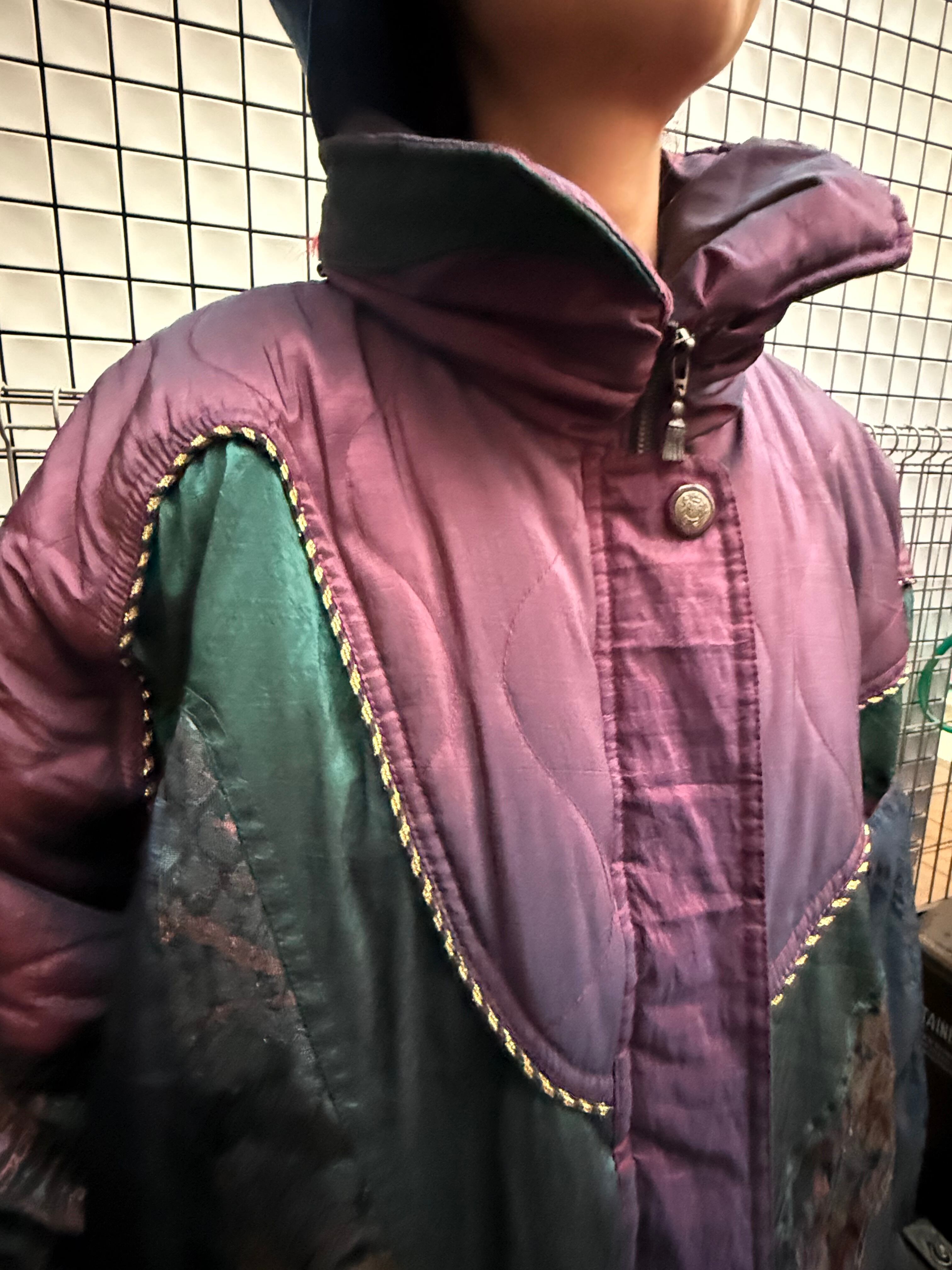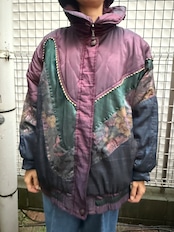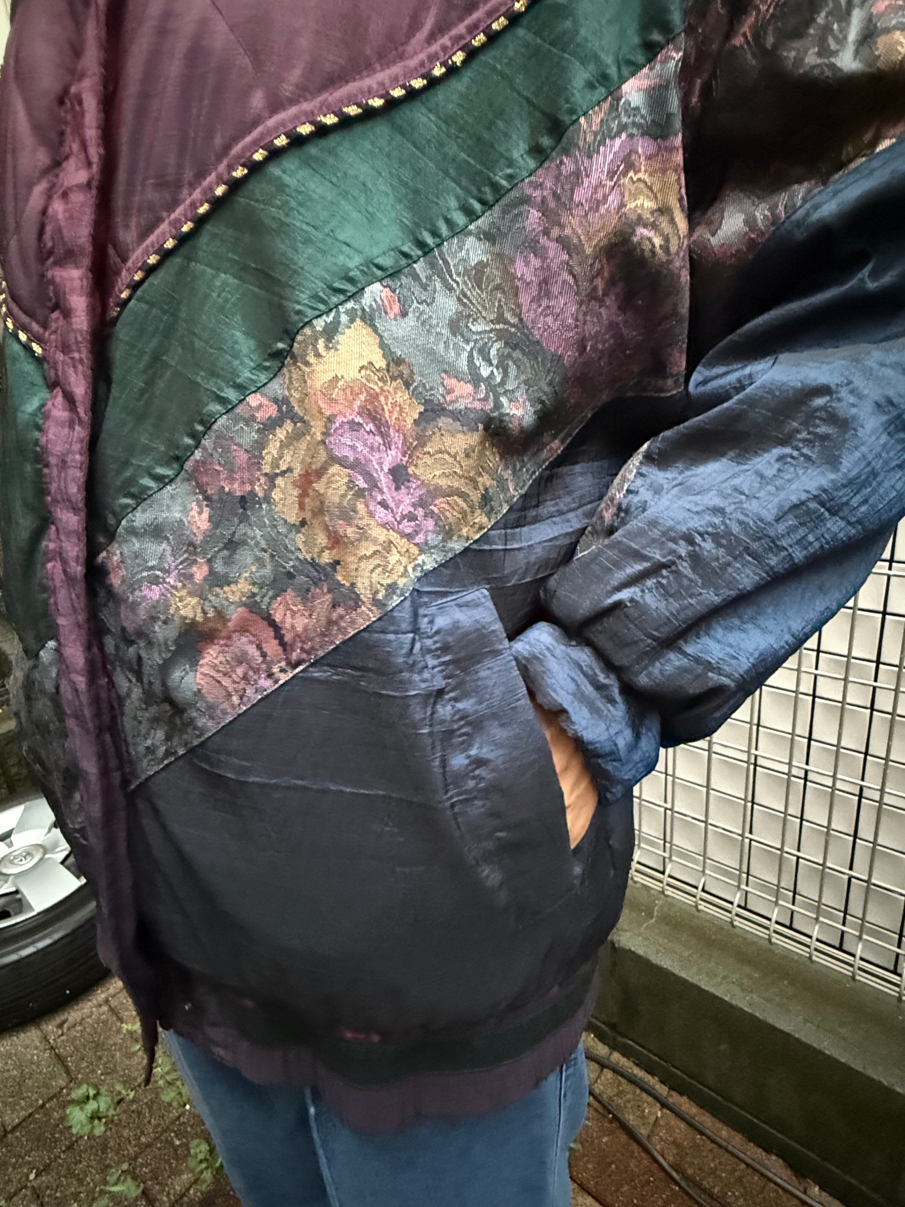 深みのある色合いと優しい光沢のソリッドカラーテキスタイルに、クラシックフローラルをミックス。80’sらしさとクラシックさが融合した中綿入りジャケット。
