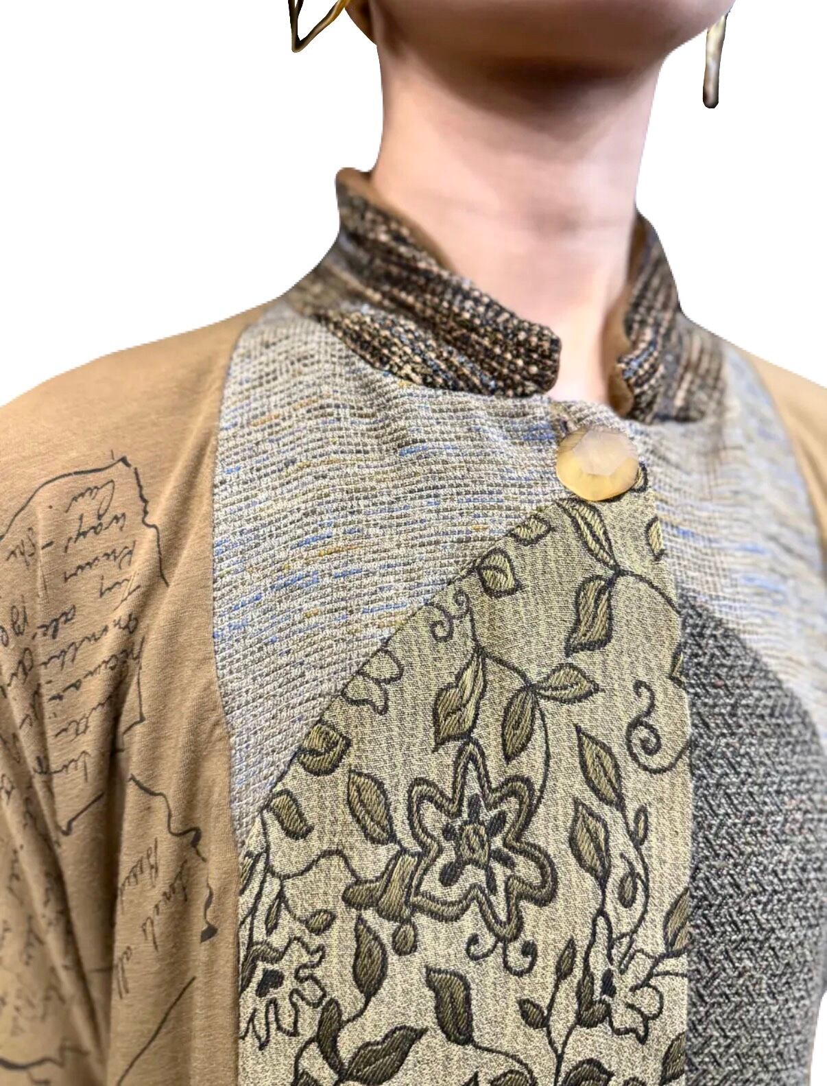 レタリングプリントされた肌触りの良いレーヨン生地と、上品なジャカードのパッチワークが、趣きのある風合いに仕上げられた一枚。控えめなボリュームのスタンドカラーは、季節の境目のアウターにも冬のインナーにも最適です。