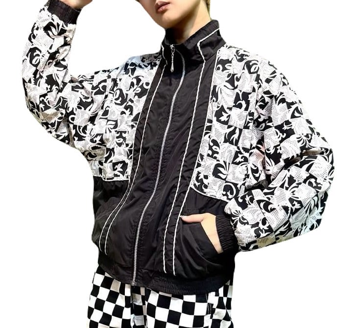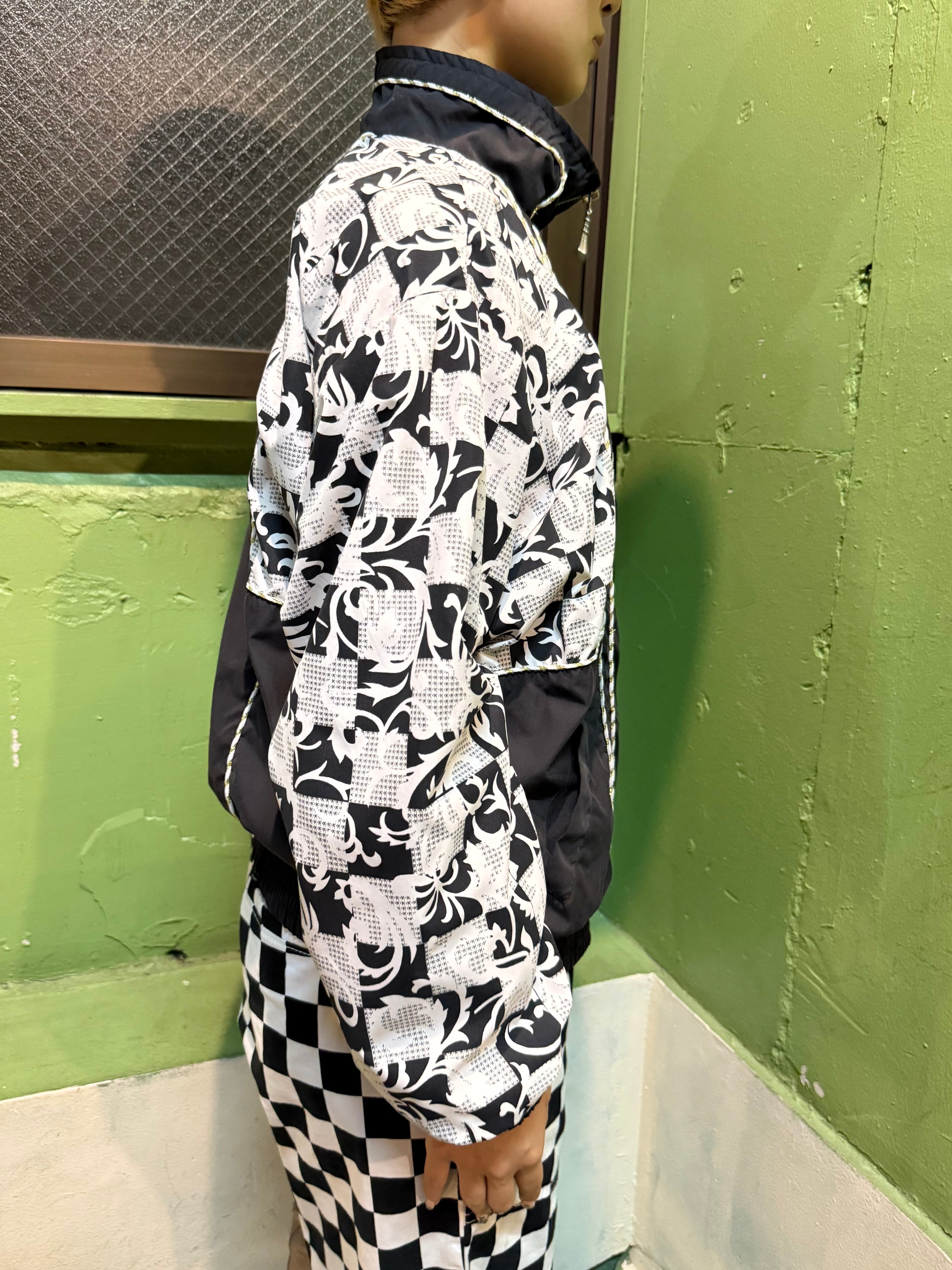 ブラック&ホワイトのクールなチェッカー柄に重ねるように描かれたクラシックなリーフ柄。ソリッドブラックとのバランスも絶妙で、センスの良さを感じさせるヴィンテージブルゾン。
