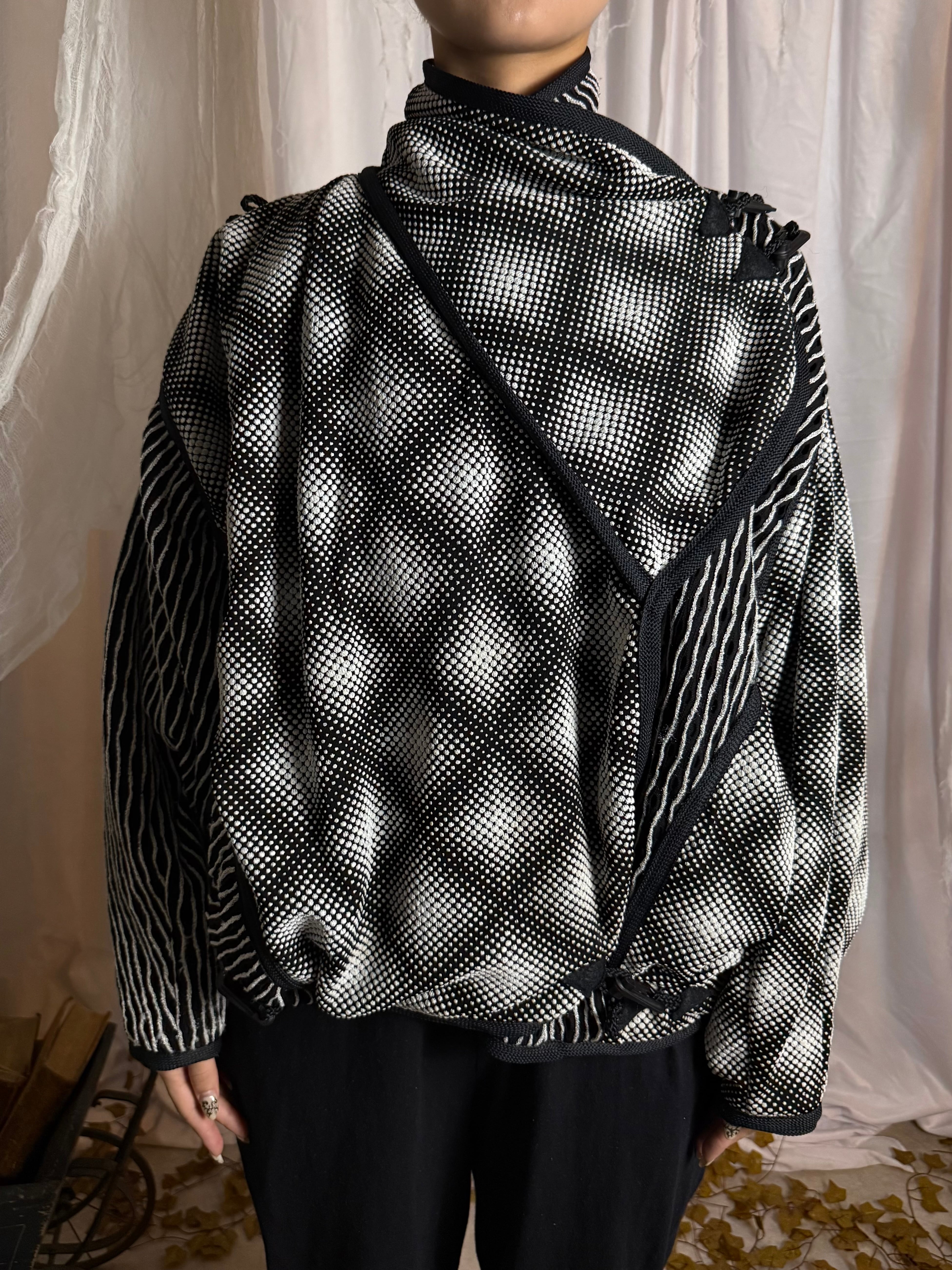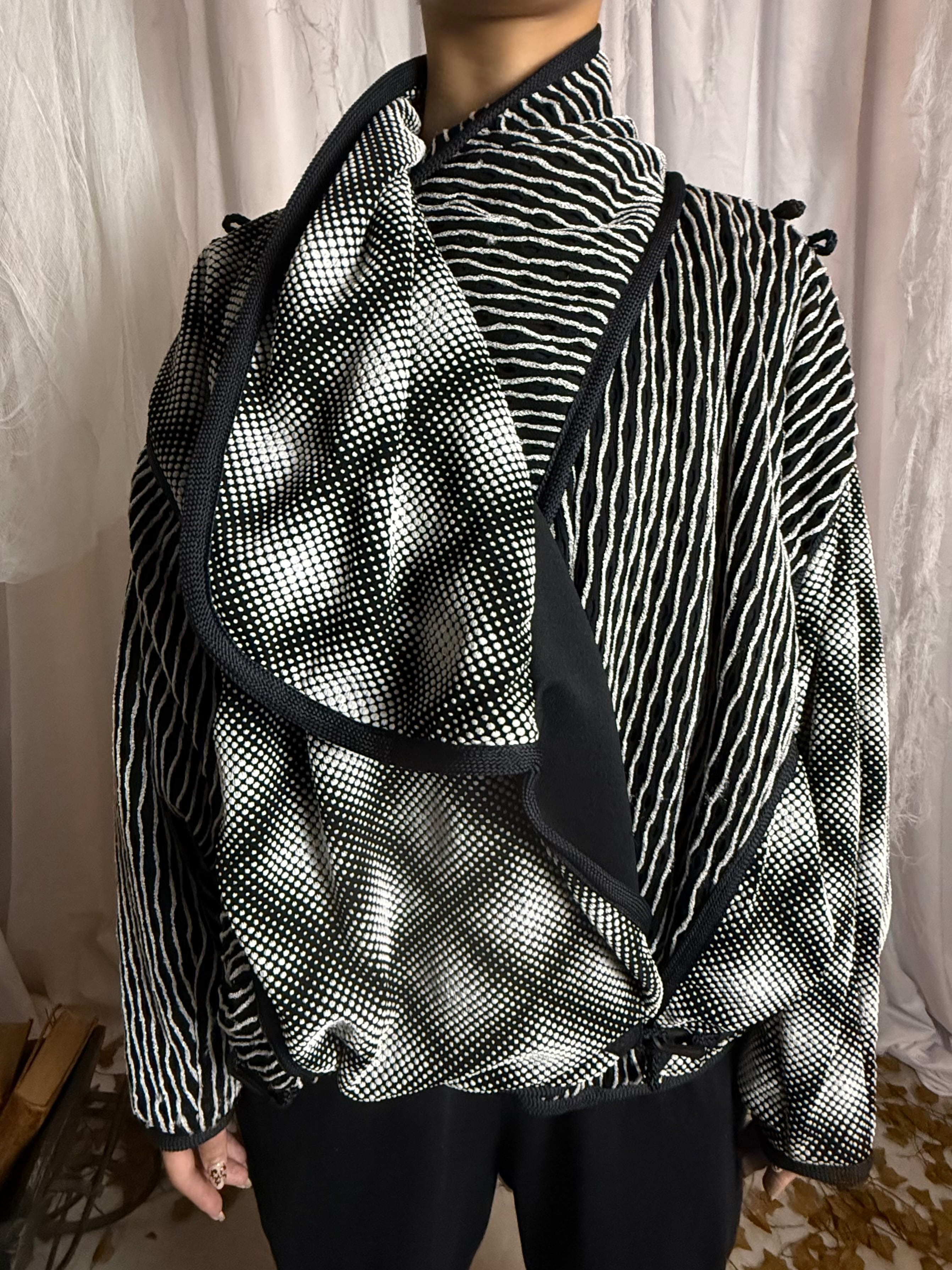 80’sアバンギャルドなデザインが目を惹くテキスタイル。ユニークなシルエットのモノトーンデザインジャケット。