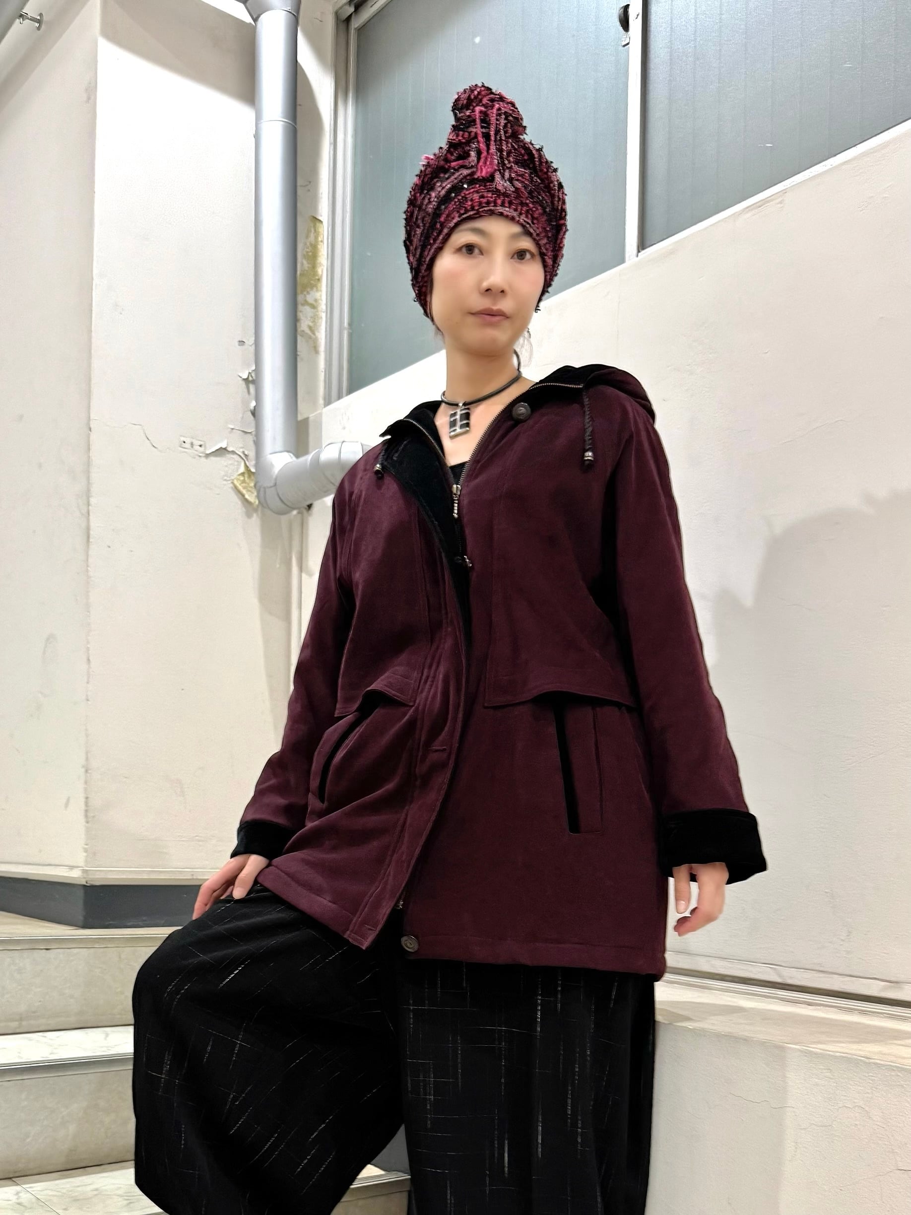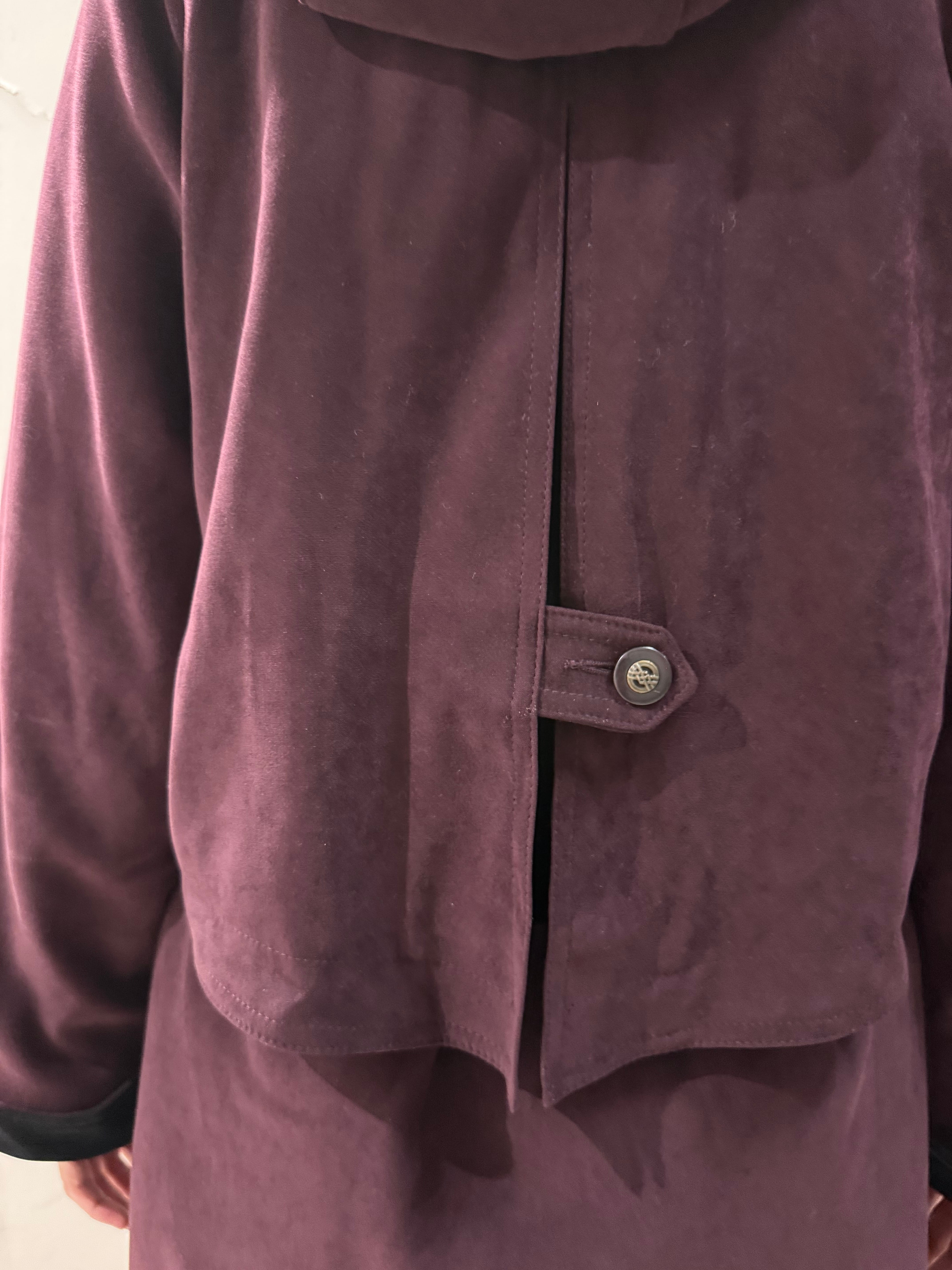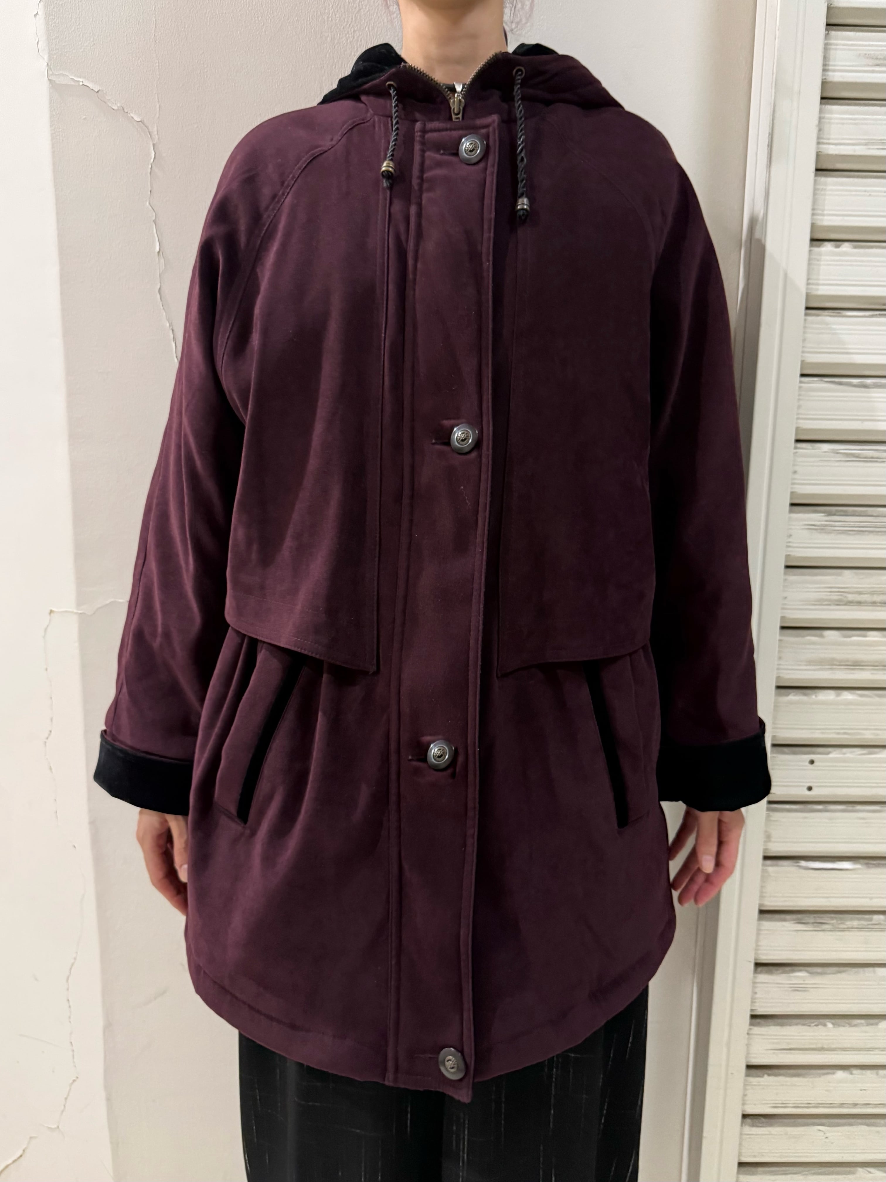 秋冬の乾いた空気に美しく馴染むワインレッド。深みのあるブラックベルベットをアクセントにした フード付きロングブルゾン。