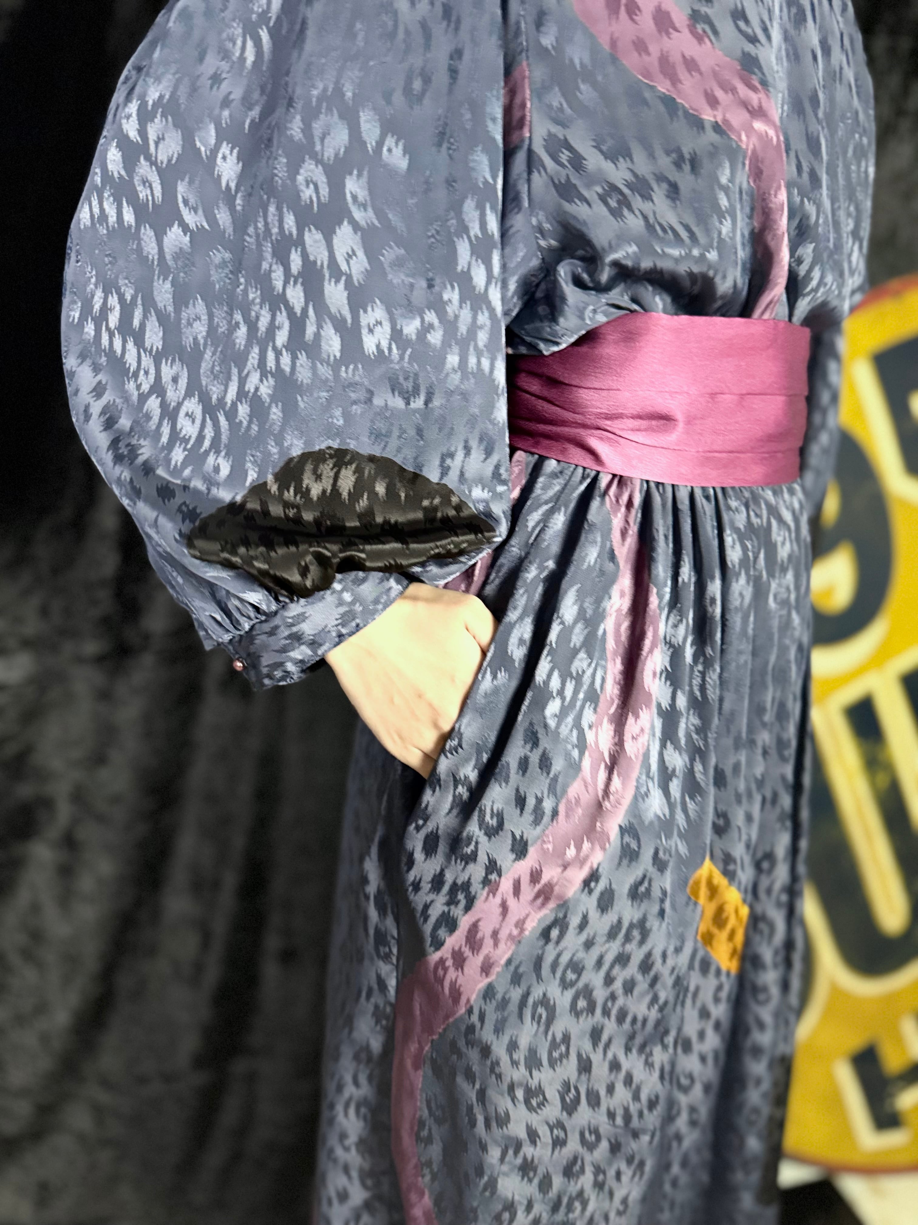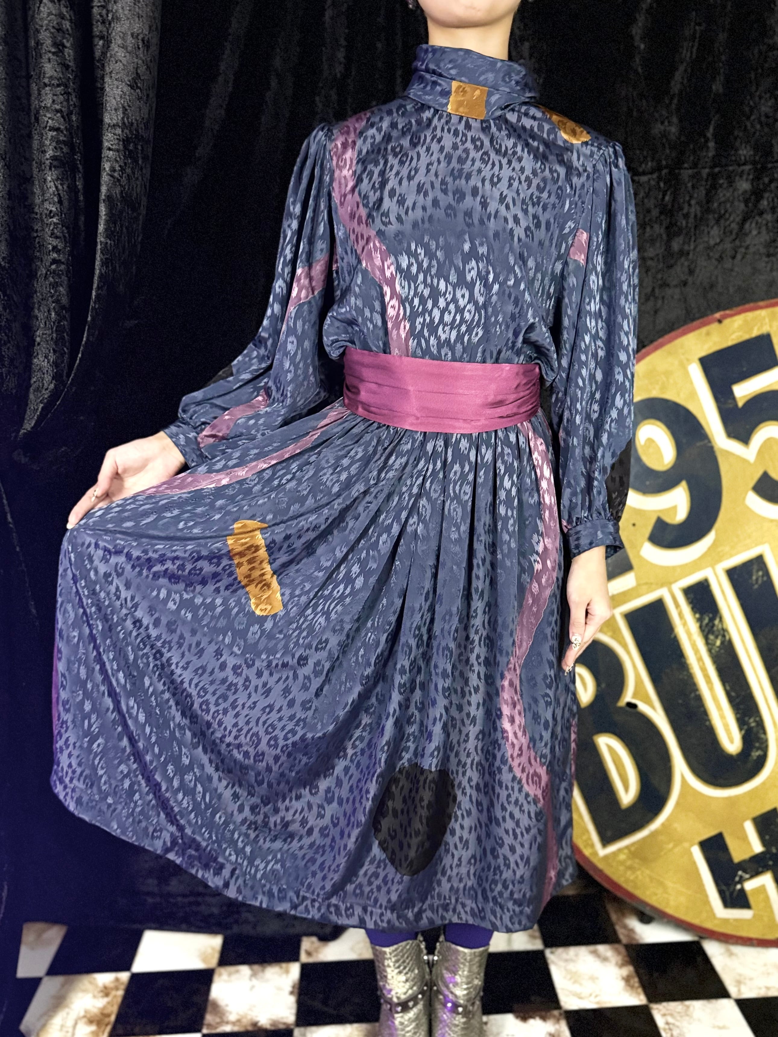 80’sらしいニュアンスカラーによるジオメトリックアートと、レオパードのシルク織柄生地で、完璧なまでの芸術的なデザインです。