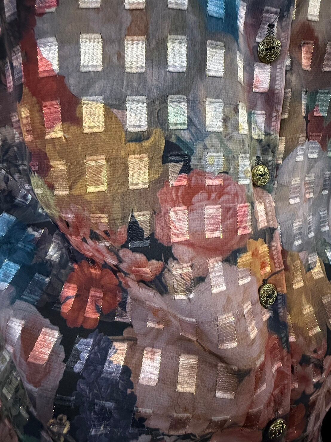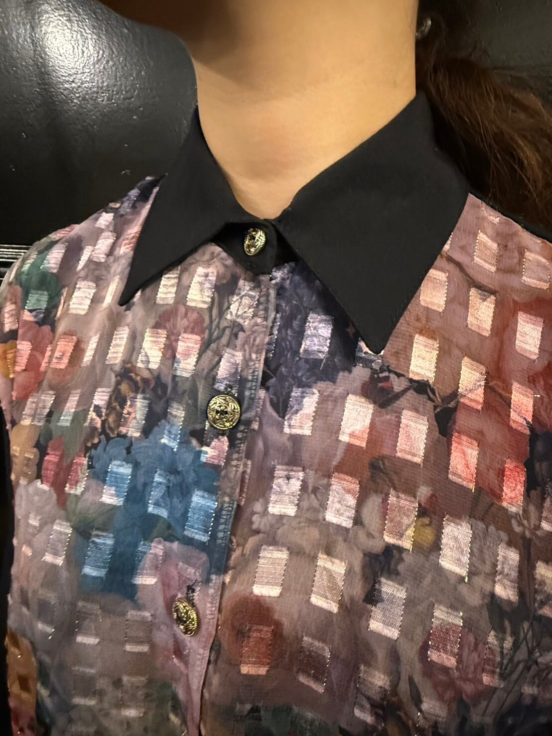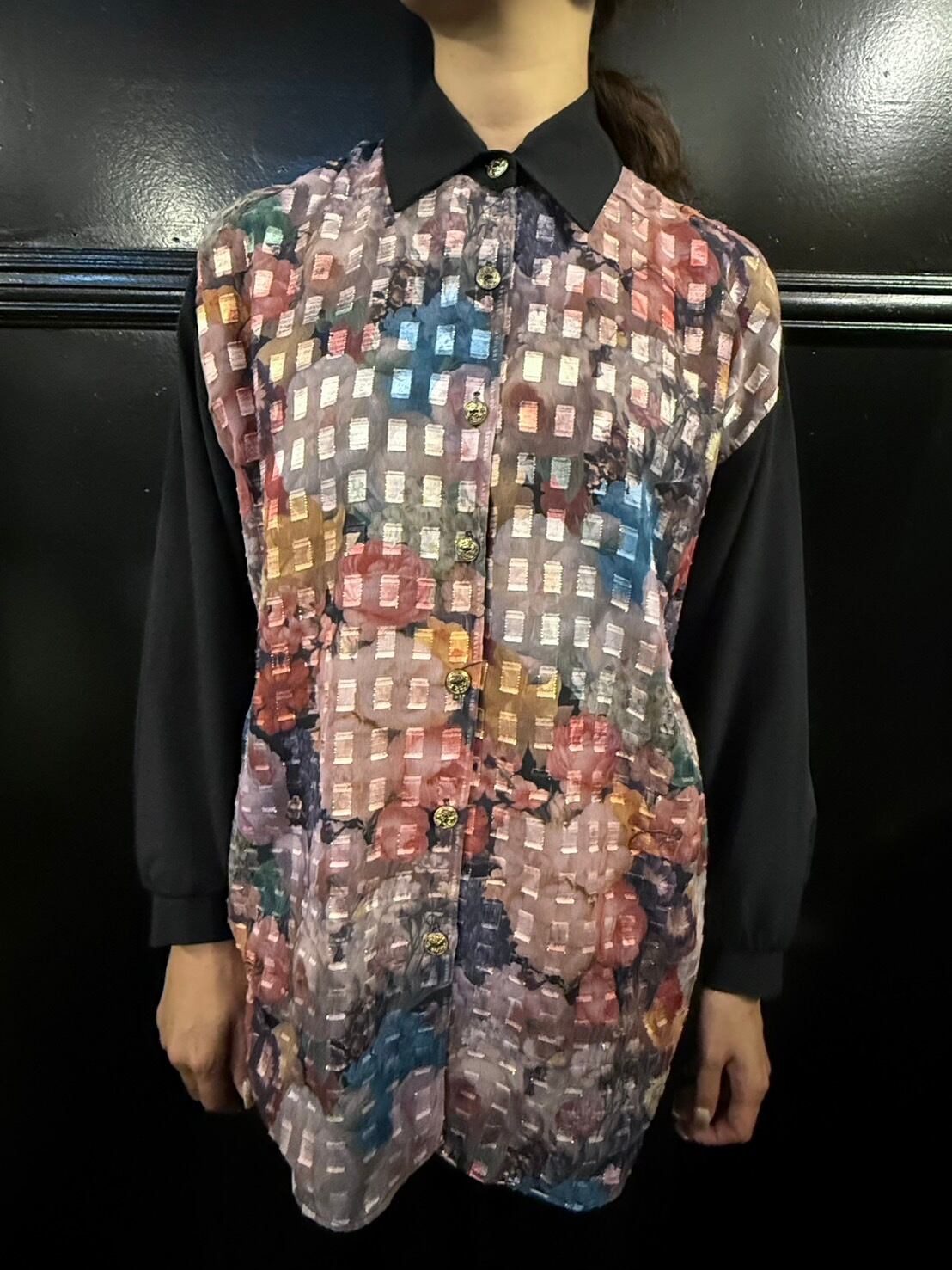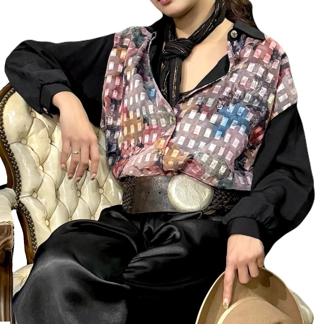 ブラックとのコントラストで、フラワープリントがより華やかに美しく広がり、幻想的でアーティスティックな雰囲気。織柄の光沢を視覚的にモザイクのようにみせた、ユニークなヴィンテージデザインシャツ。