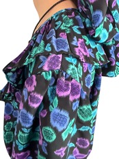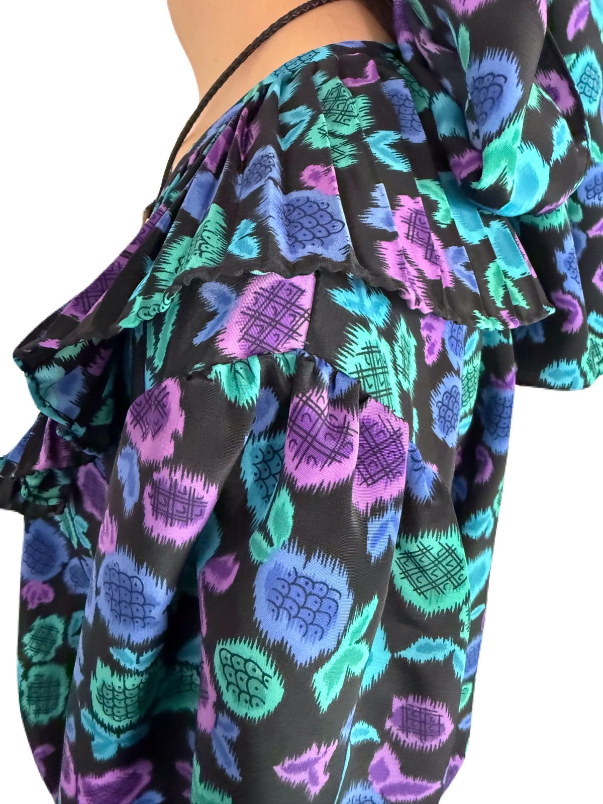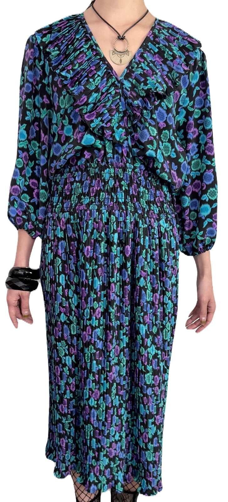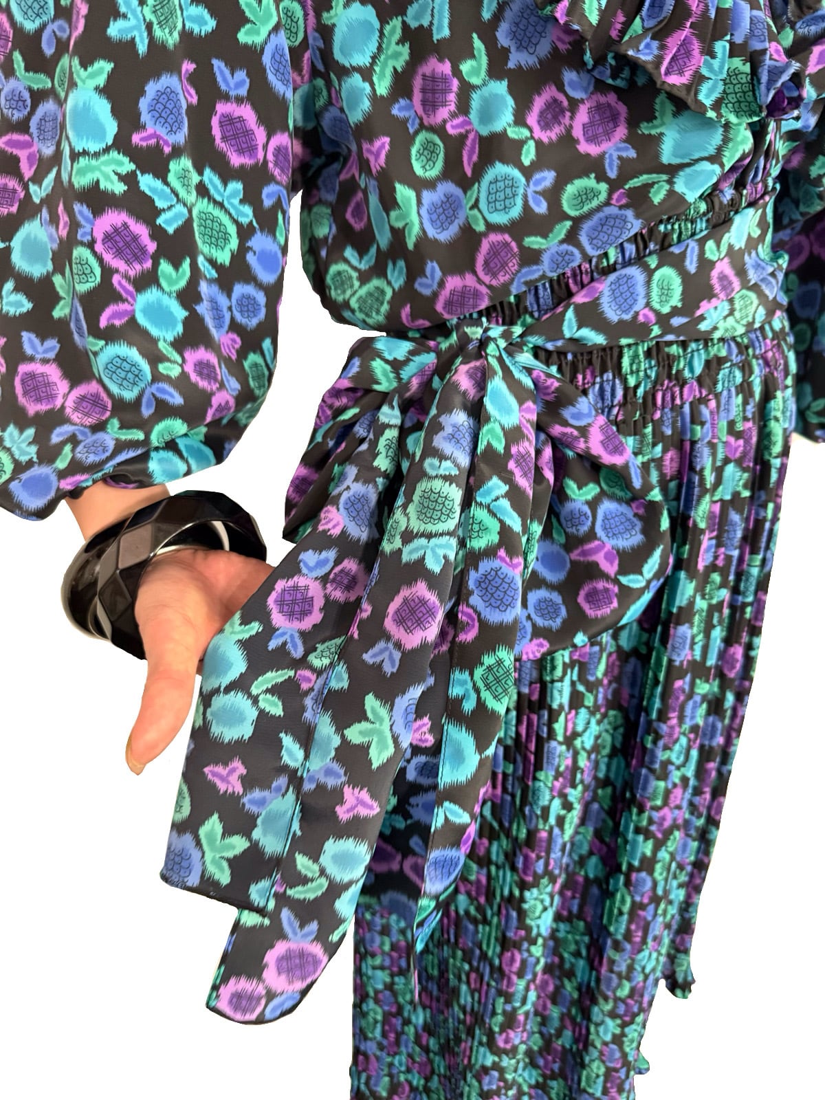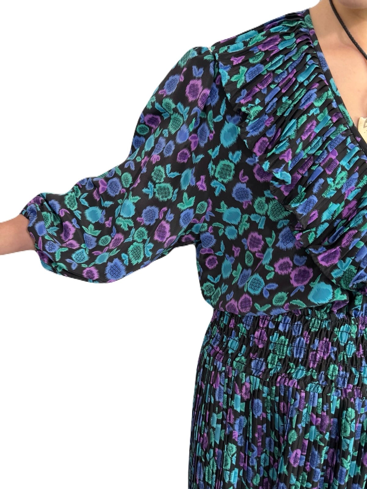 花の蕾にも果物のようにも見えるユニークなテキスタイル。希少な共布ストールつきの 80’s Susan Freisのワンピース。