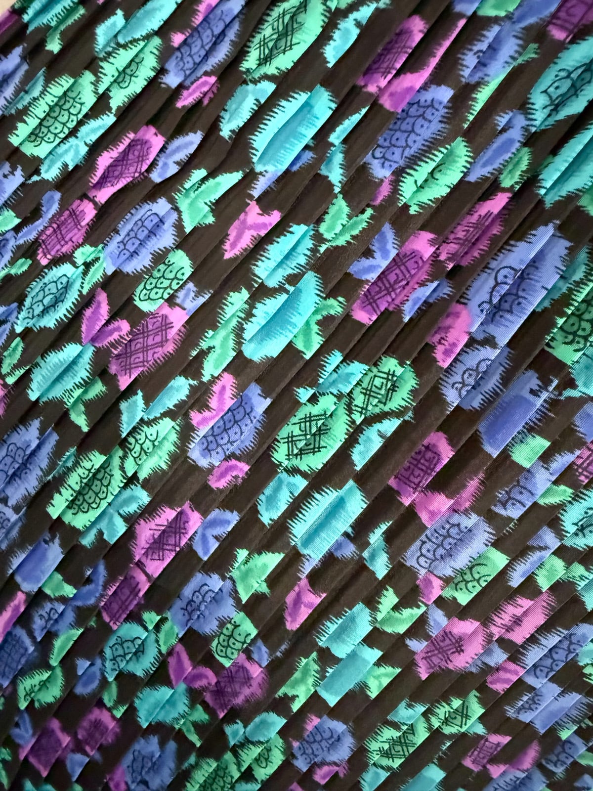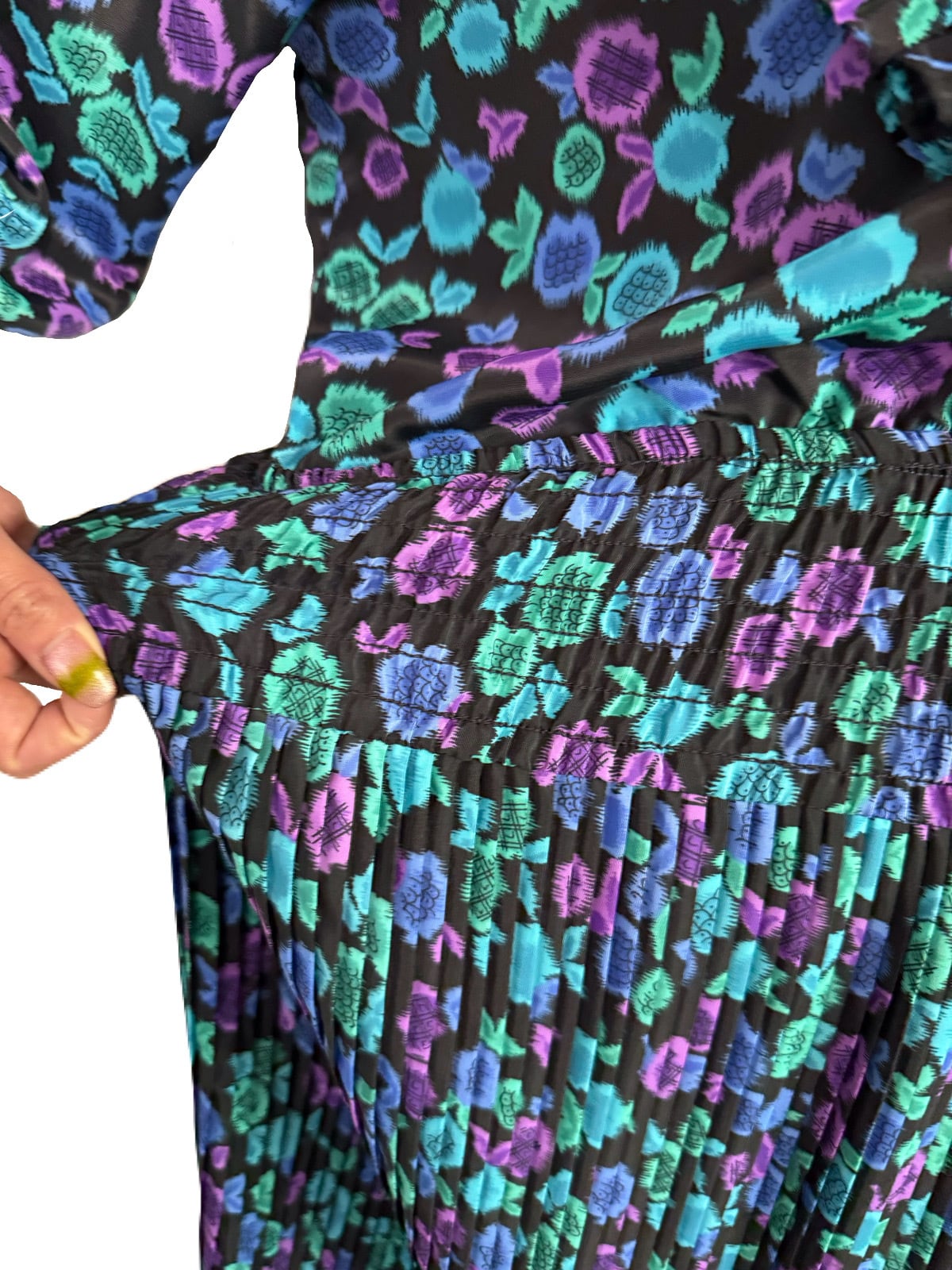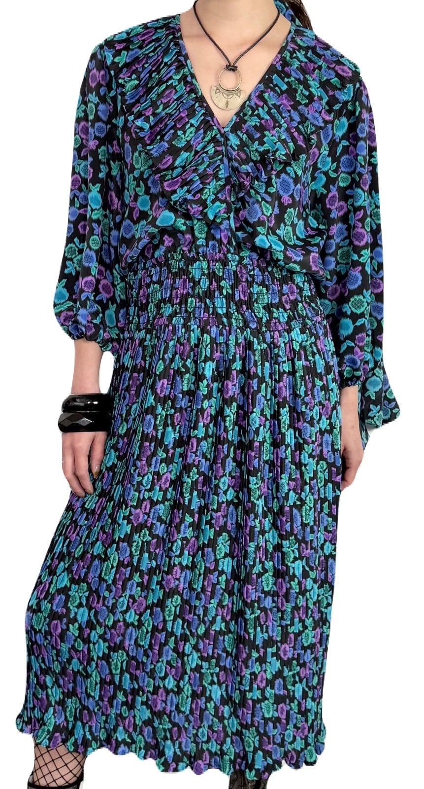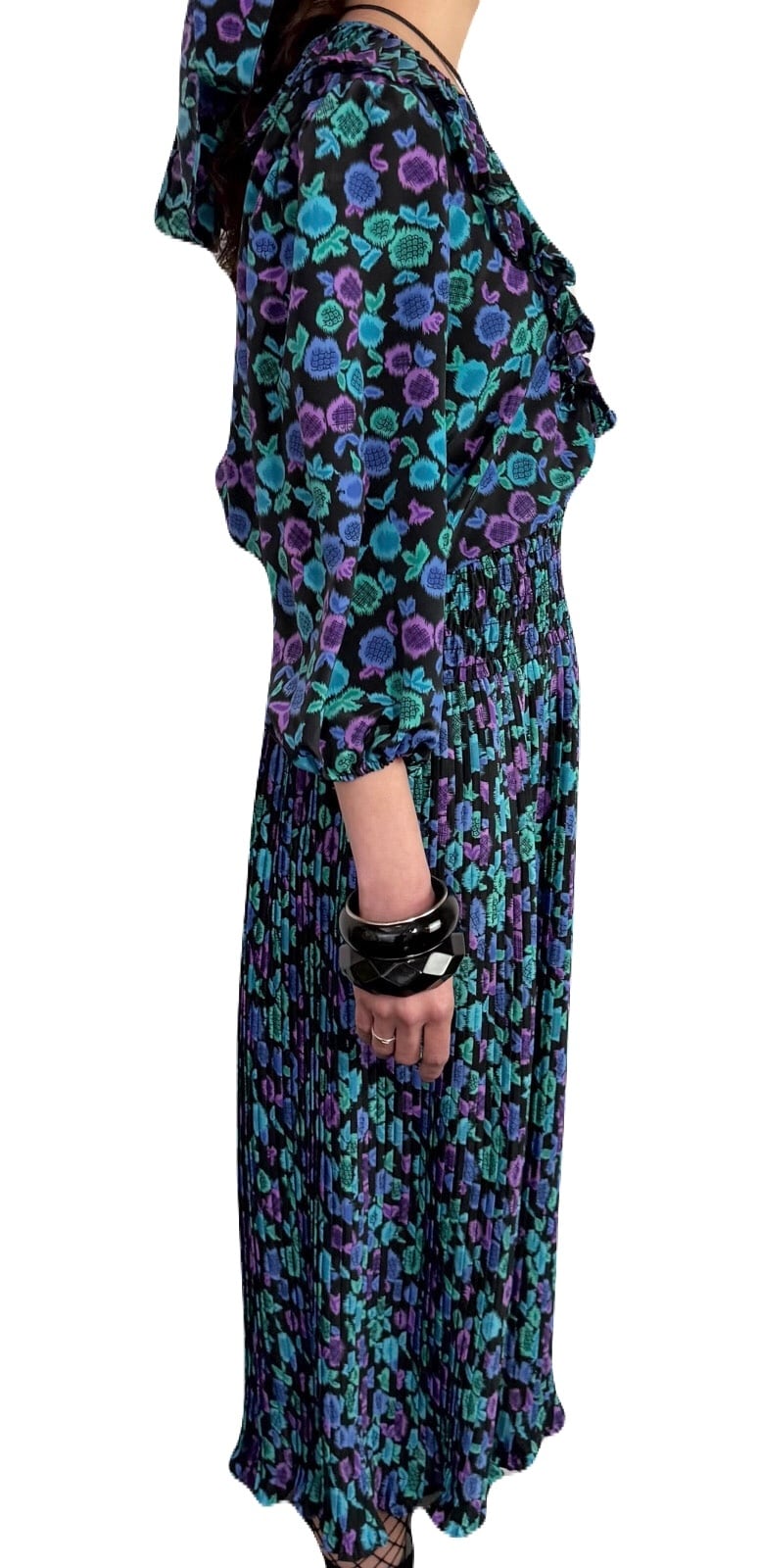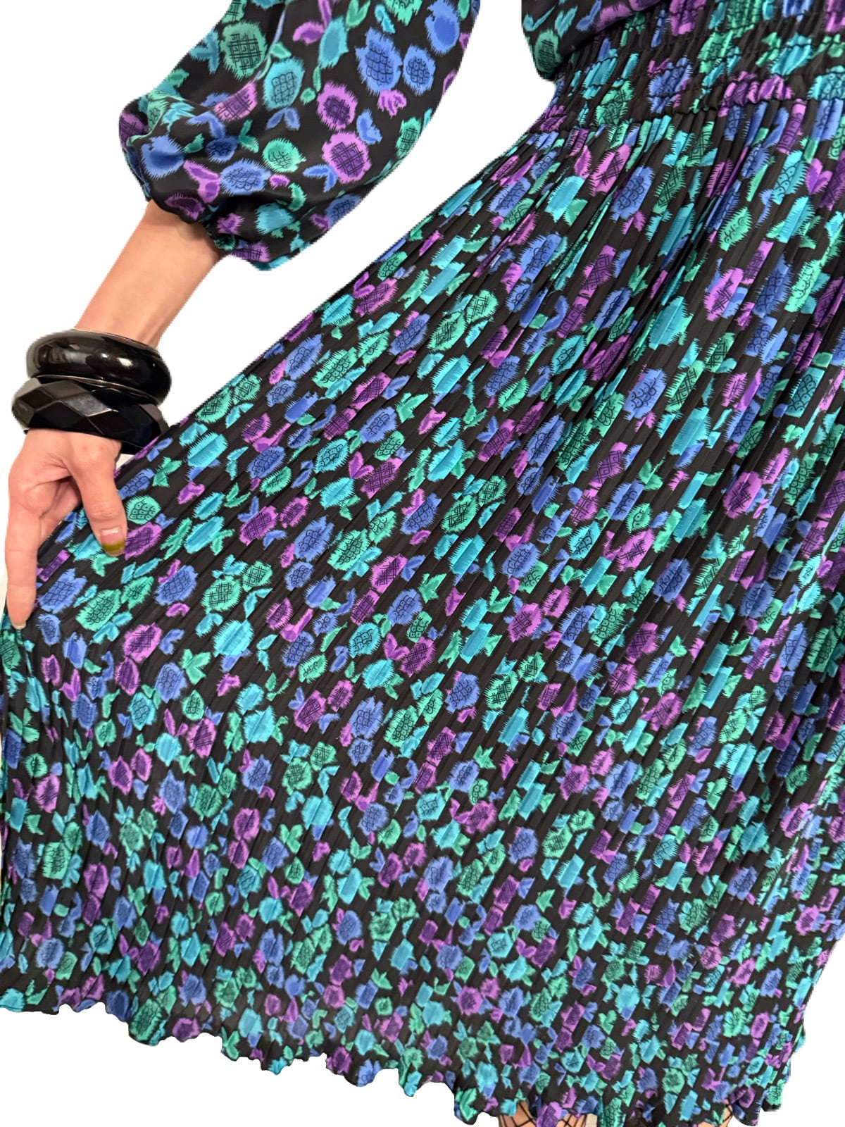 花の蕾にも果物のようにも見えるユニークなテキスタイル。希少な共布ストールつきの 80’s Susan Freisのワンピース。