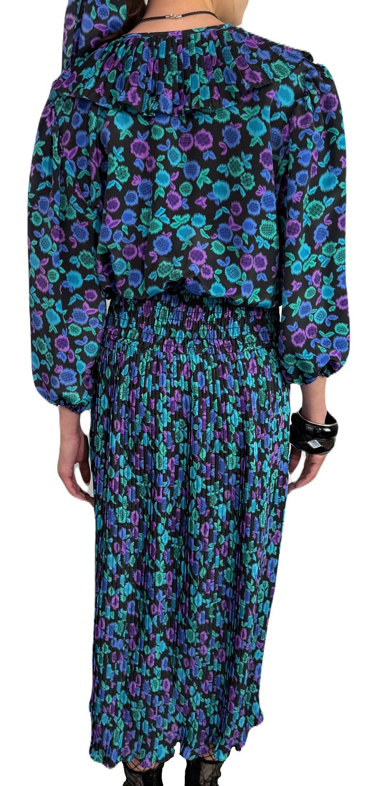 ボトムは細かなプリーツによる印影と、ストンと落ちるシルエットは落ち着きがあり、襟とのバランスが素敵です。