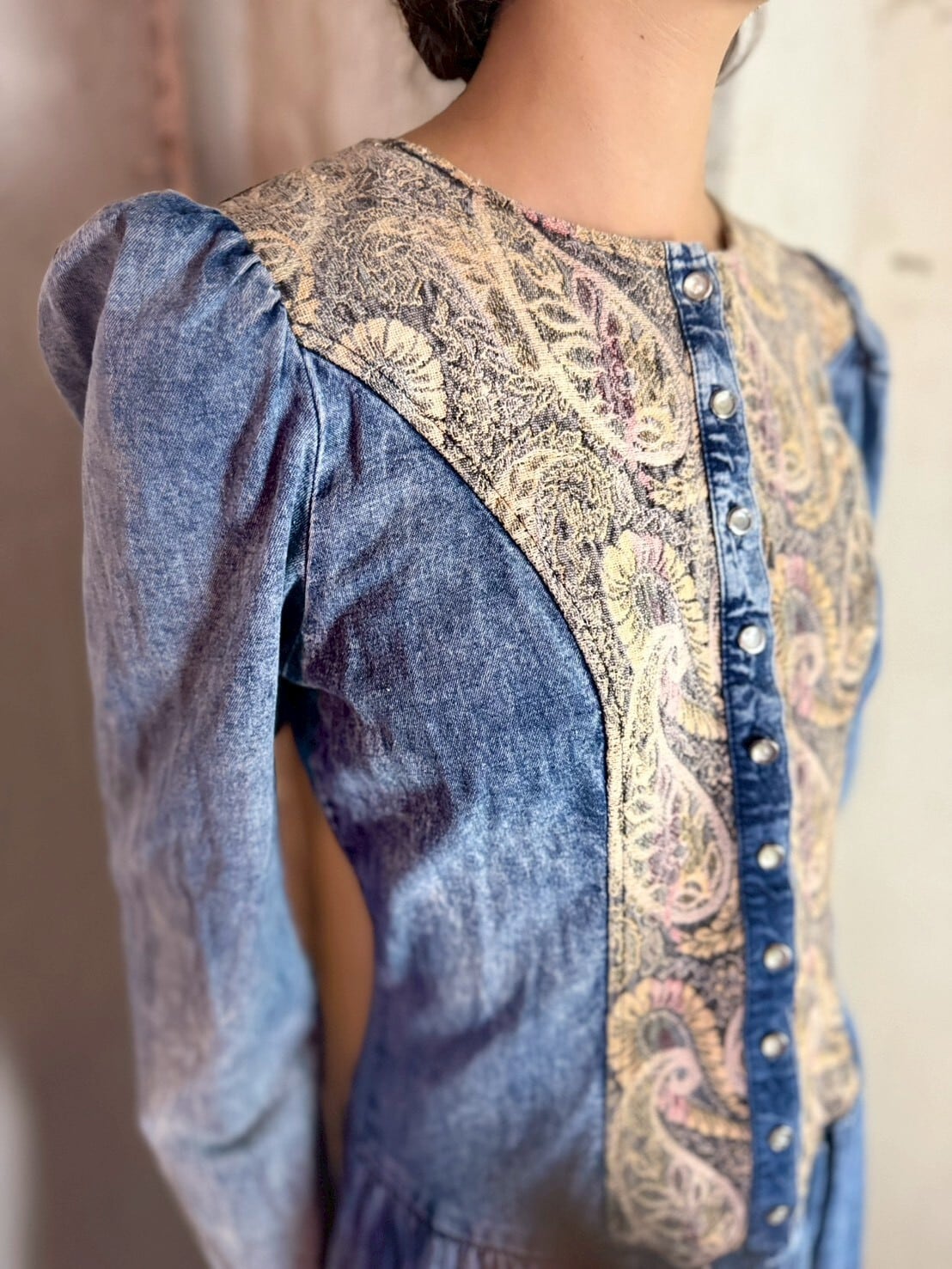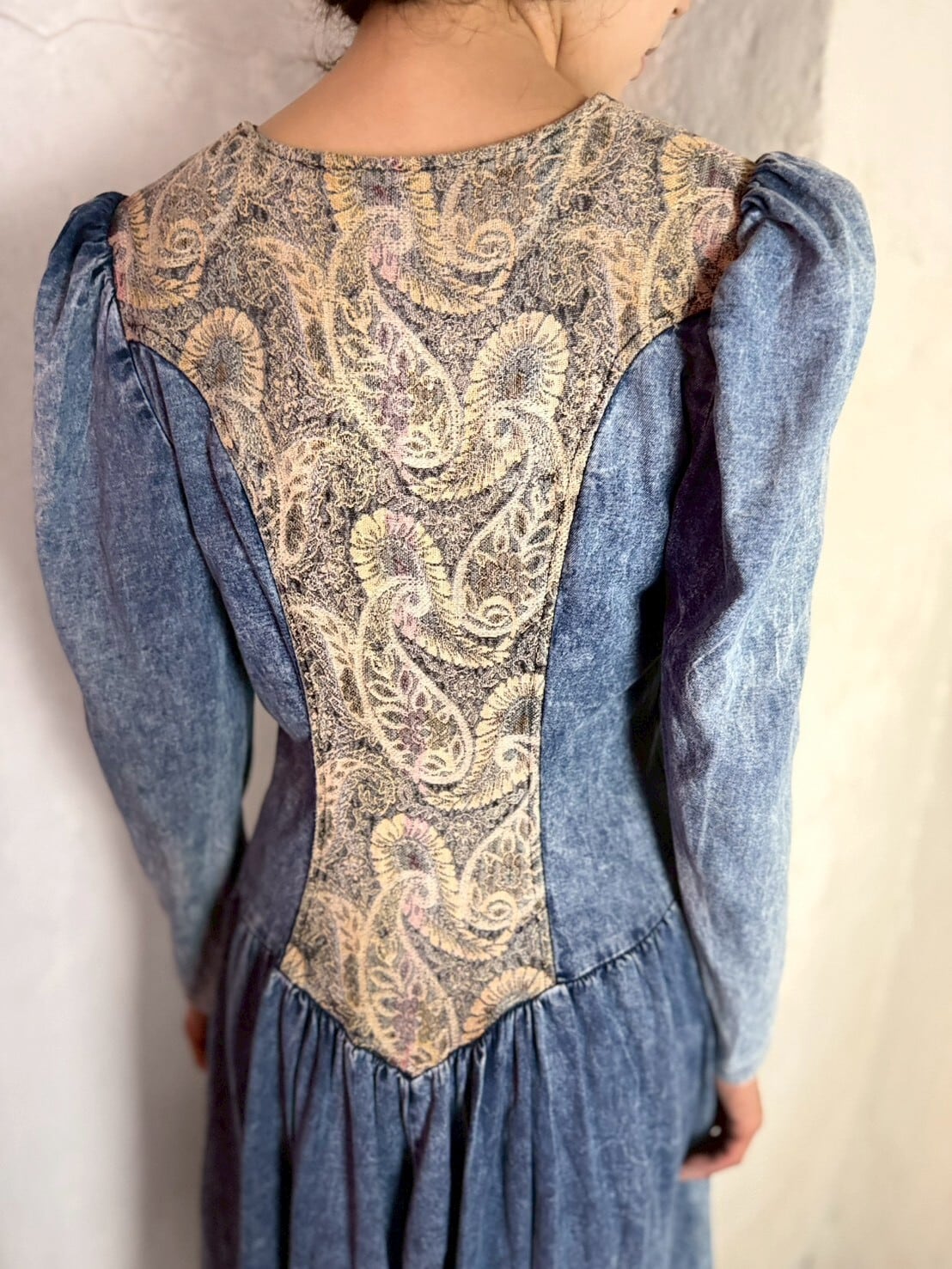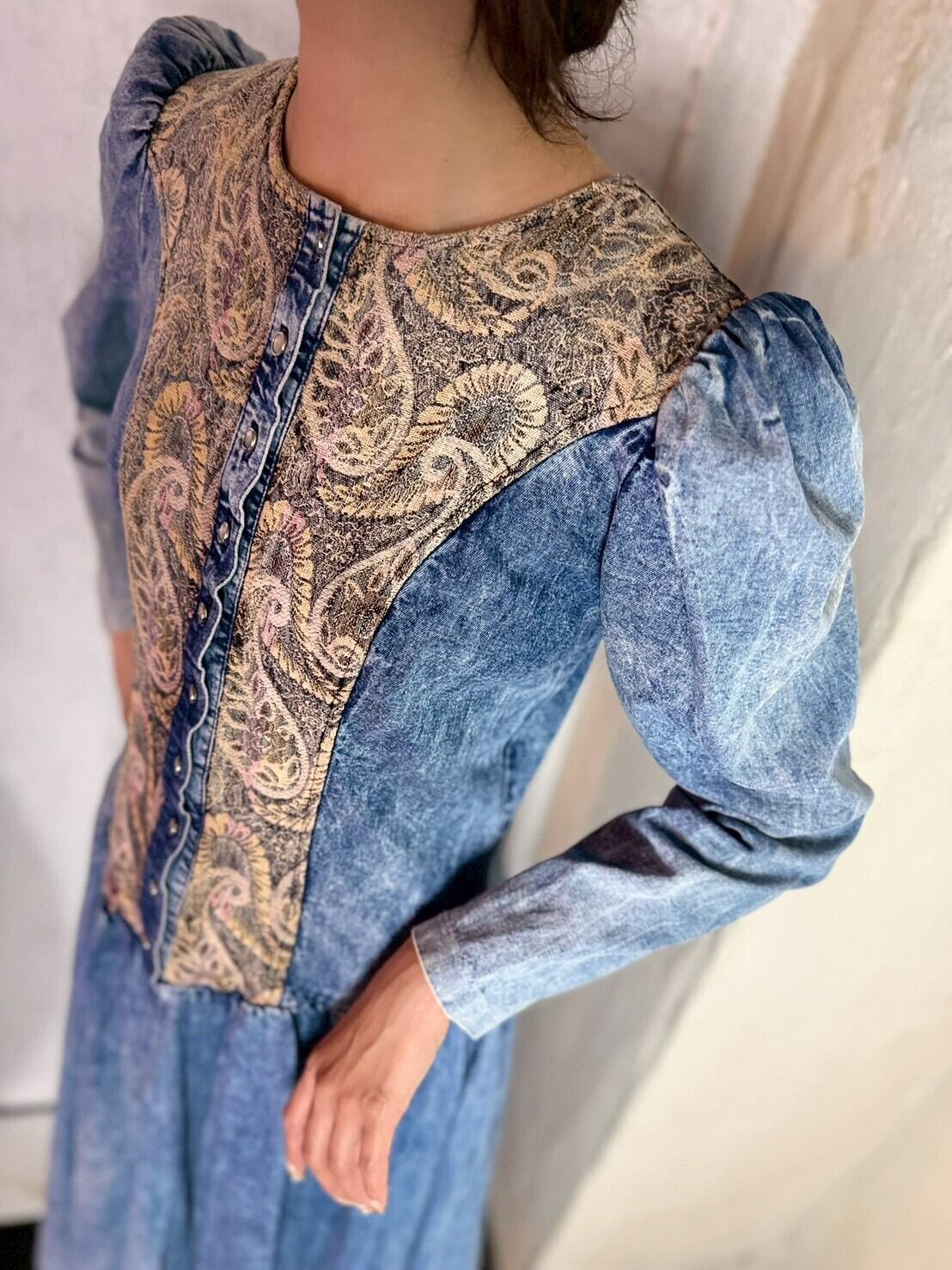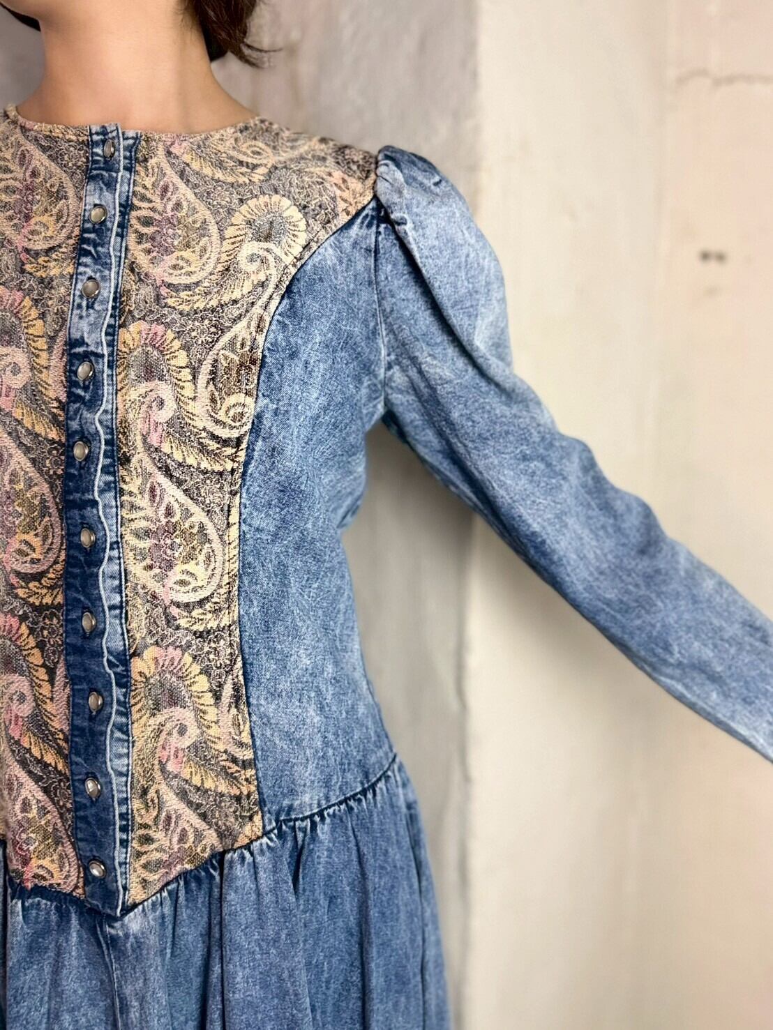 80’sのケミカルウォッシュデニムという、クールな都会的なイメージの生地と、クラシックな美しいゴブラン生地との合わせが目を惹く デニムワンピース。