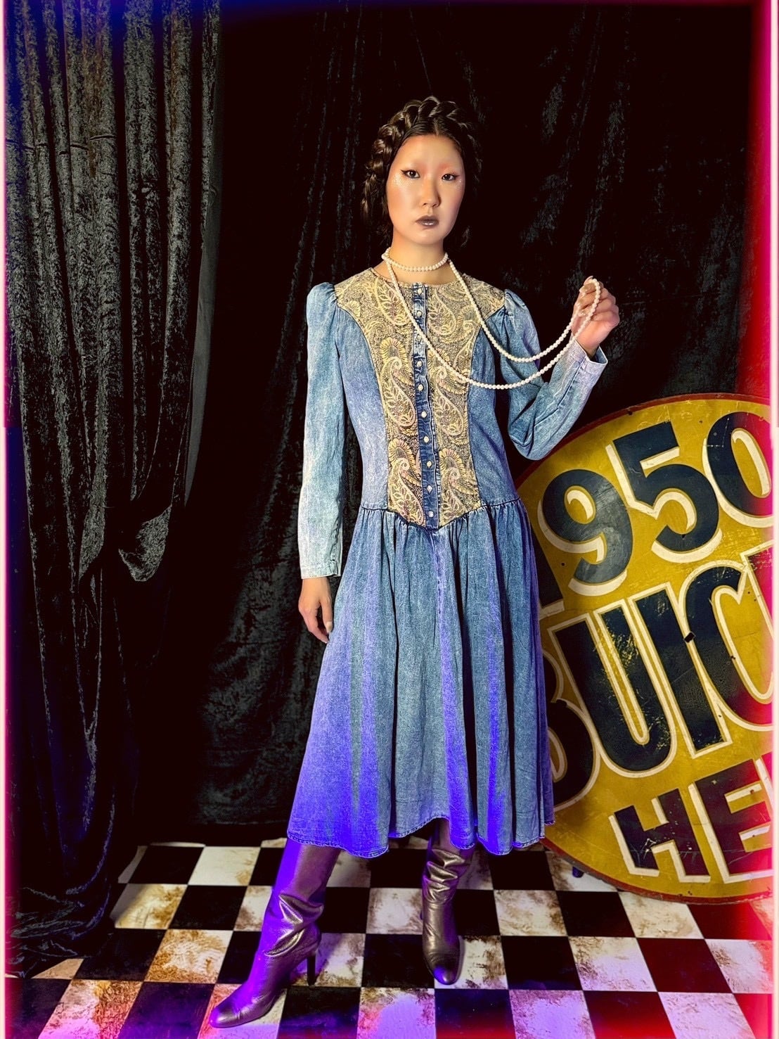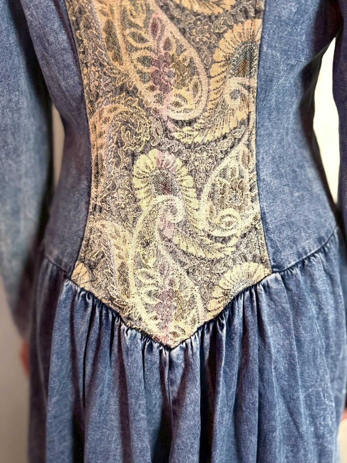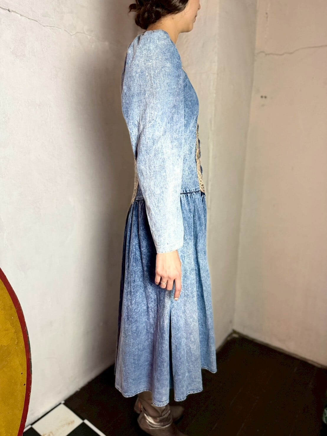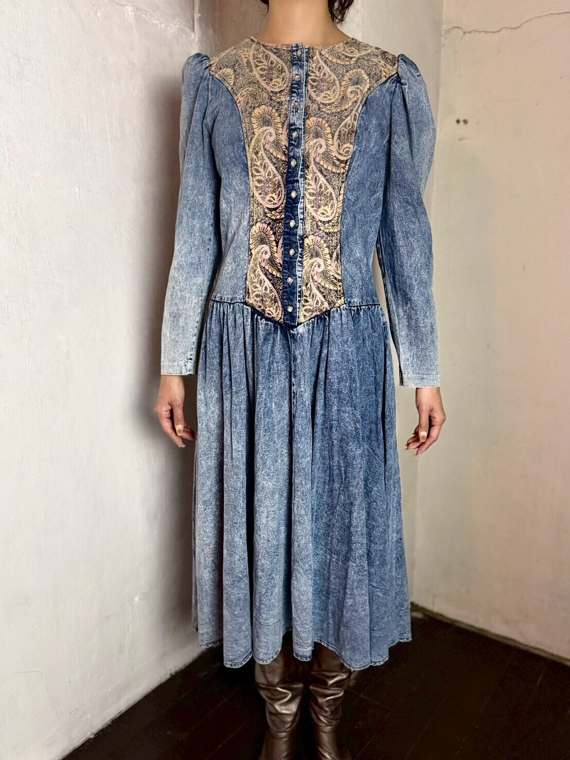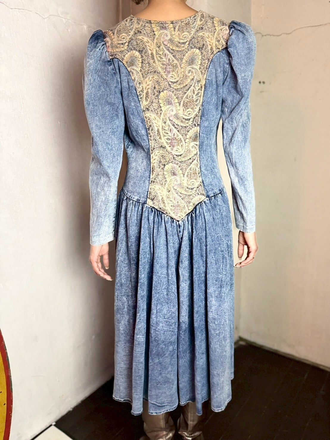 80’sのケミカルウォッシュデニムという、クールな都会的なイメージの生地と、クラシックな美しいゴブラン生地との合わせが目を惹く デニムワンピース。