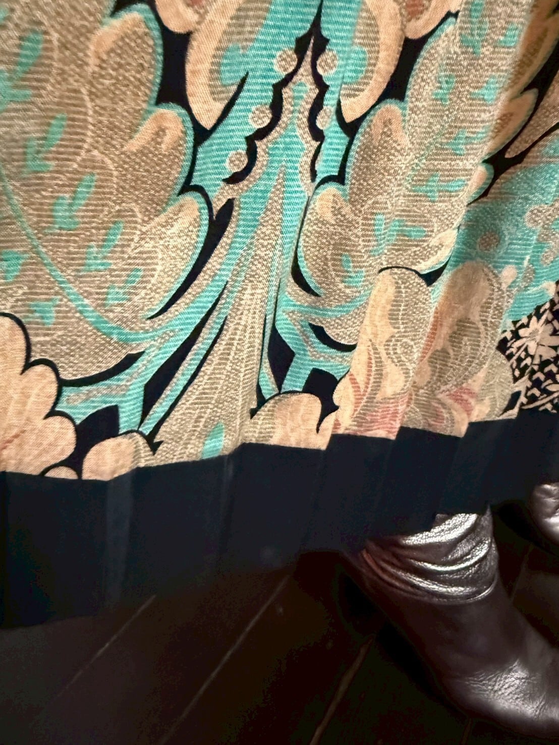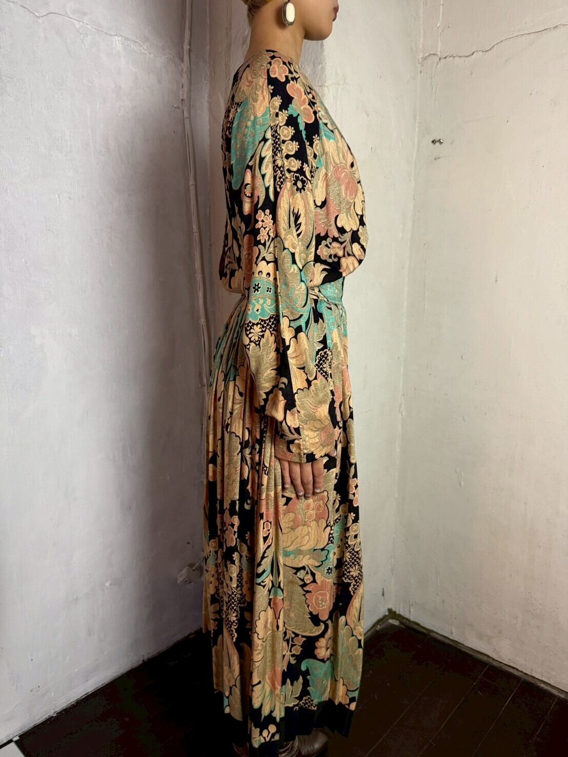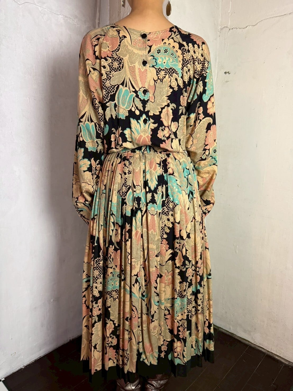 肌馴染みのよいアンティーク感のある色彩にブラックを効かせた、とても美しい80’sワンピース。