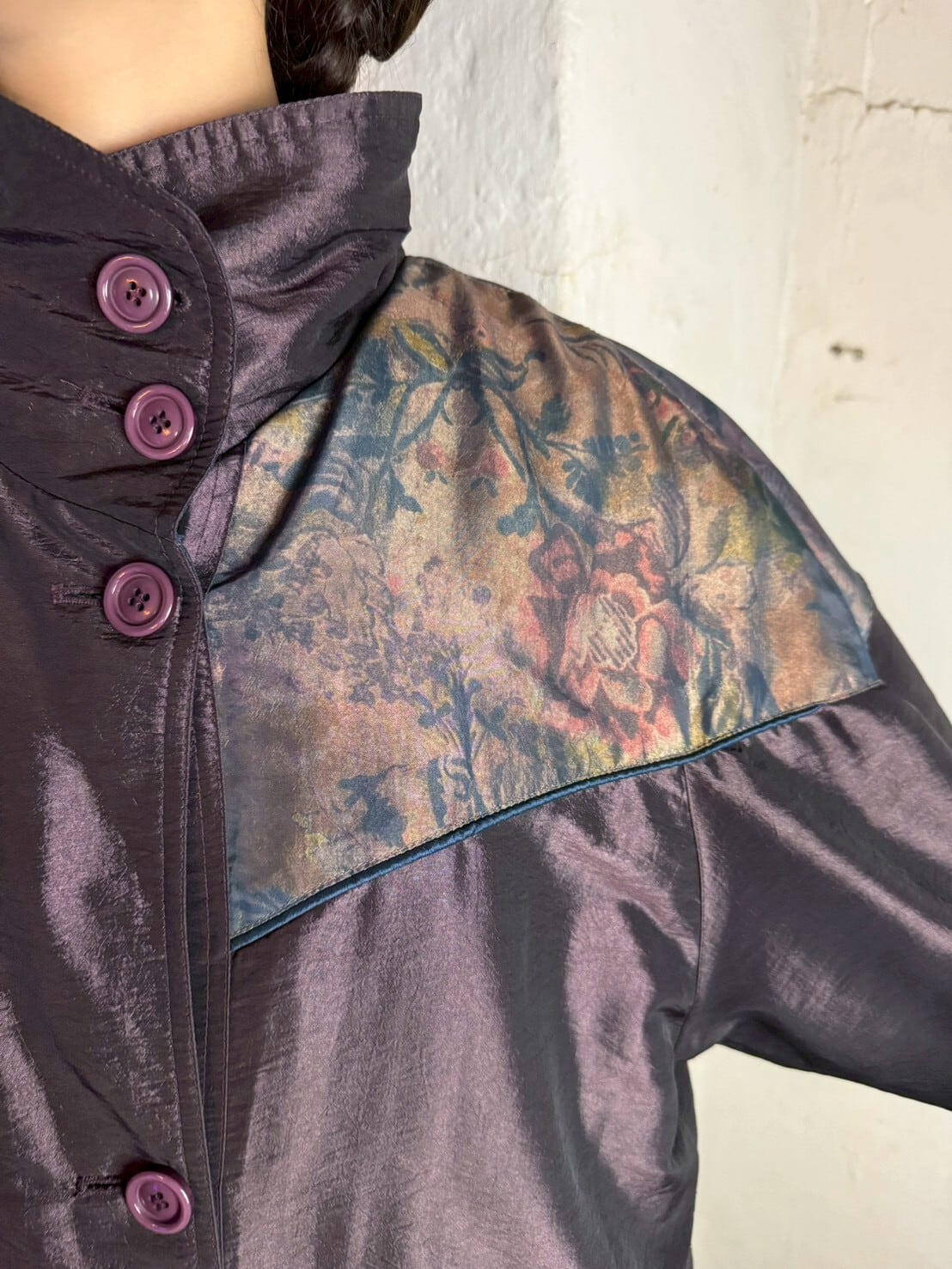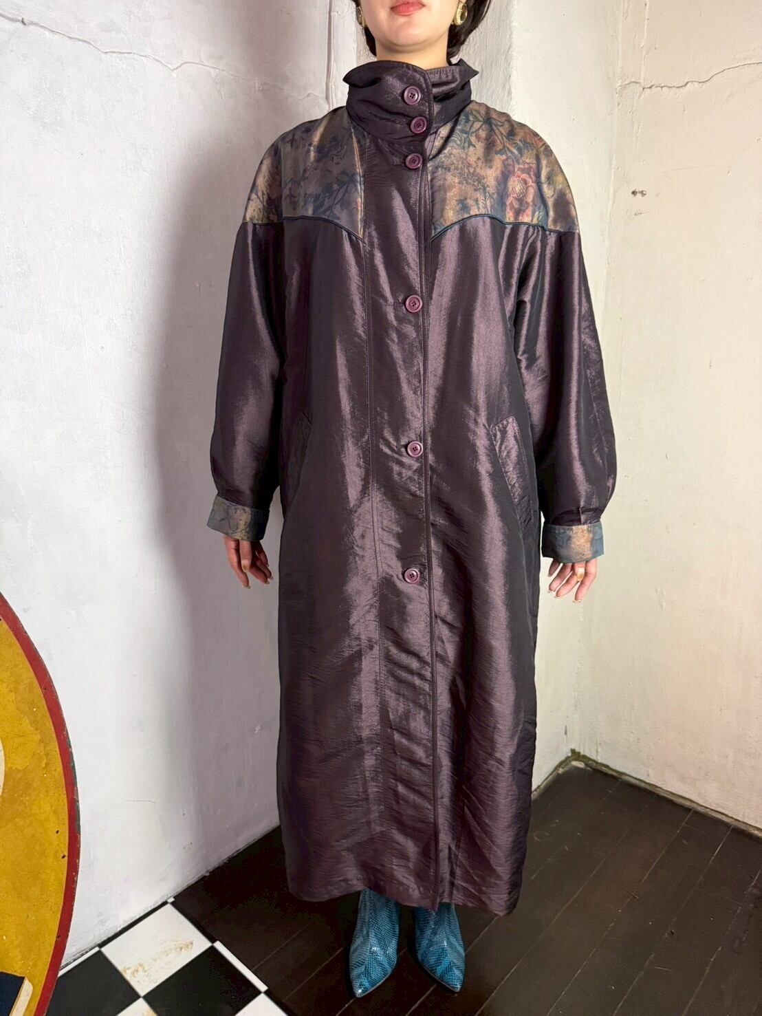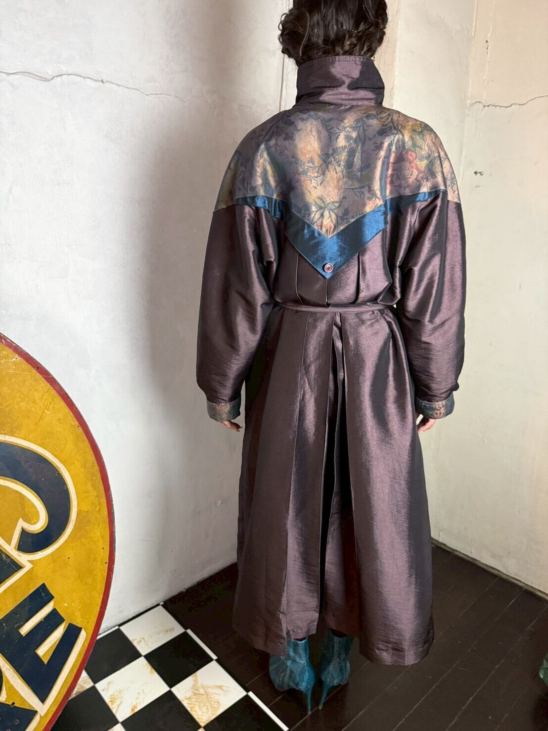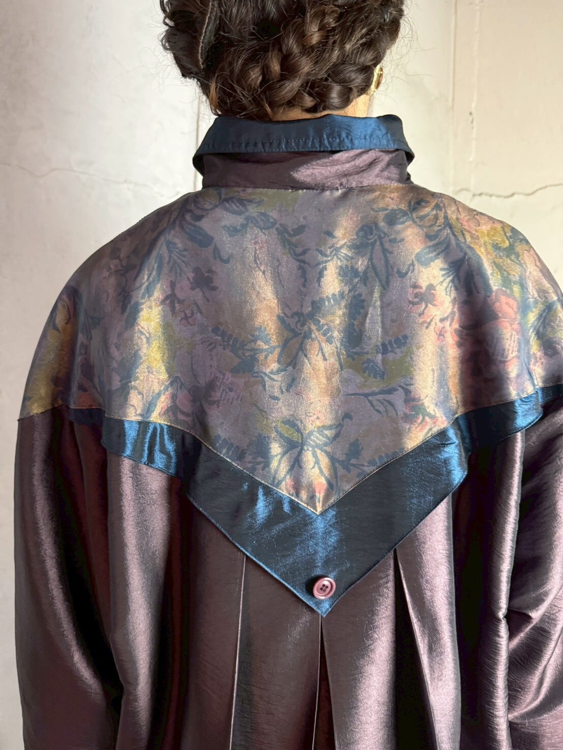 妖しく美しい色彩の玉虫。雰囲気のある小豆系の紫味のあるブラウンとグレイッシュブルー、そしてフラワープリントがミックスされた80’sコート。