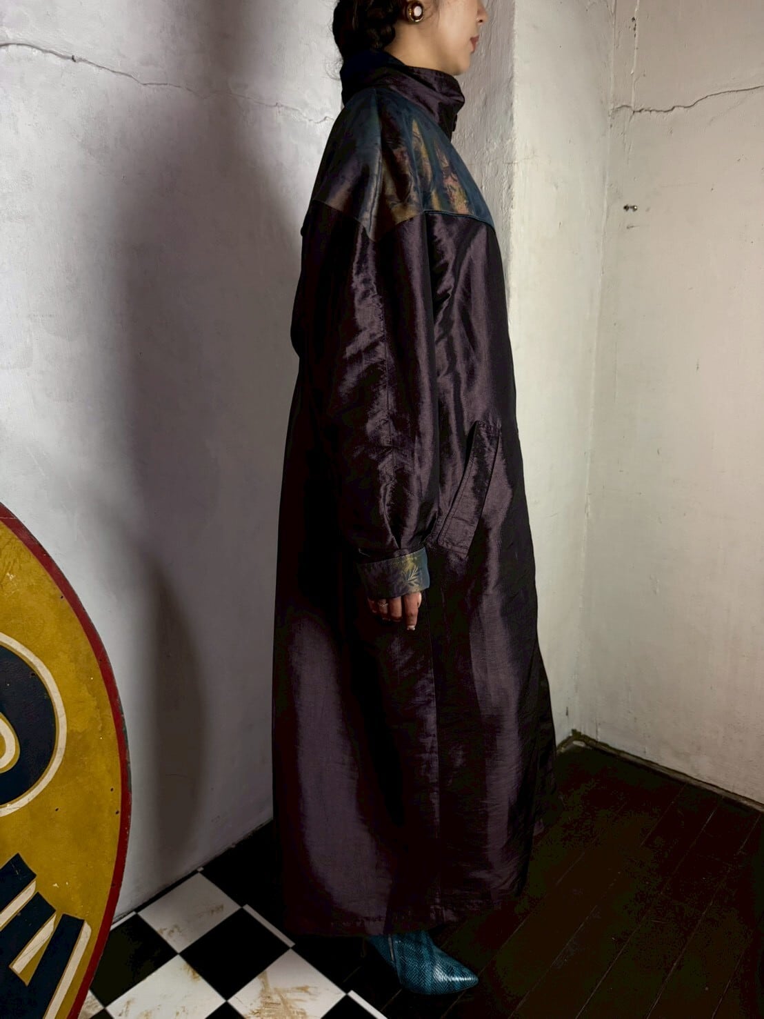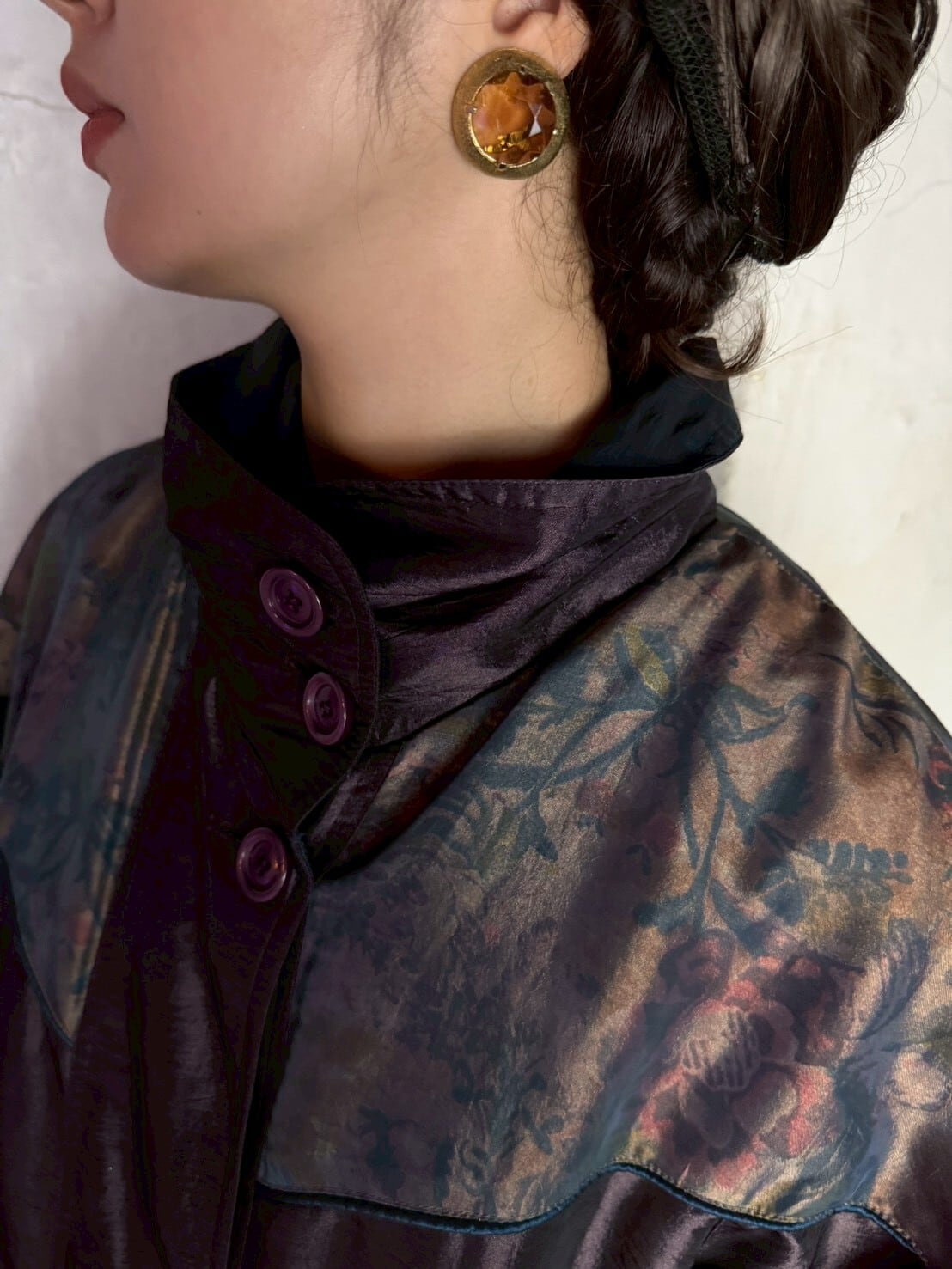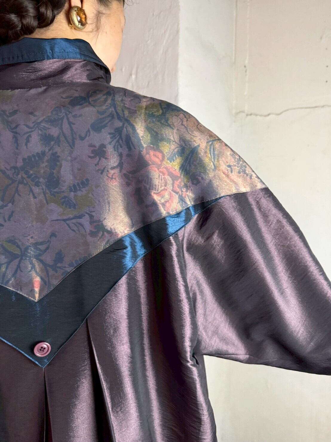 妖しく美しい色彩の玉虫。雰囲気のある小豆系の紫味のあるブラウンとグレイッシュブルー、そしてフラワープリントがミックスされた80’sコート。