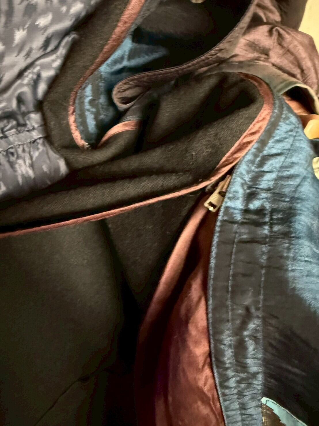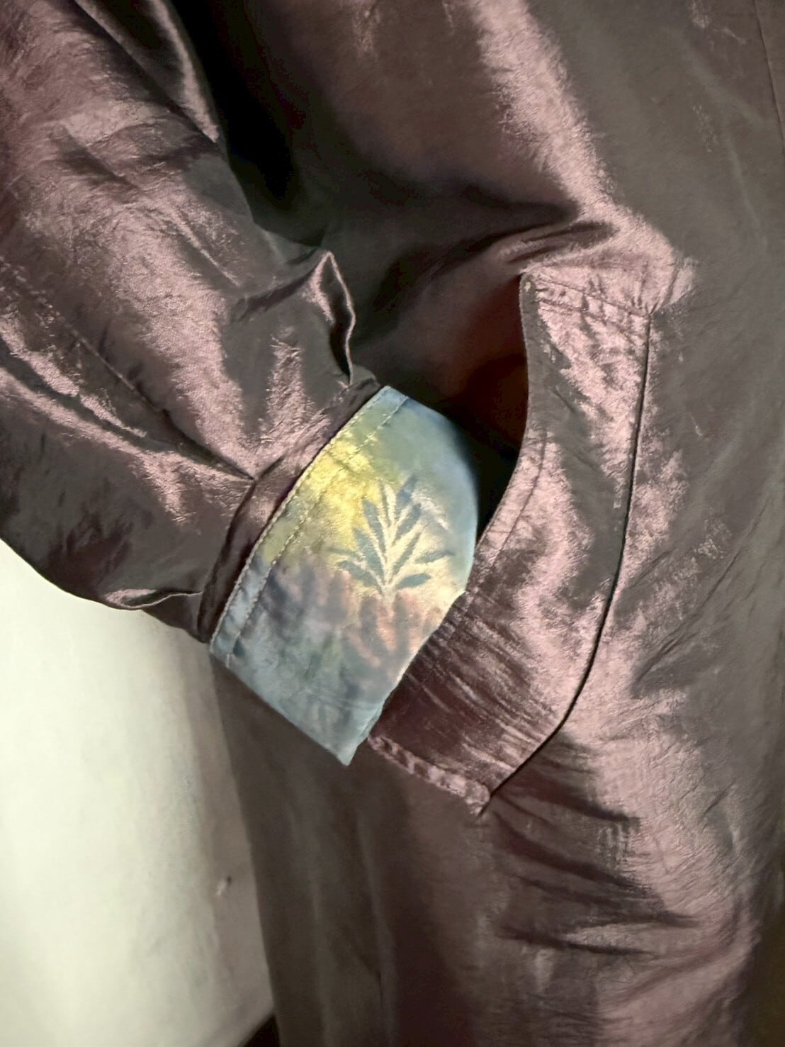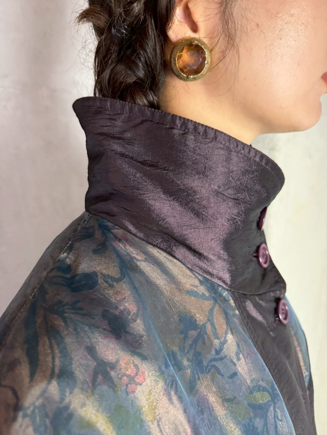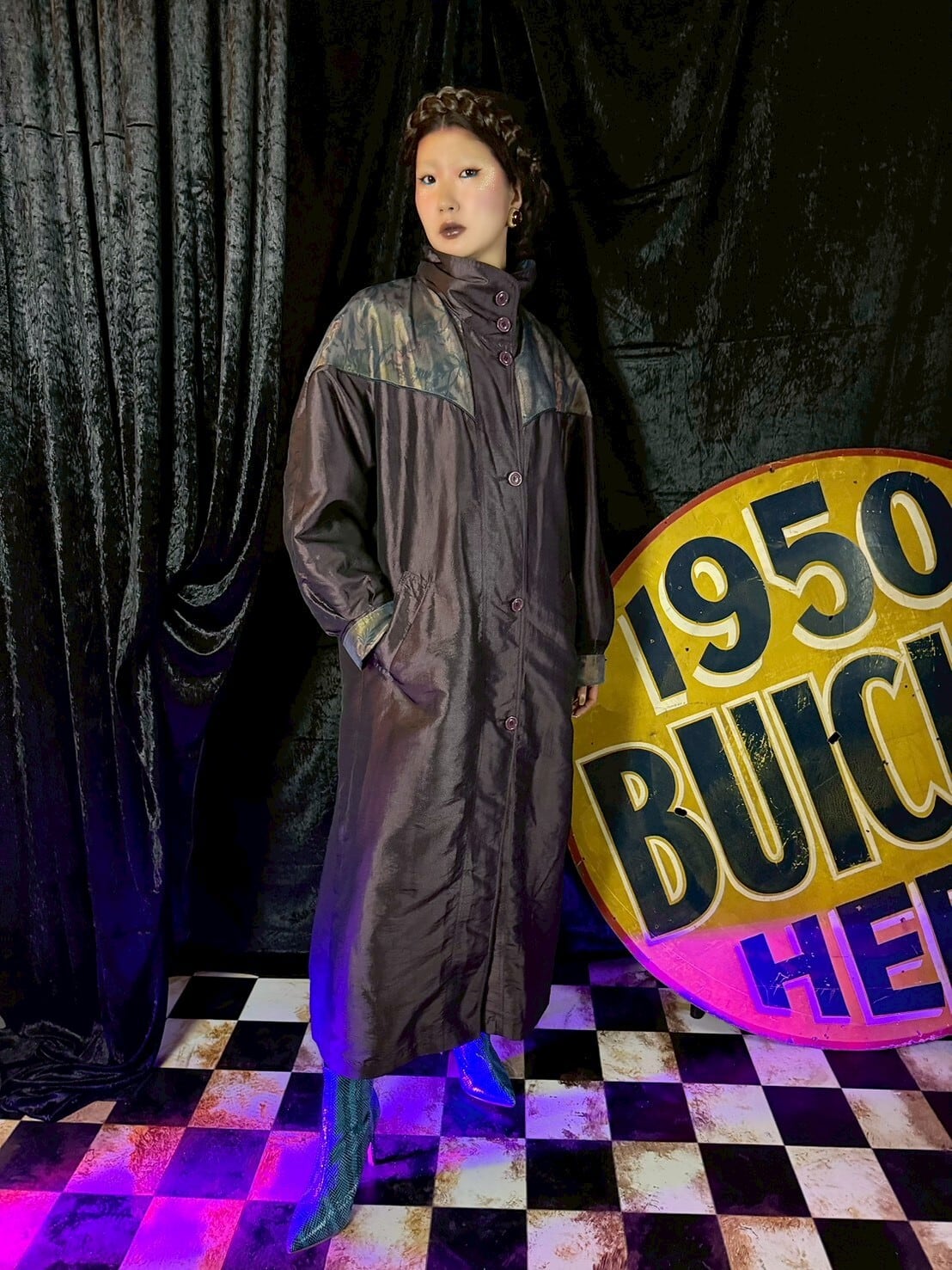 妖しく美しい色彩の玉虫。雰囲気のある小豆系の紫味のあるブラウンとグレイッシュブルー、そしてフラワープリントがミックスされた80’sコート。