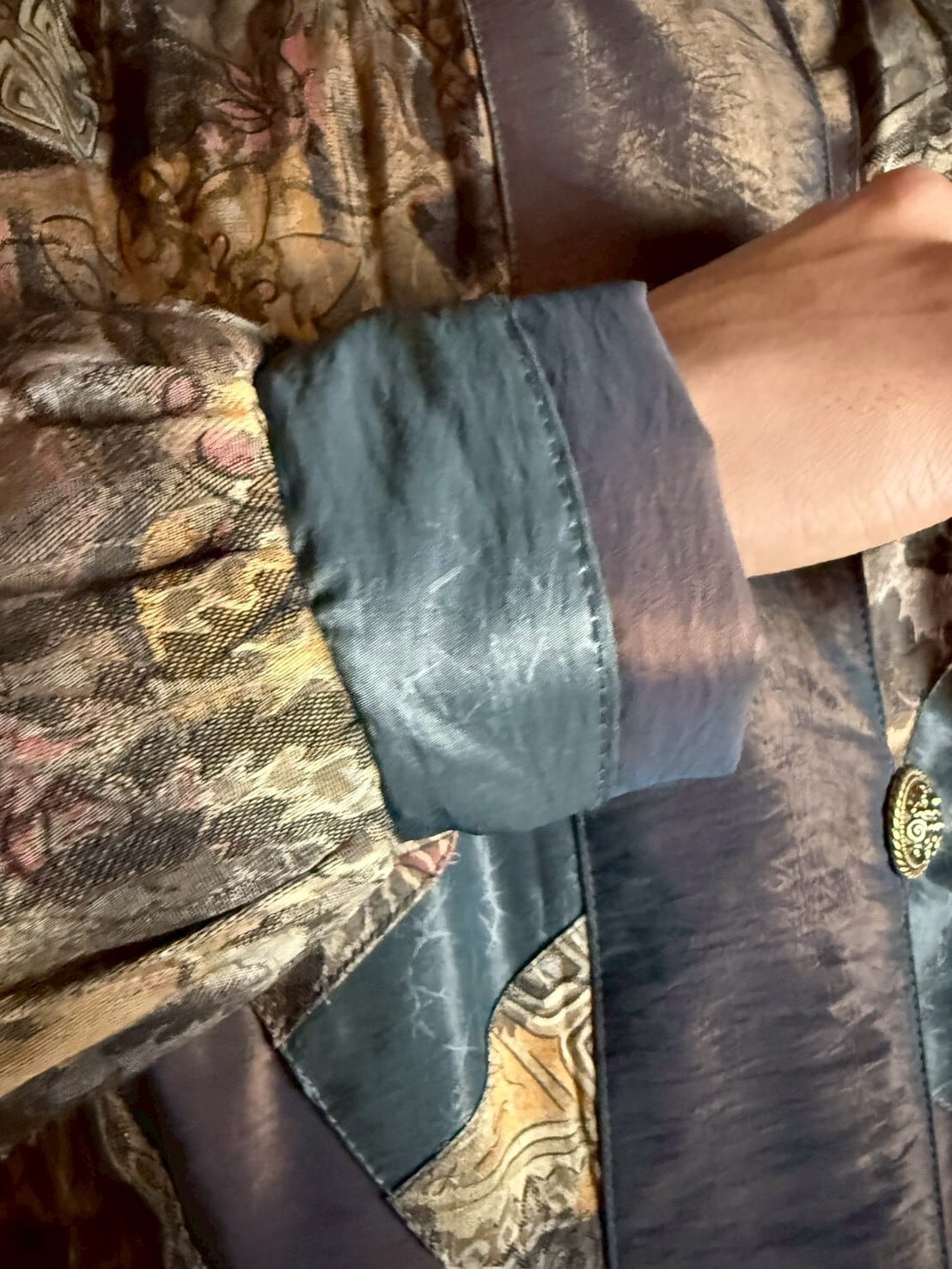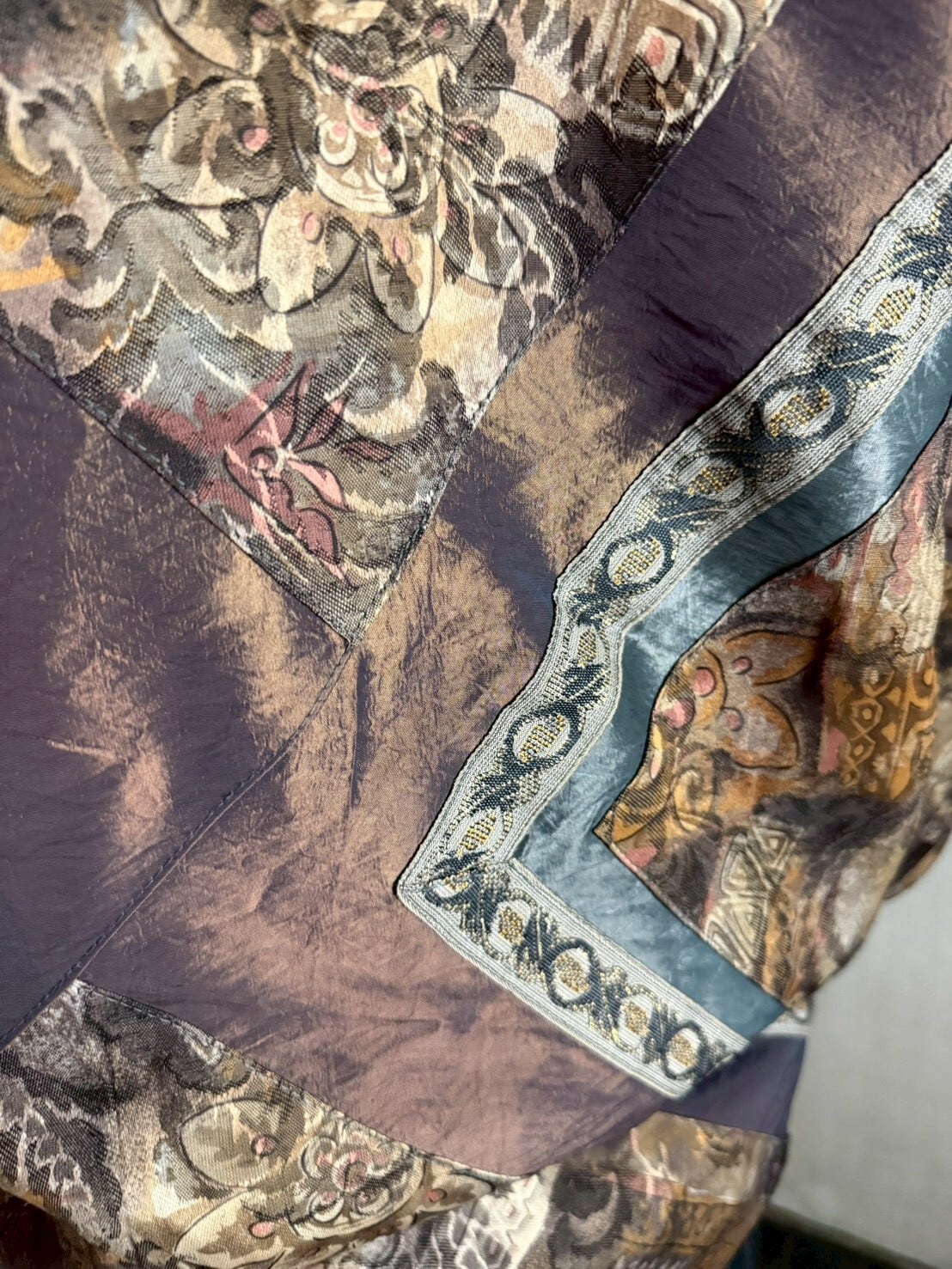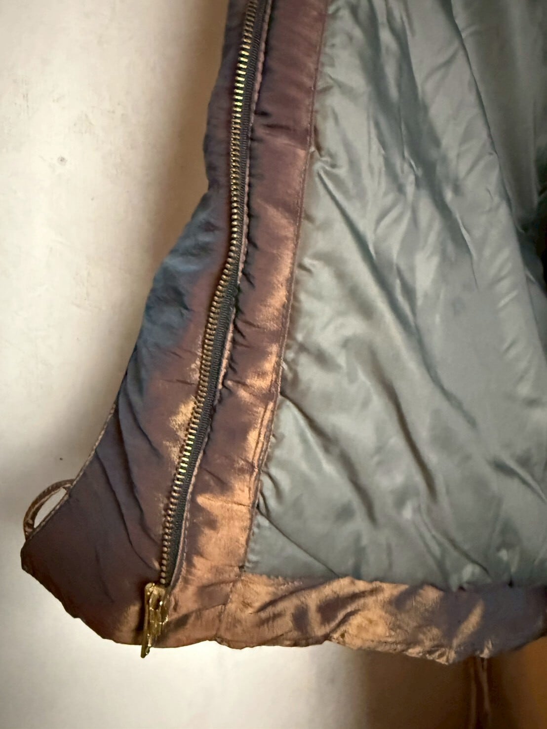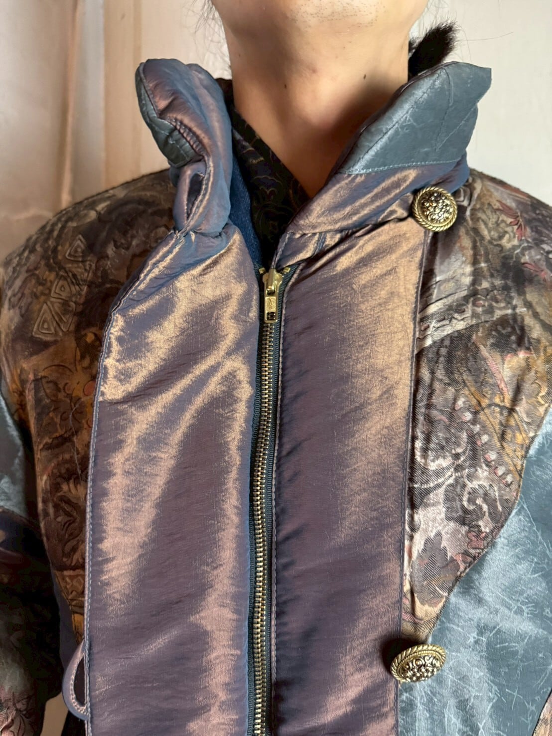 綺麗な光沢のある淡いブラウンとグレイッシュブルーが重なる中綿入りブルゾン。アンティーク感のある優しいリーフデザインのテキスタイルやリボンも加えられ、更に美しくこのジャケットを引き立てます。
