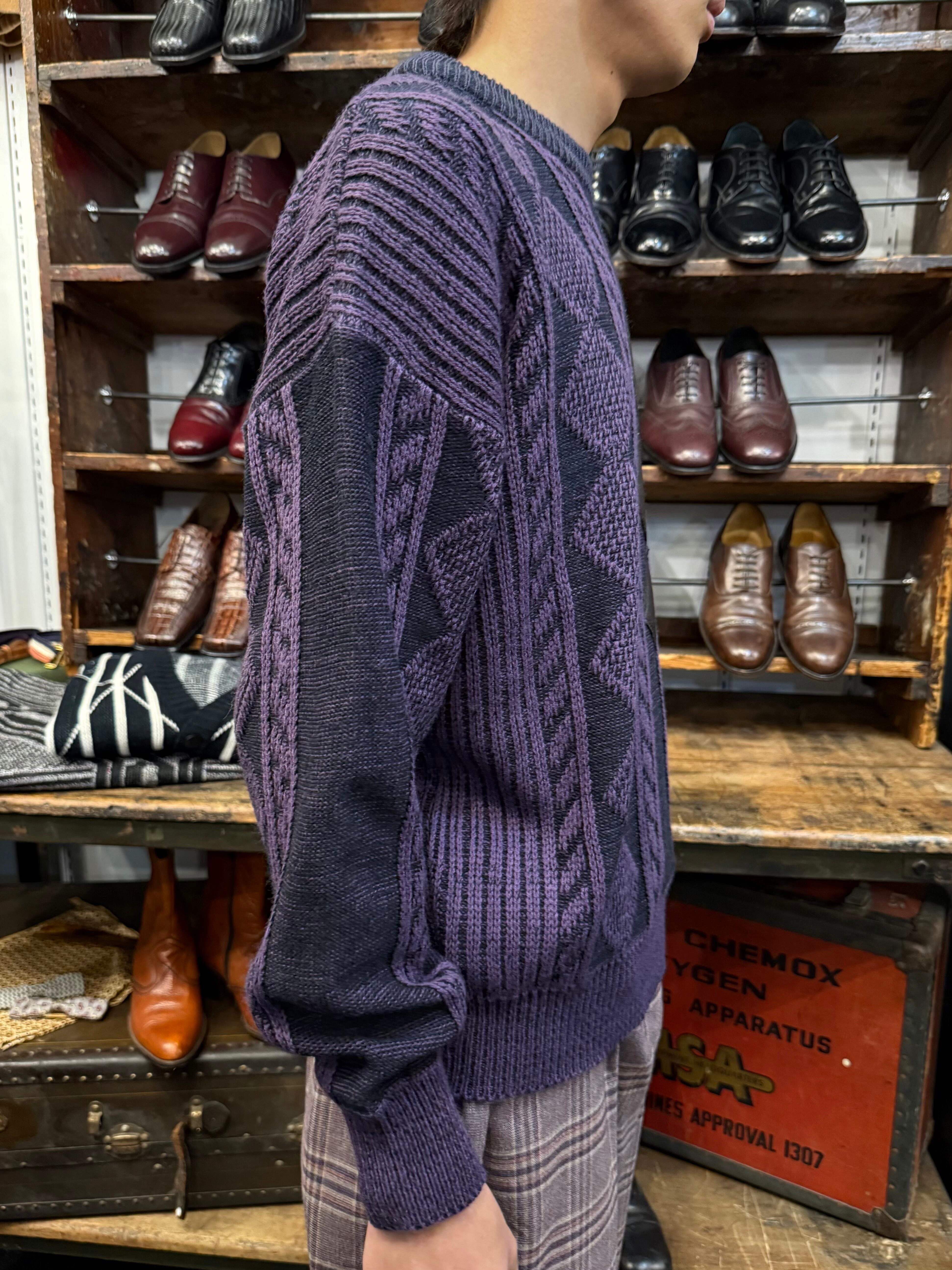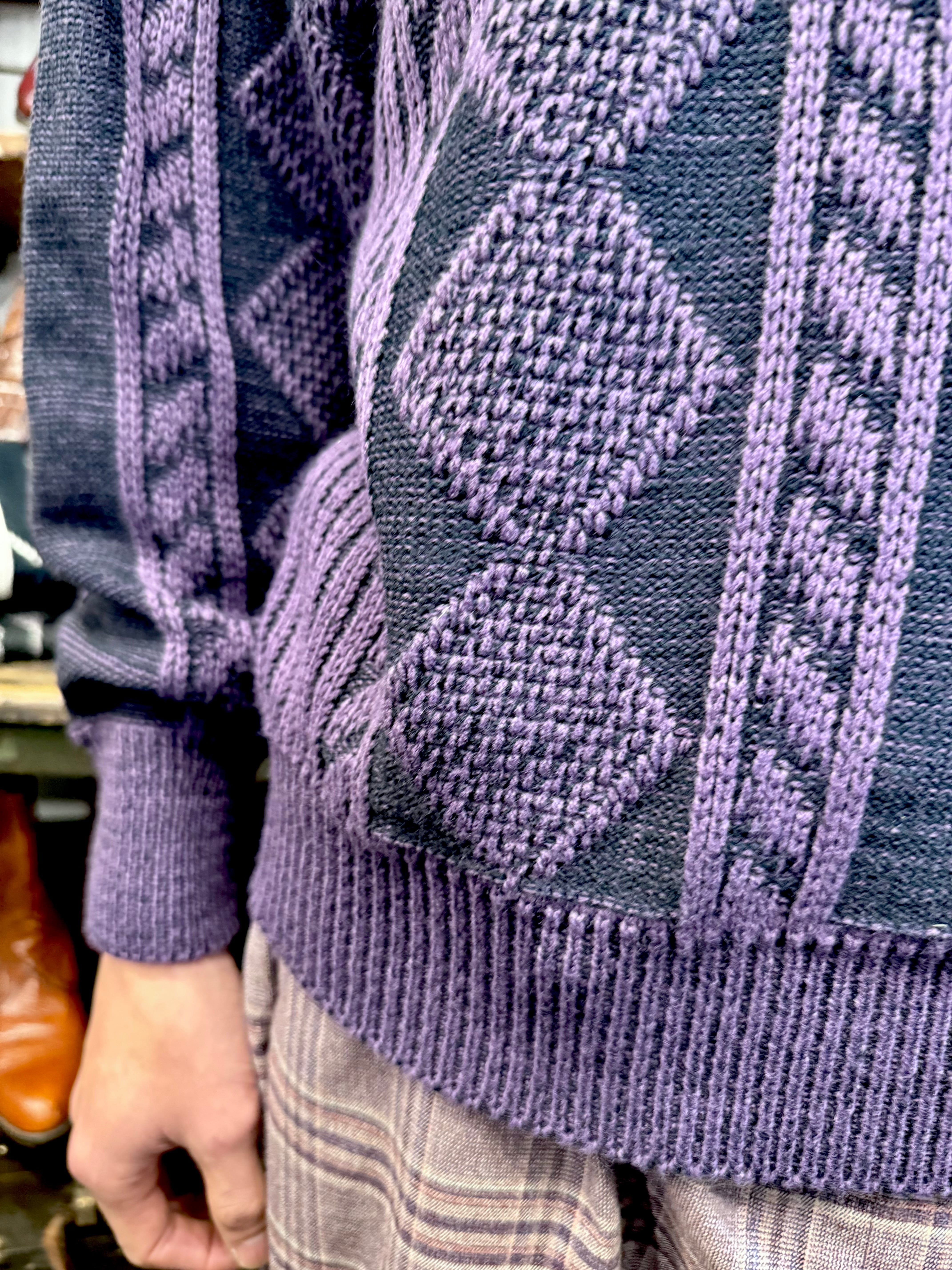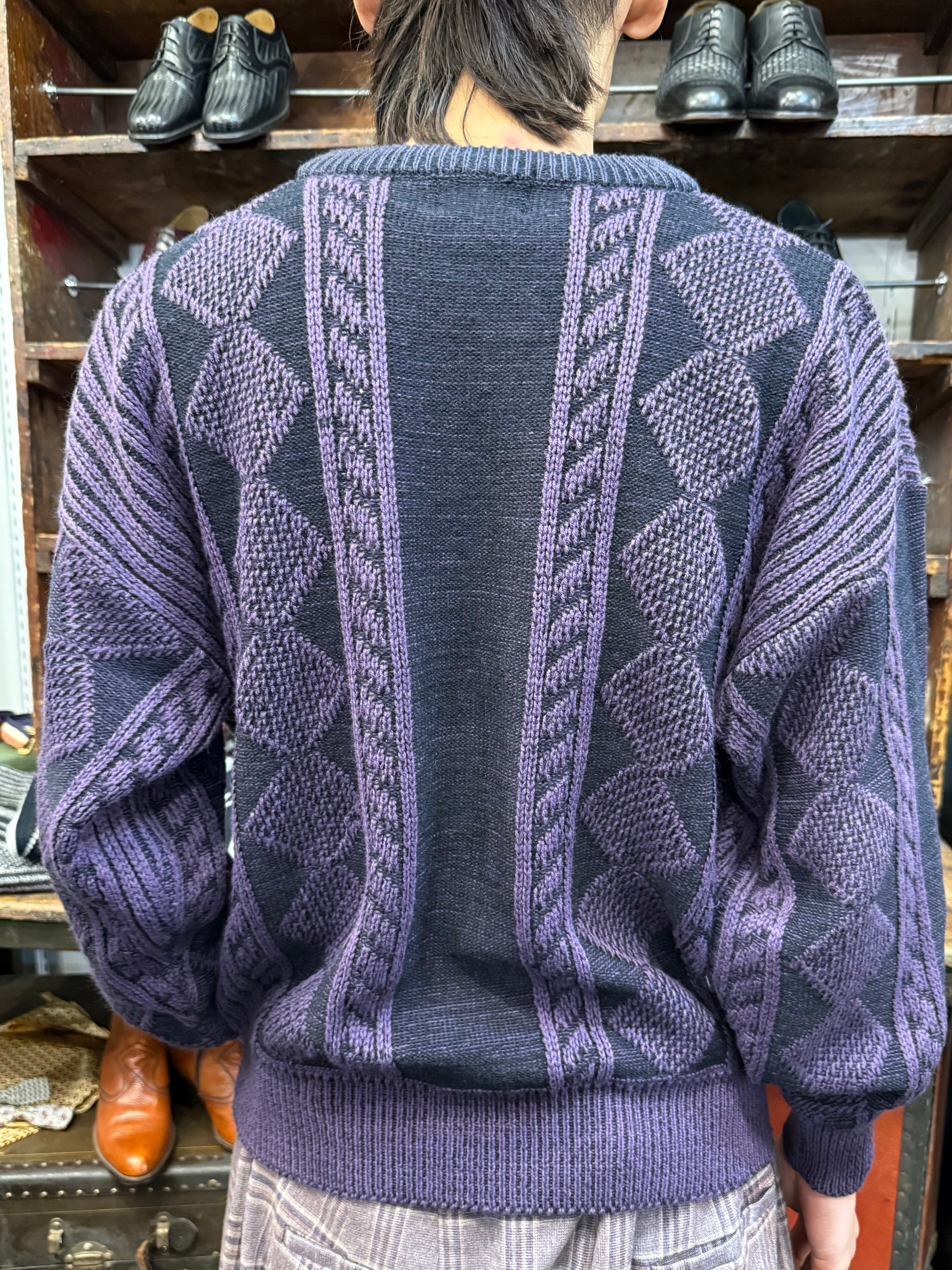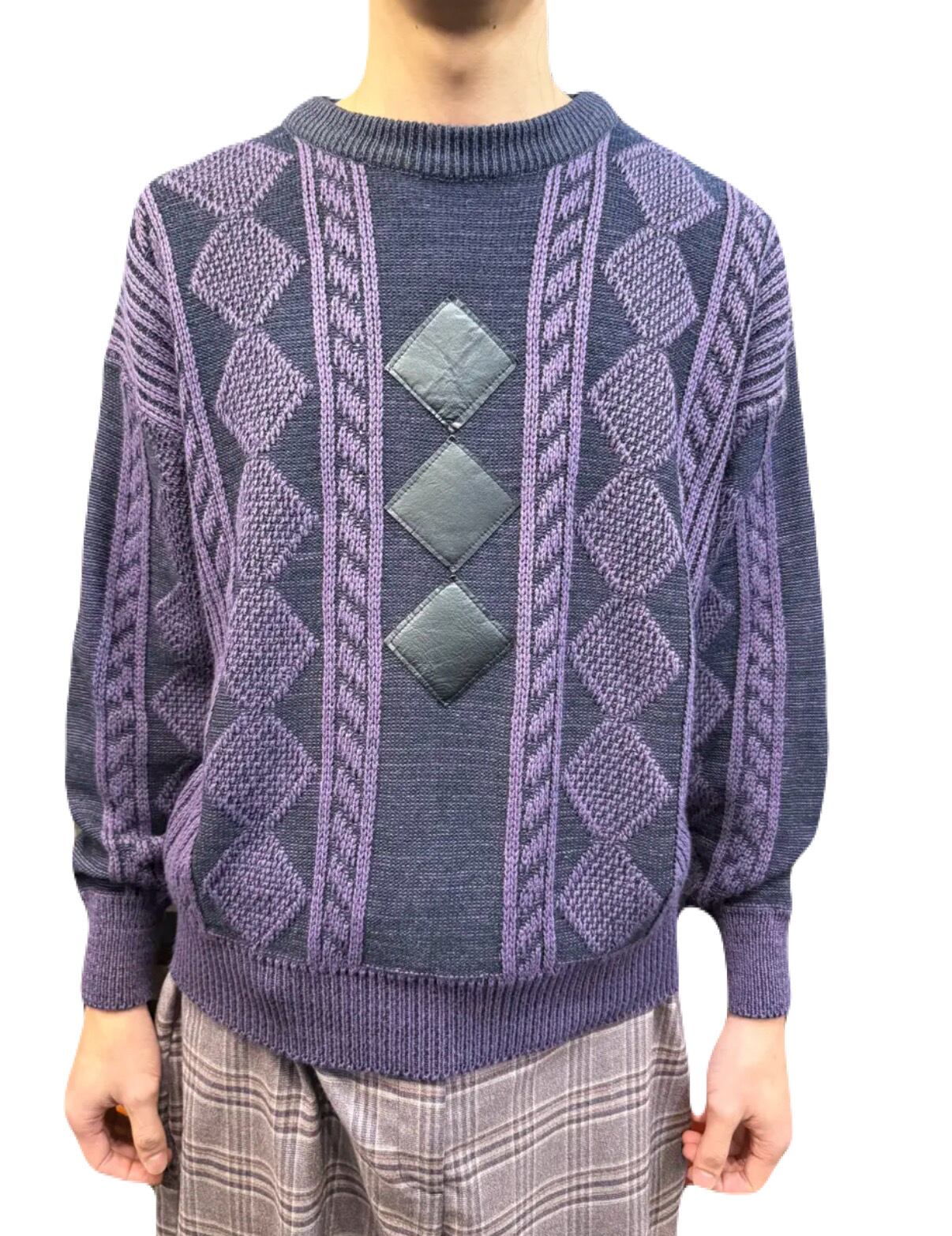 馴染みの良いパープルとブラックのコンビネーション。ダイヤ柄が並ぶ編み模様に 同じ形状のレザーが雰囲気よくプラスされたお洒落なセーターです。