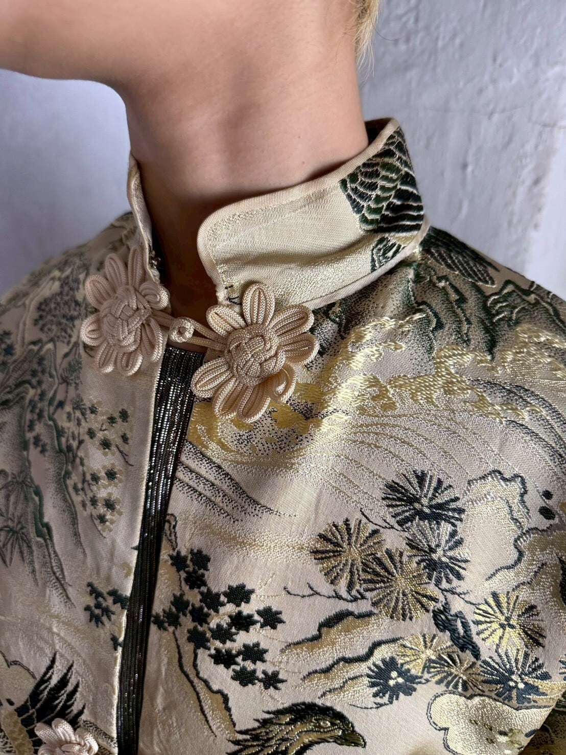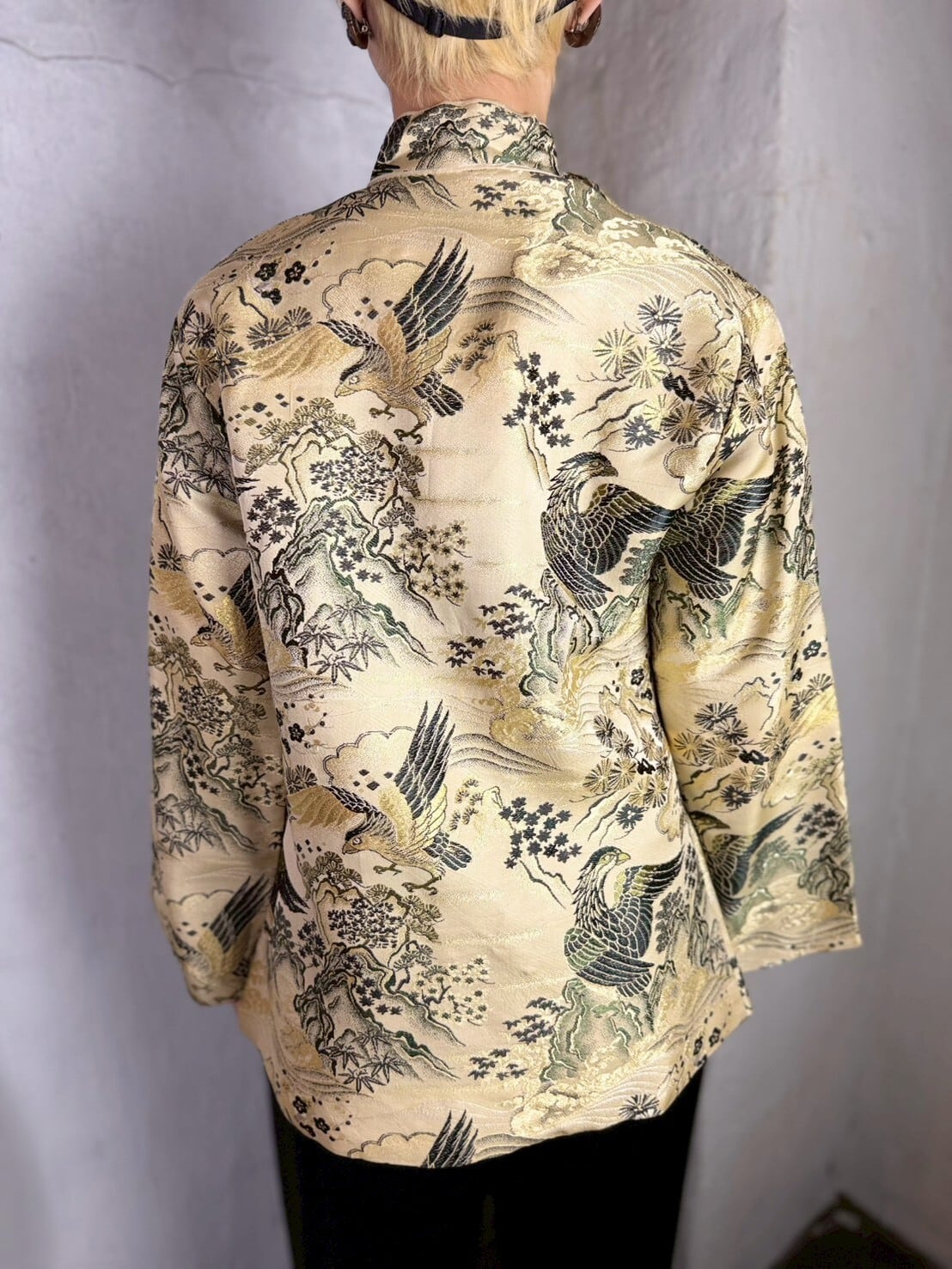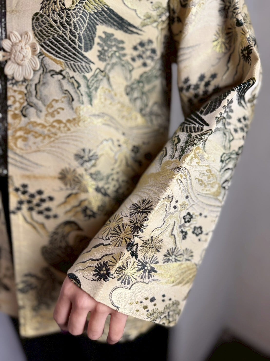 肌馴染みの良いクリームカラーに、奥行きのあるグリーンベースの刺繍が、絵画のような美しい表情を見せてくれます。