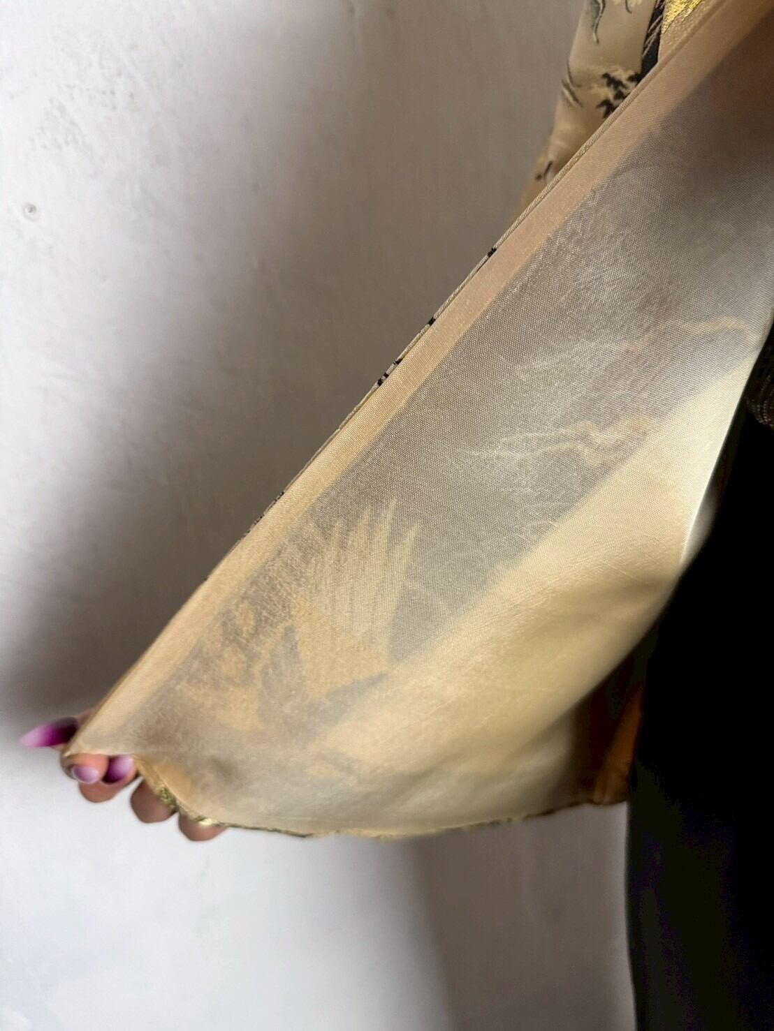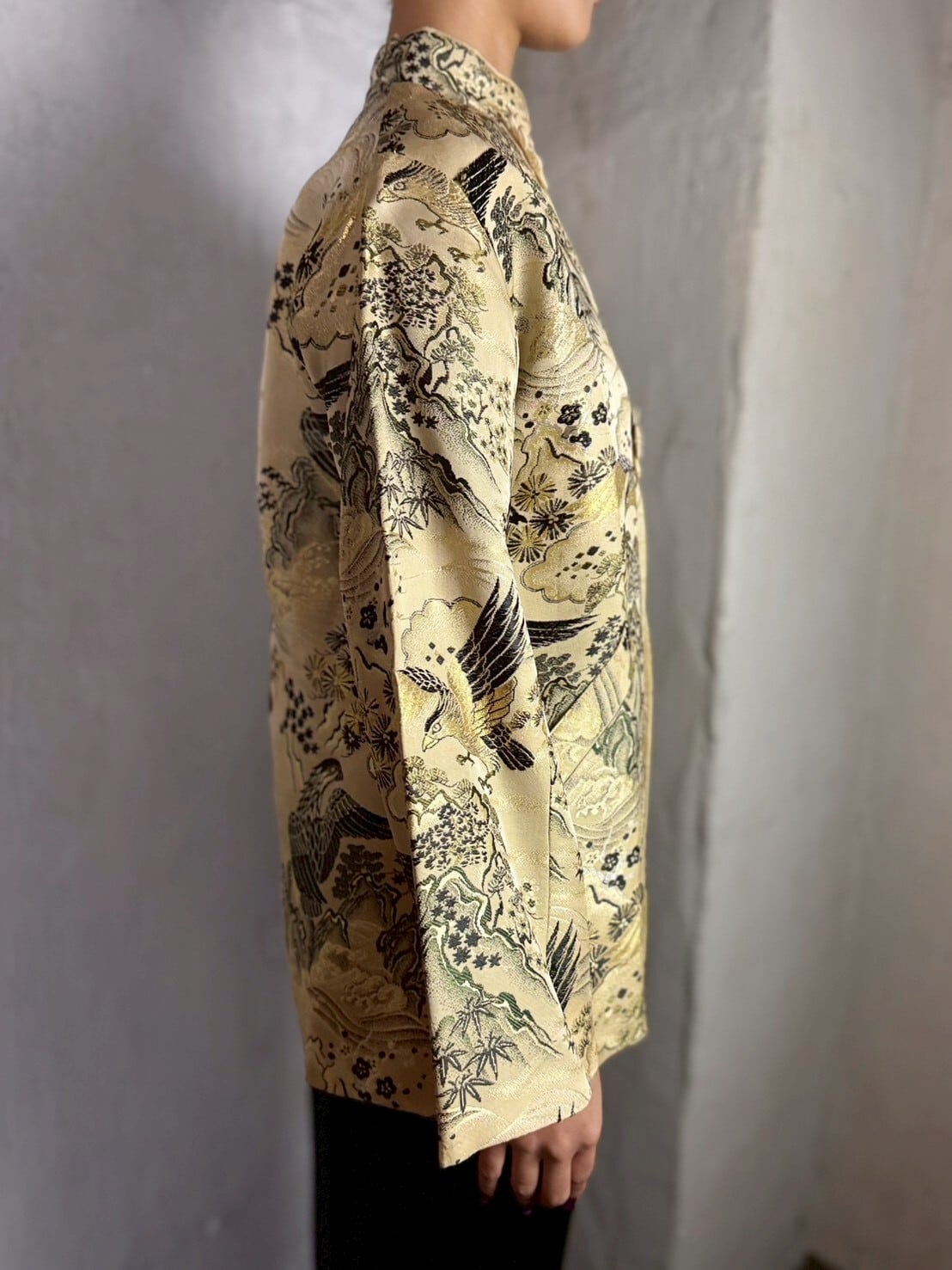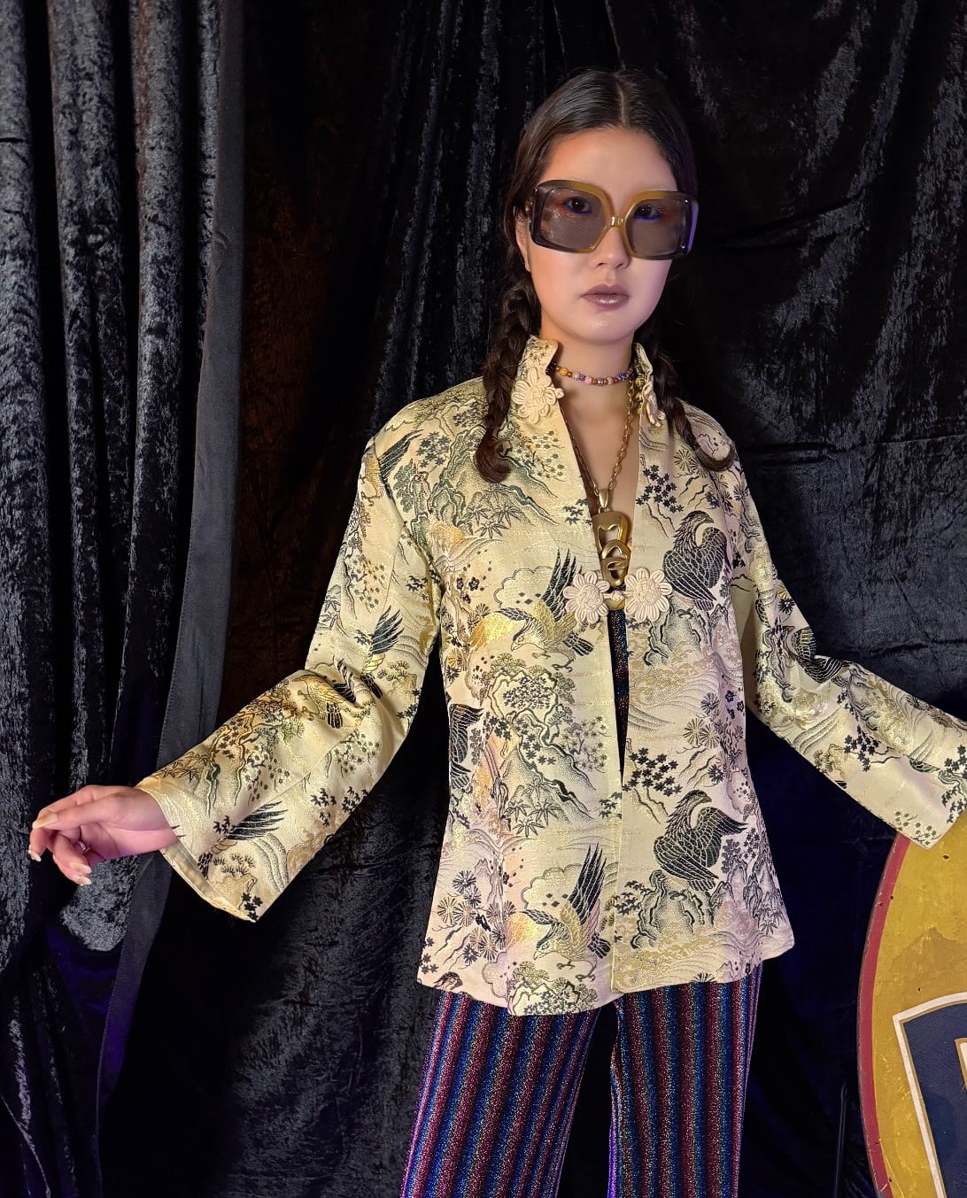 肌馴染みの良いクリームカラーに、奥行きのあるグリーンベースの刺繍が、絵画のような美しい表情を見せてくれます。