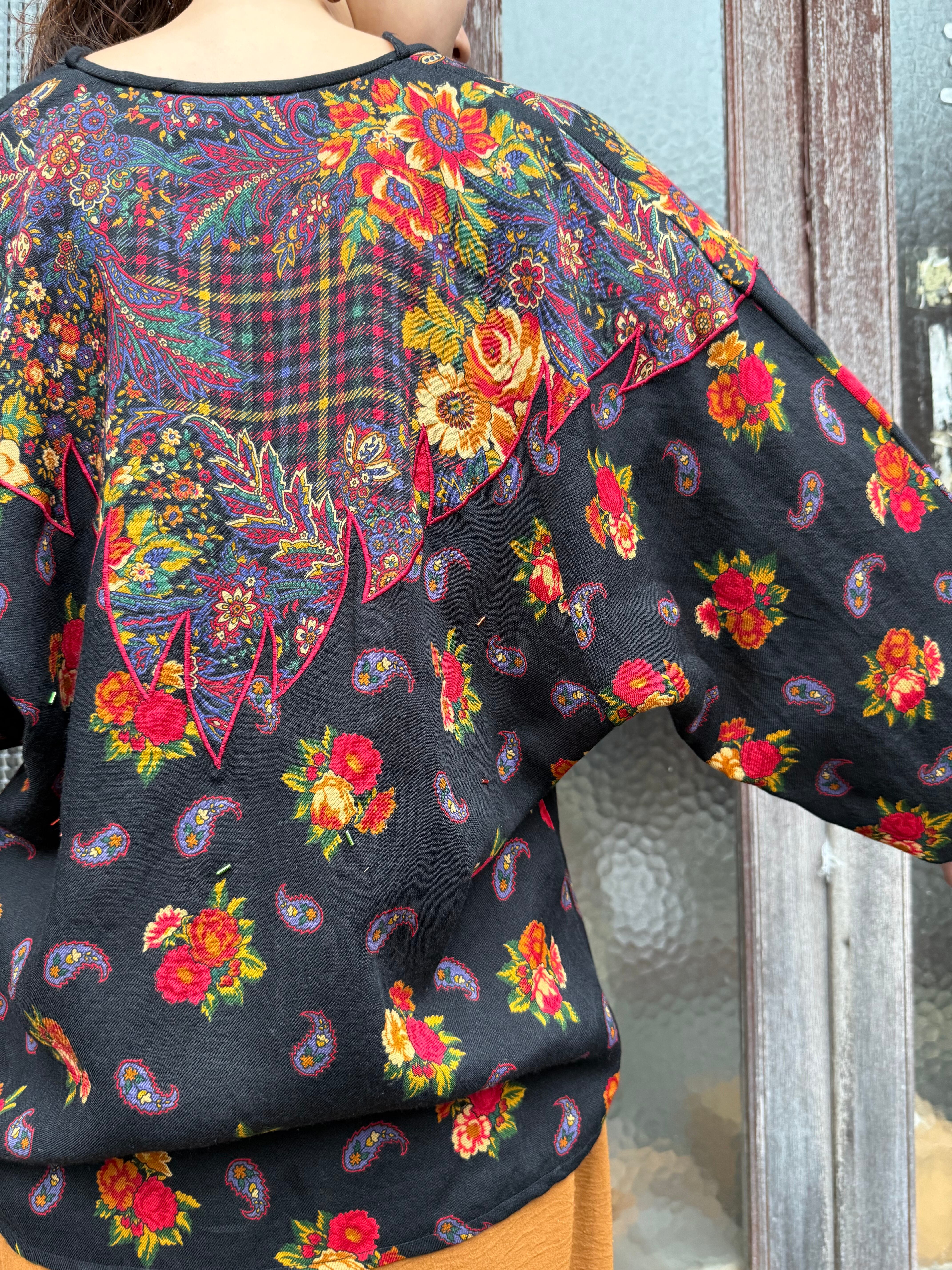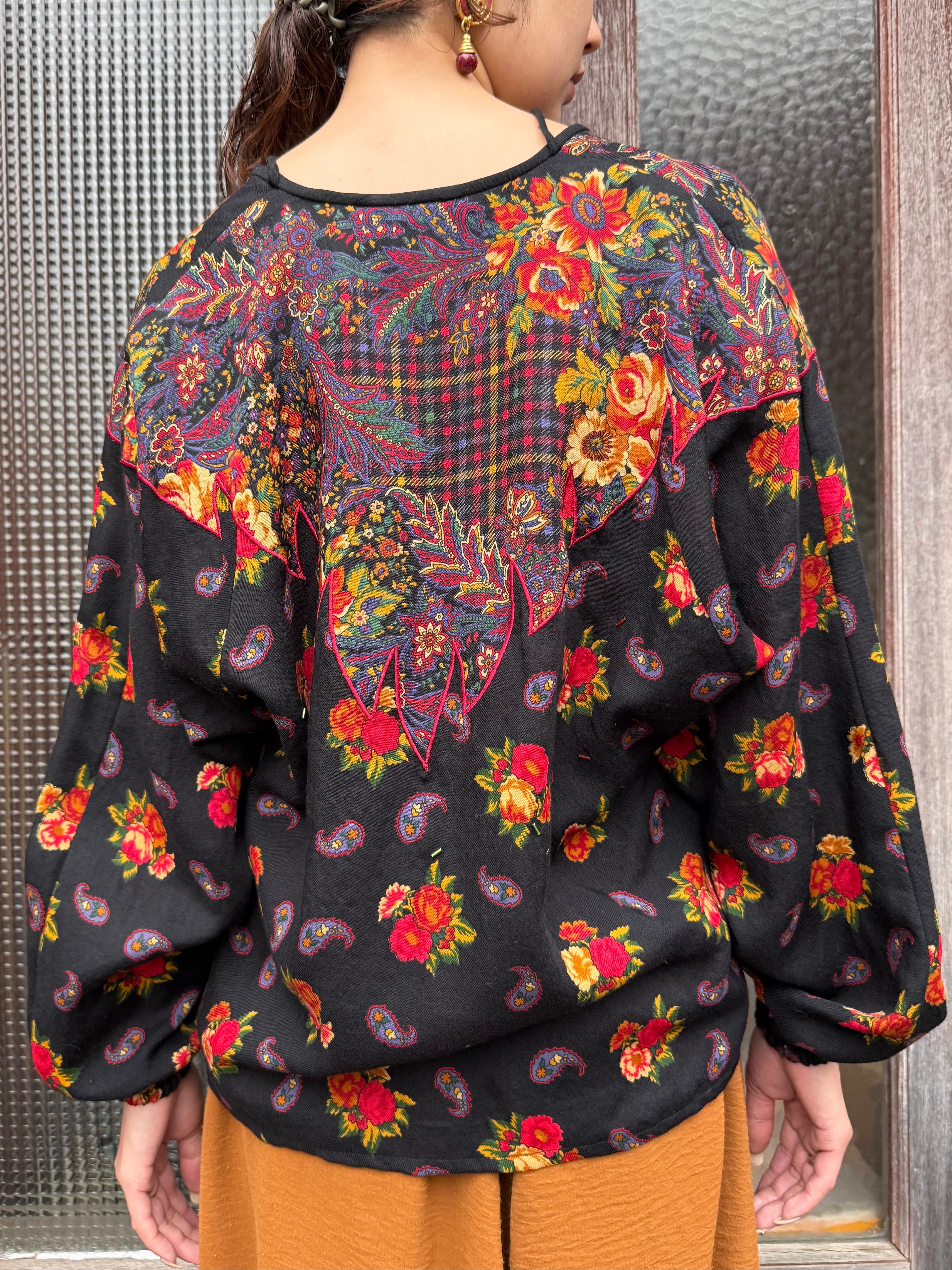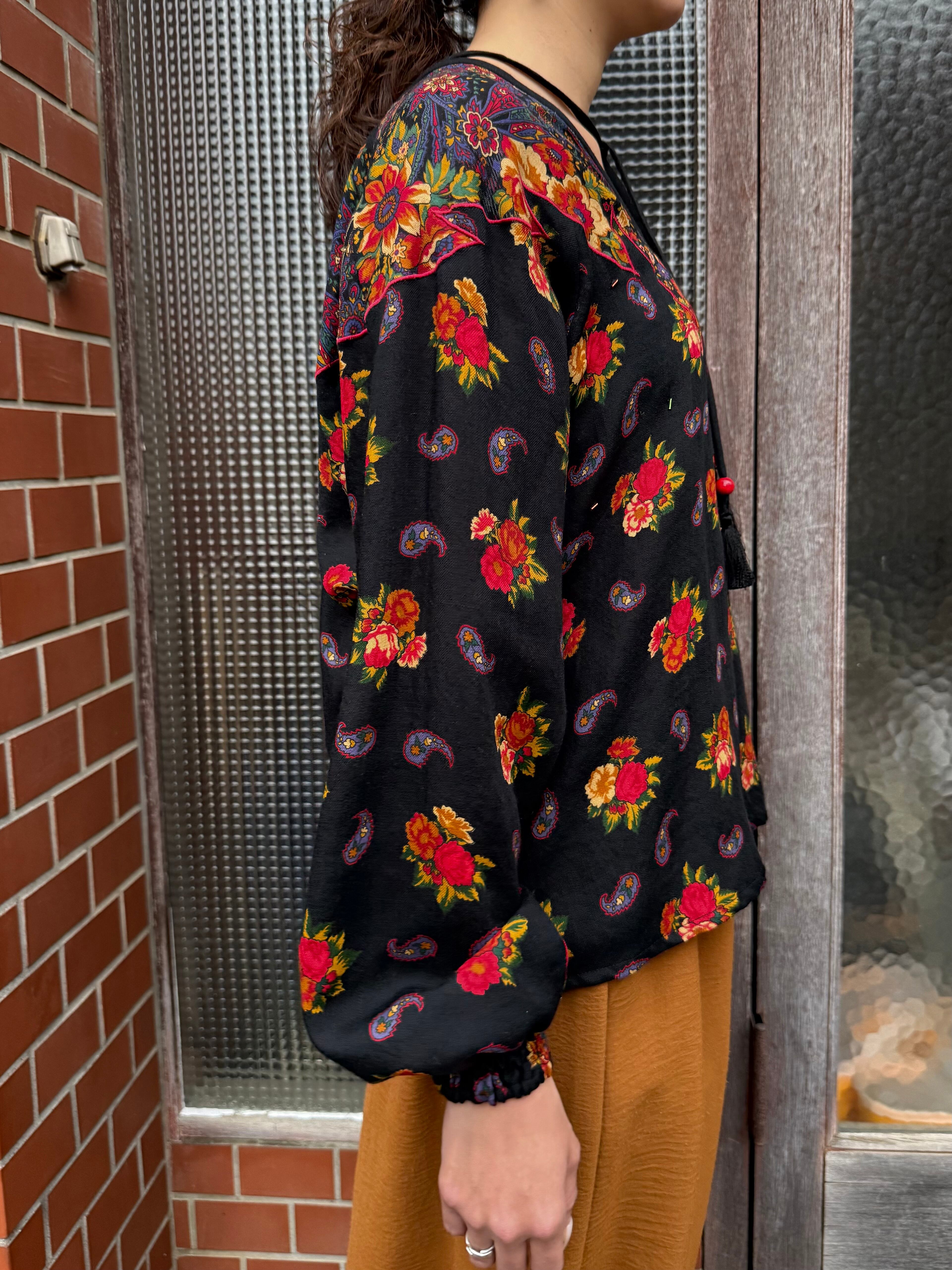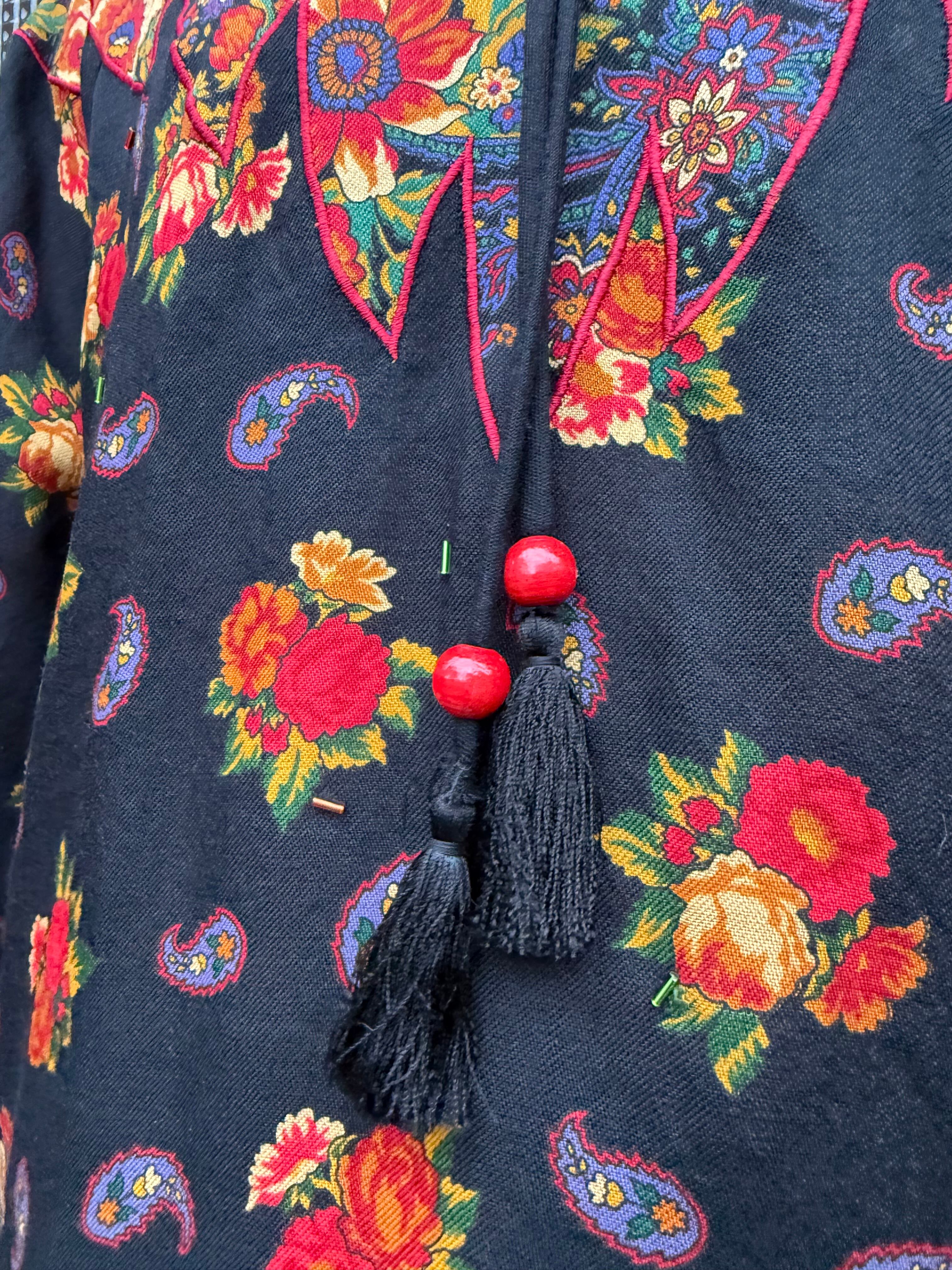 美しいプリントを更に盛り上げるような刺繍や タッセル、そして さりげなく施されたカラフル竹ビーズも嬉しいポイントです。