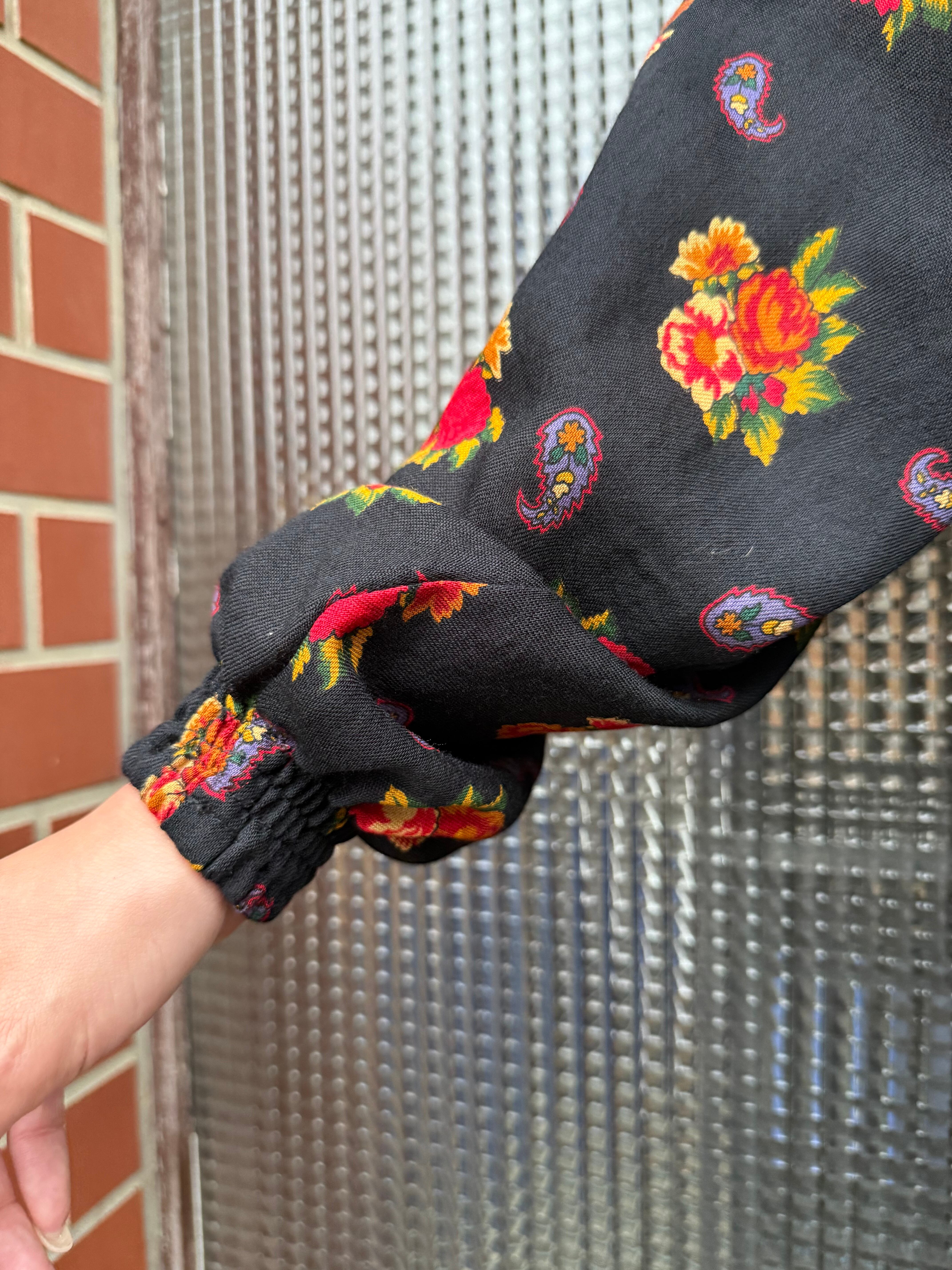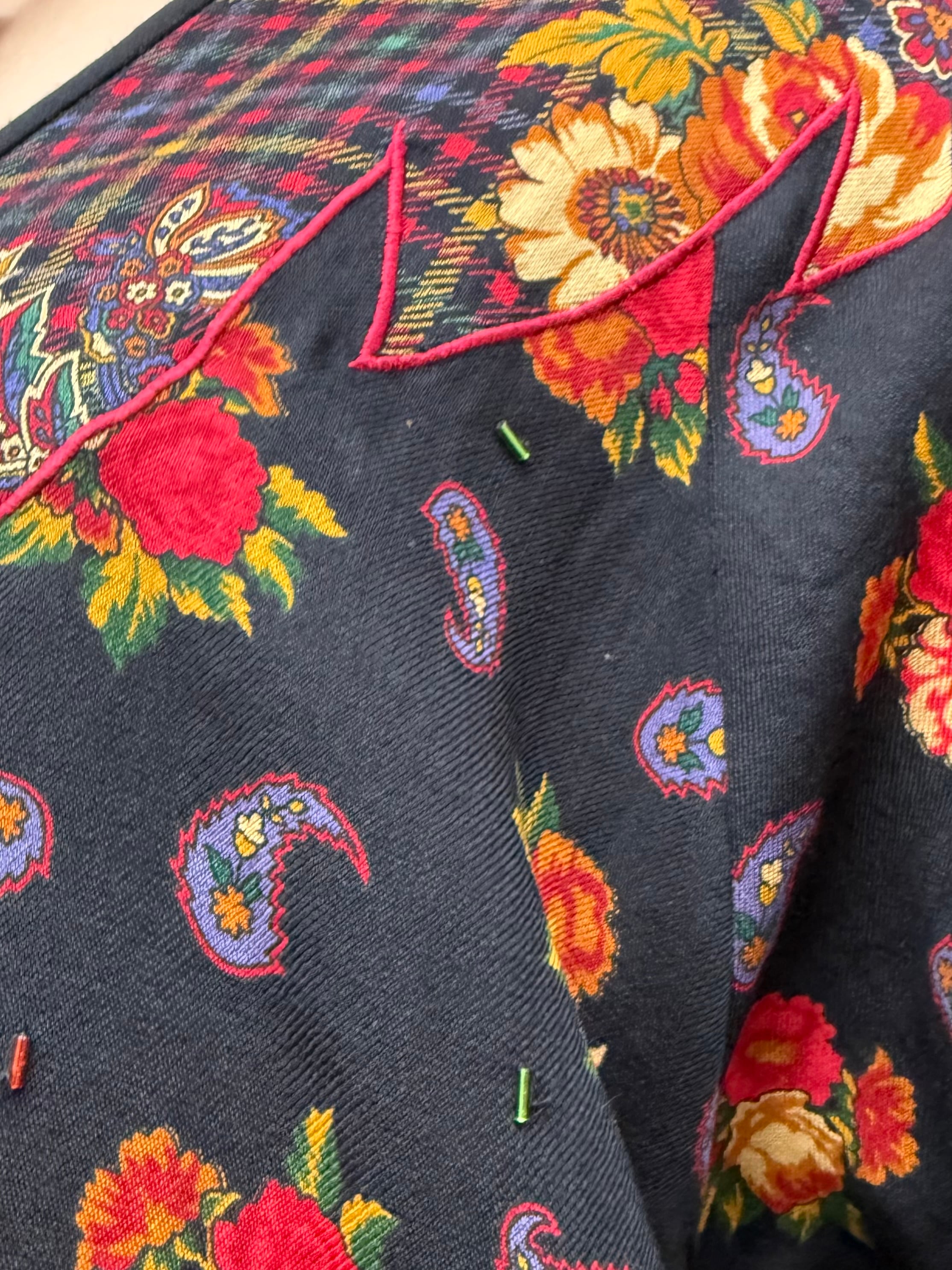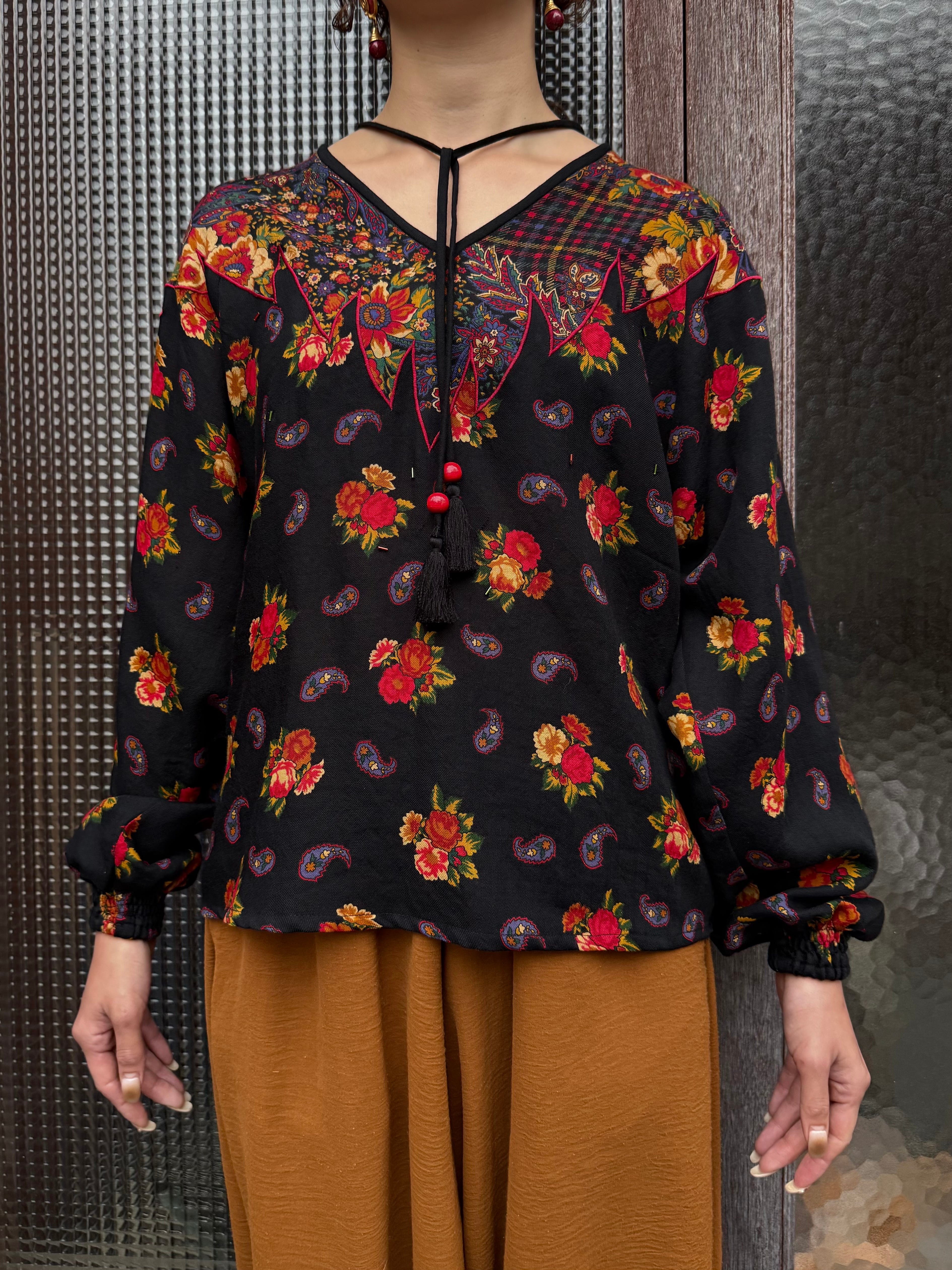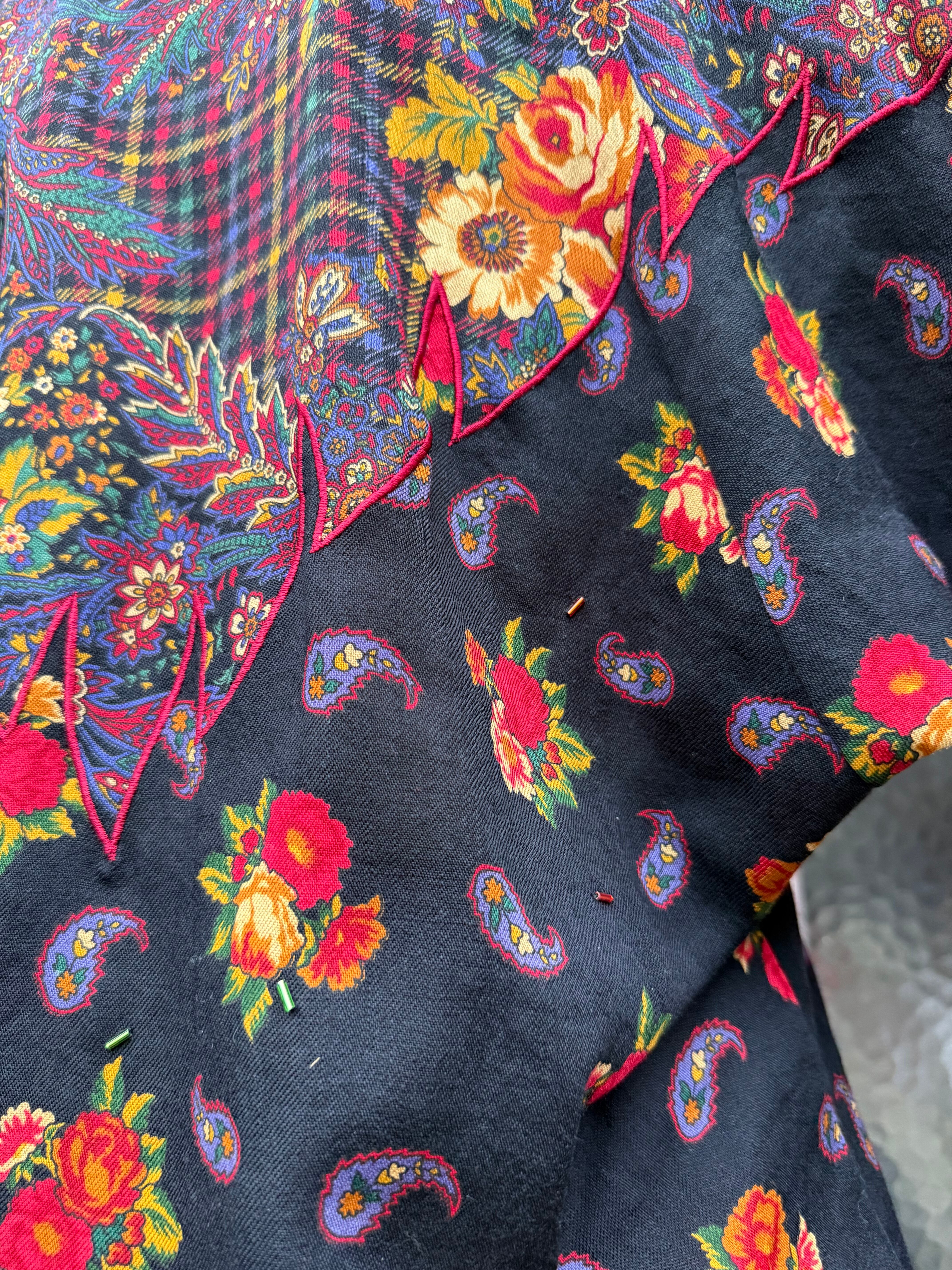 美しいプリントを更に盛り上げるような刺繍や タッセル、そして さりげなく施されたカラフル竹ビーズも嬉しいポイントです。
