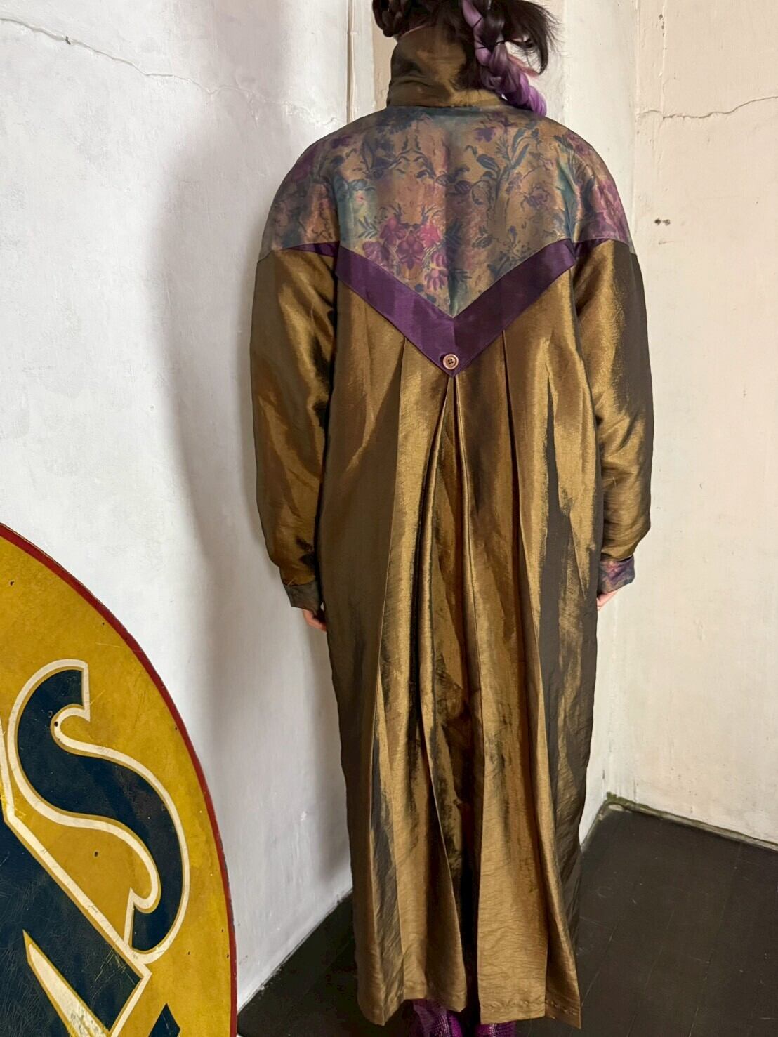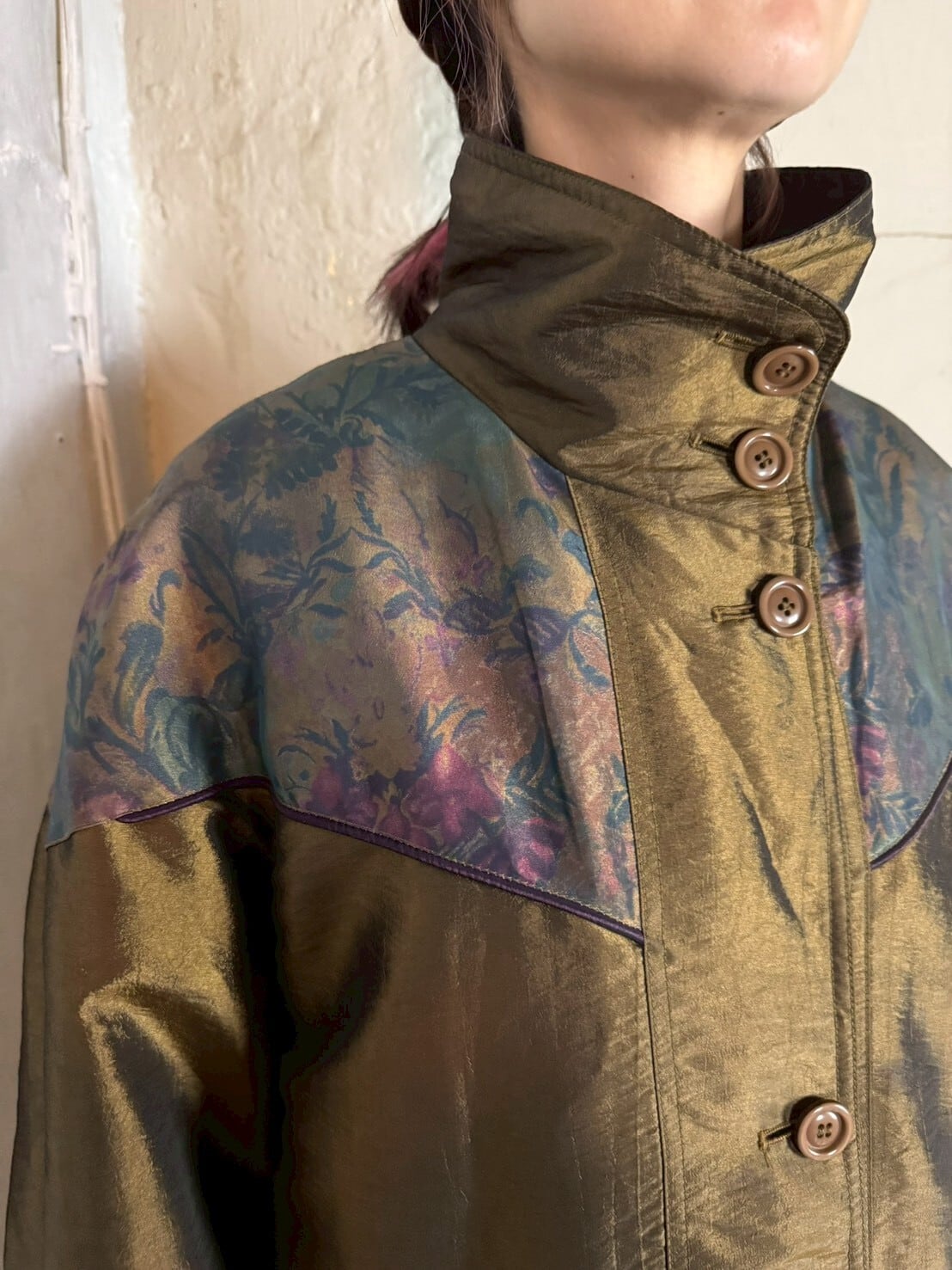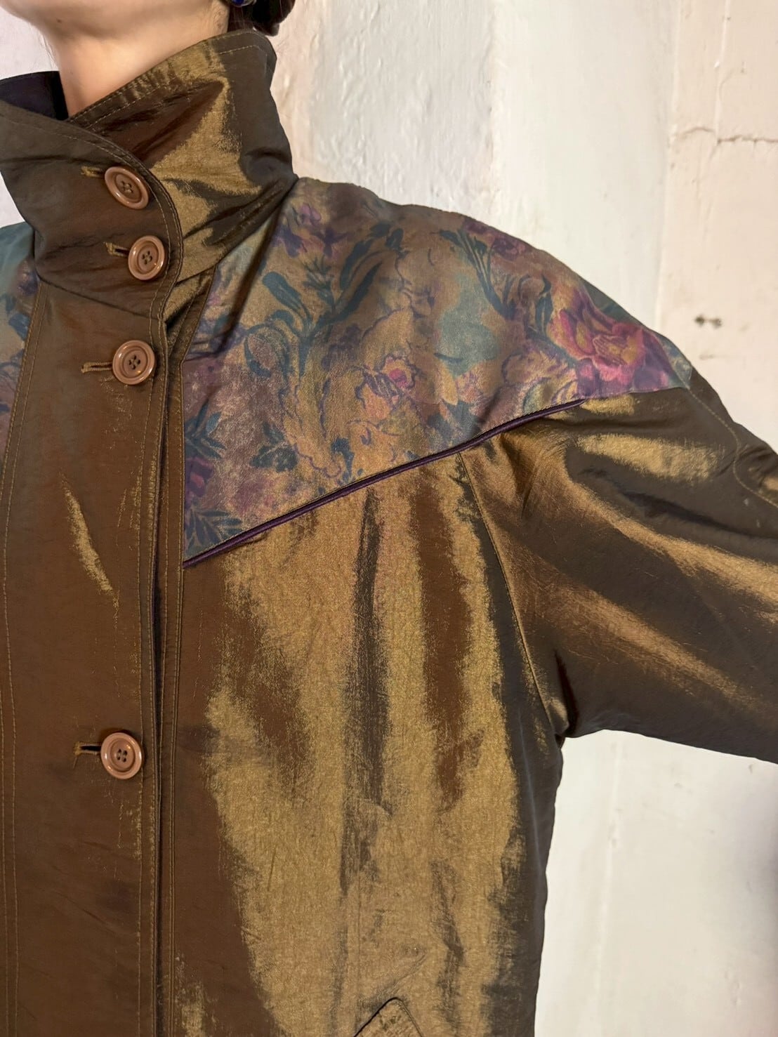 妖しく美しい色彩の玉虫。雰囲気のあるブラウン系とパープル、そしてフラワープリントがミックスされた80’sコート。