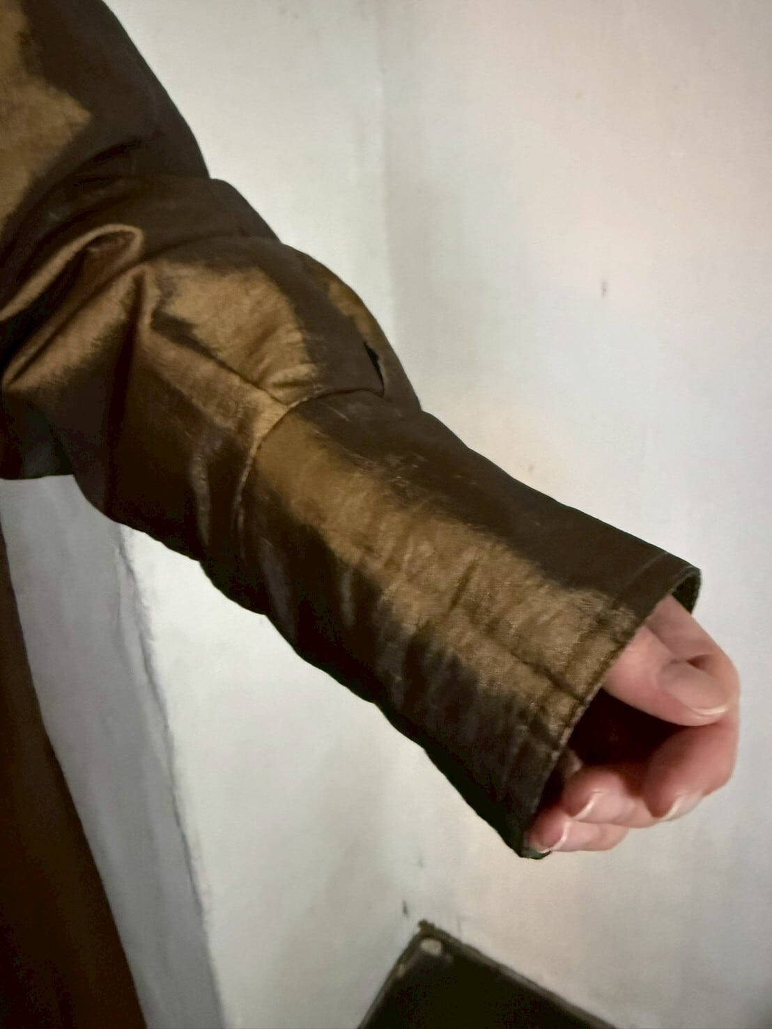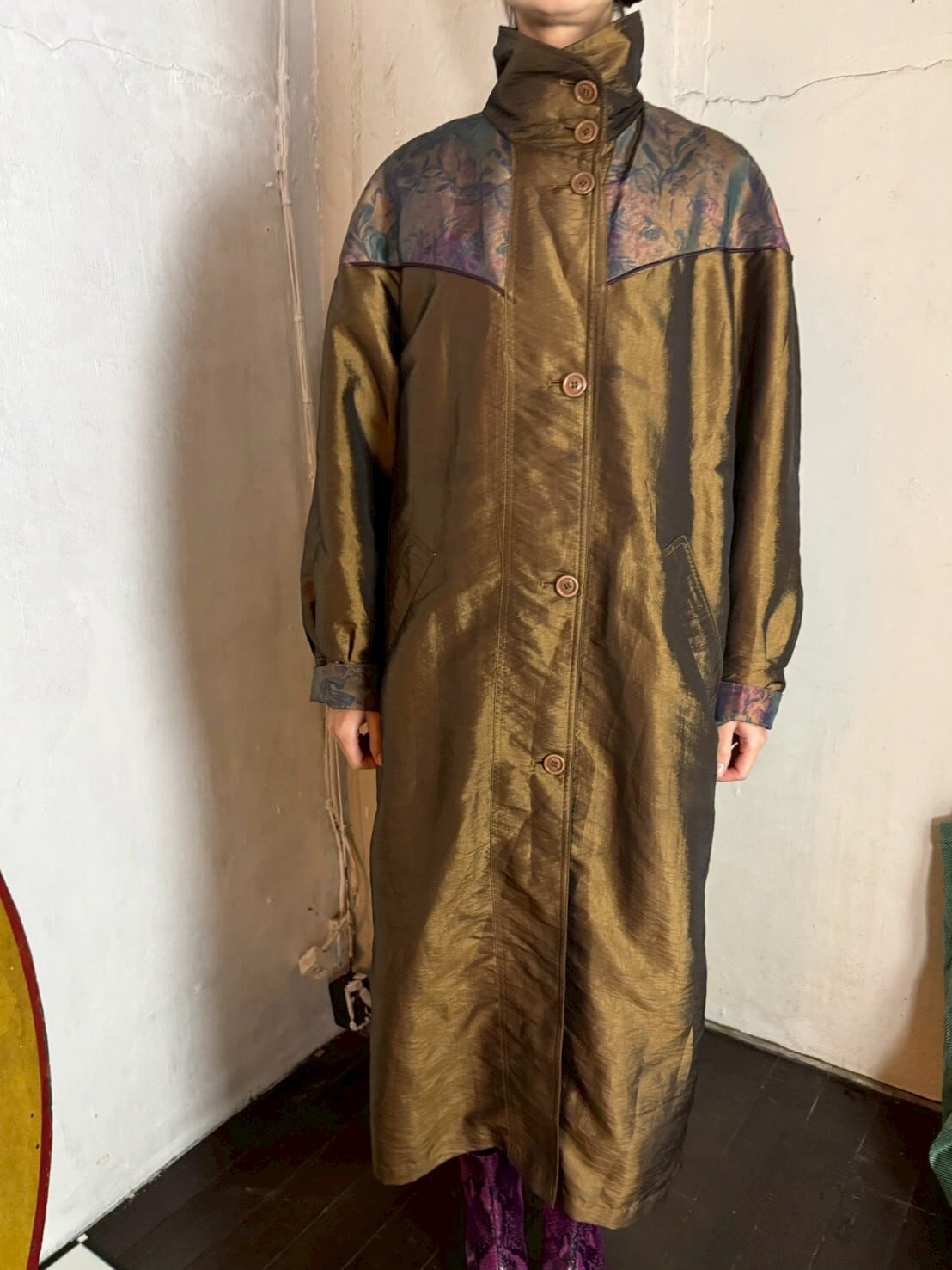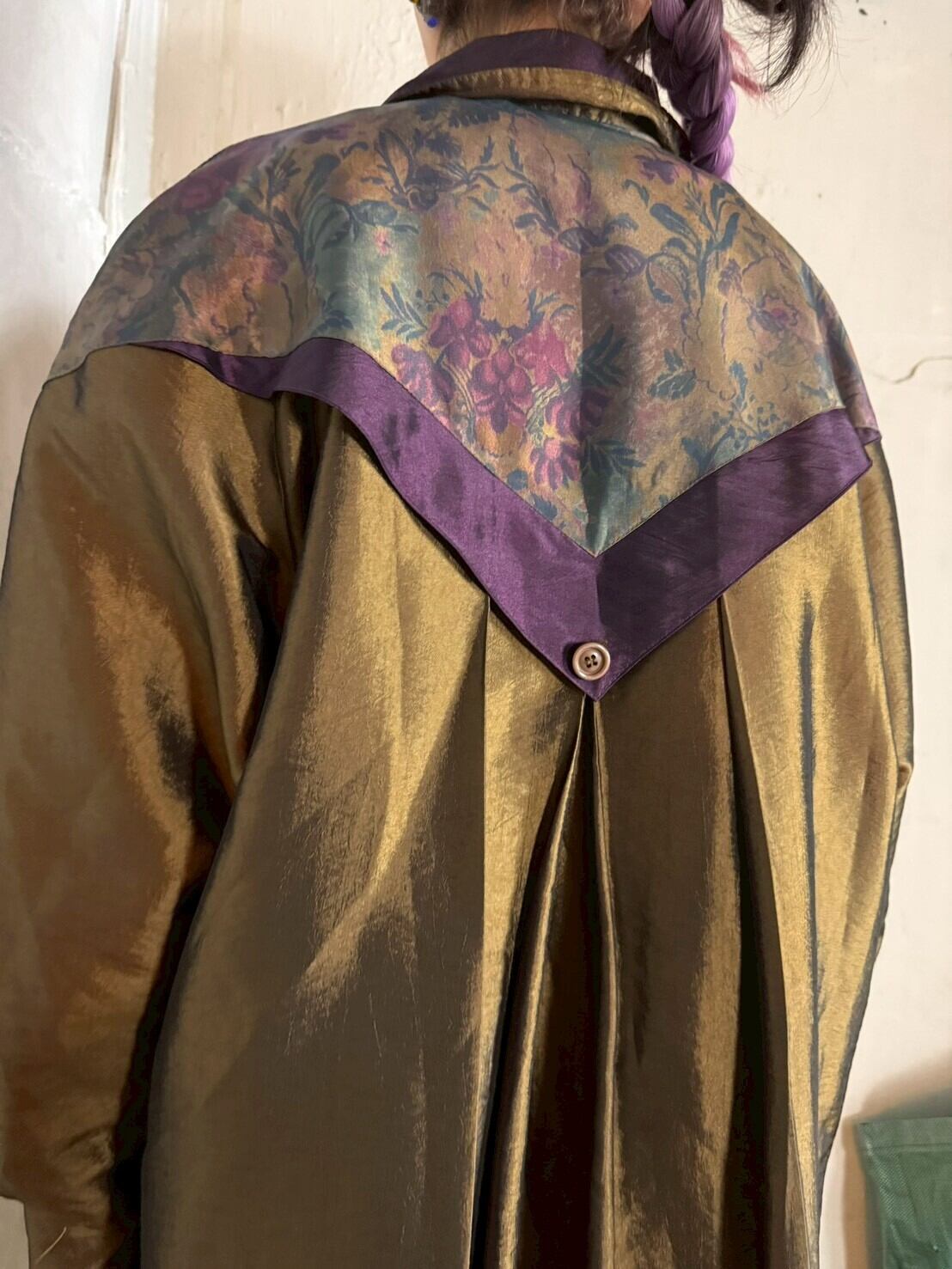 妖しく美しい色彩の玉虫。雰囲気のあるブラウン系とパープル、そしてフラワープリントがミックスされた80’sコート。