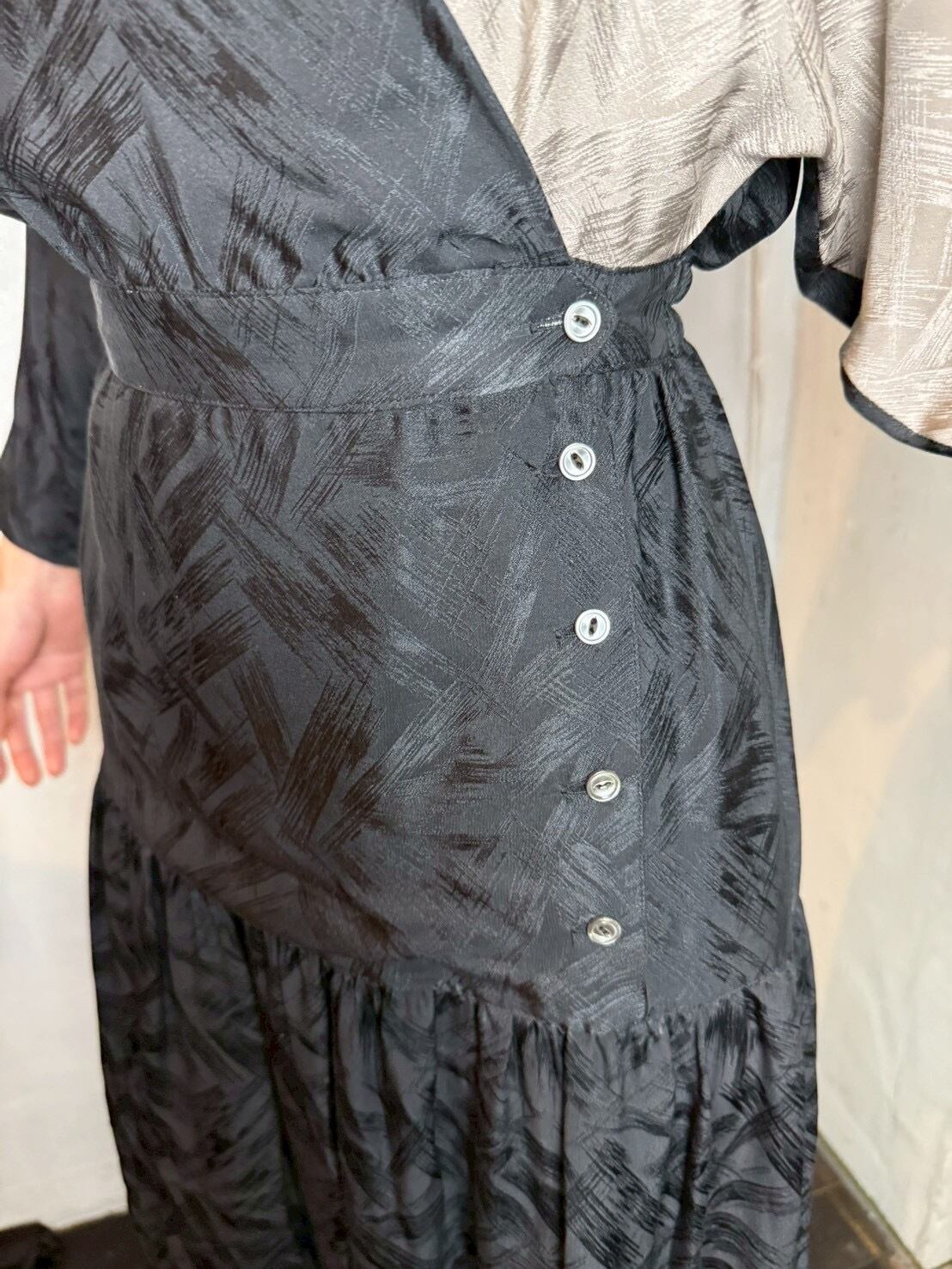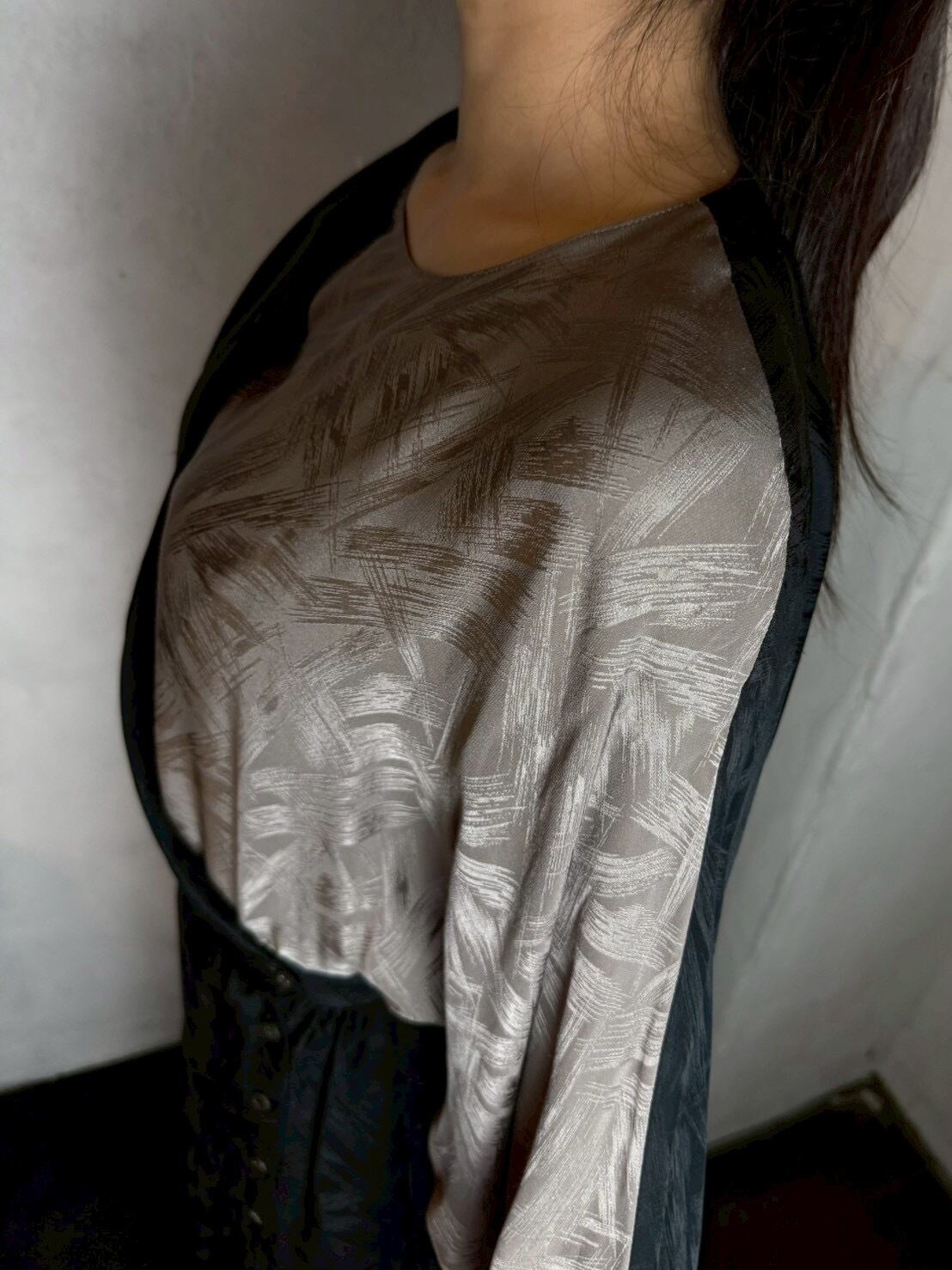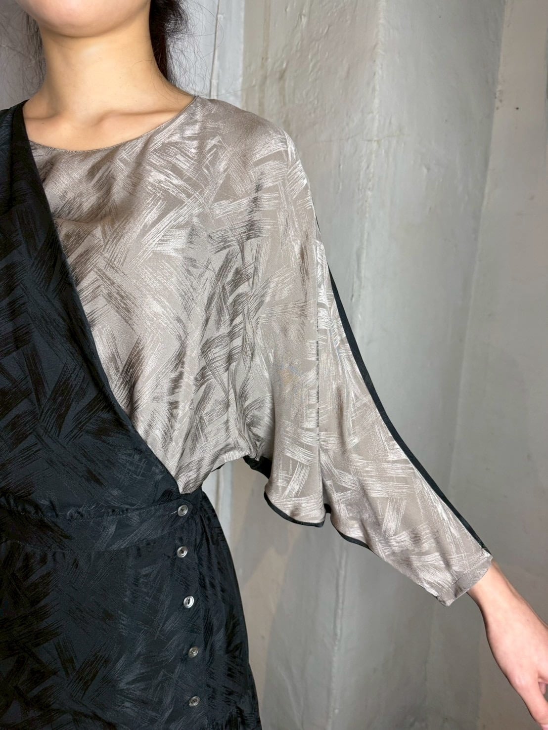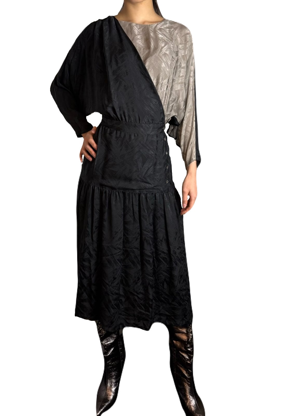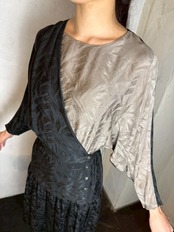 ブラック x グレージュの潔い 80’s バイカラーワンピース。織柄入りの上質なシルクテキスタイルで、華やかさの中に存在感をプラスしています。
