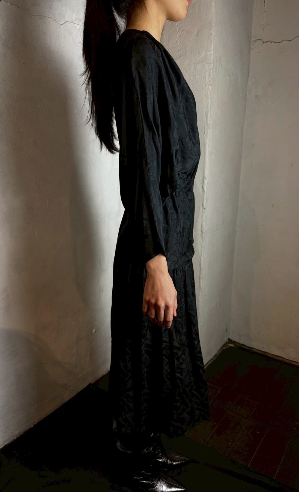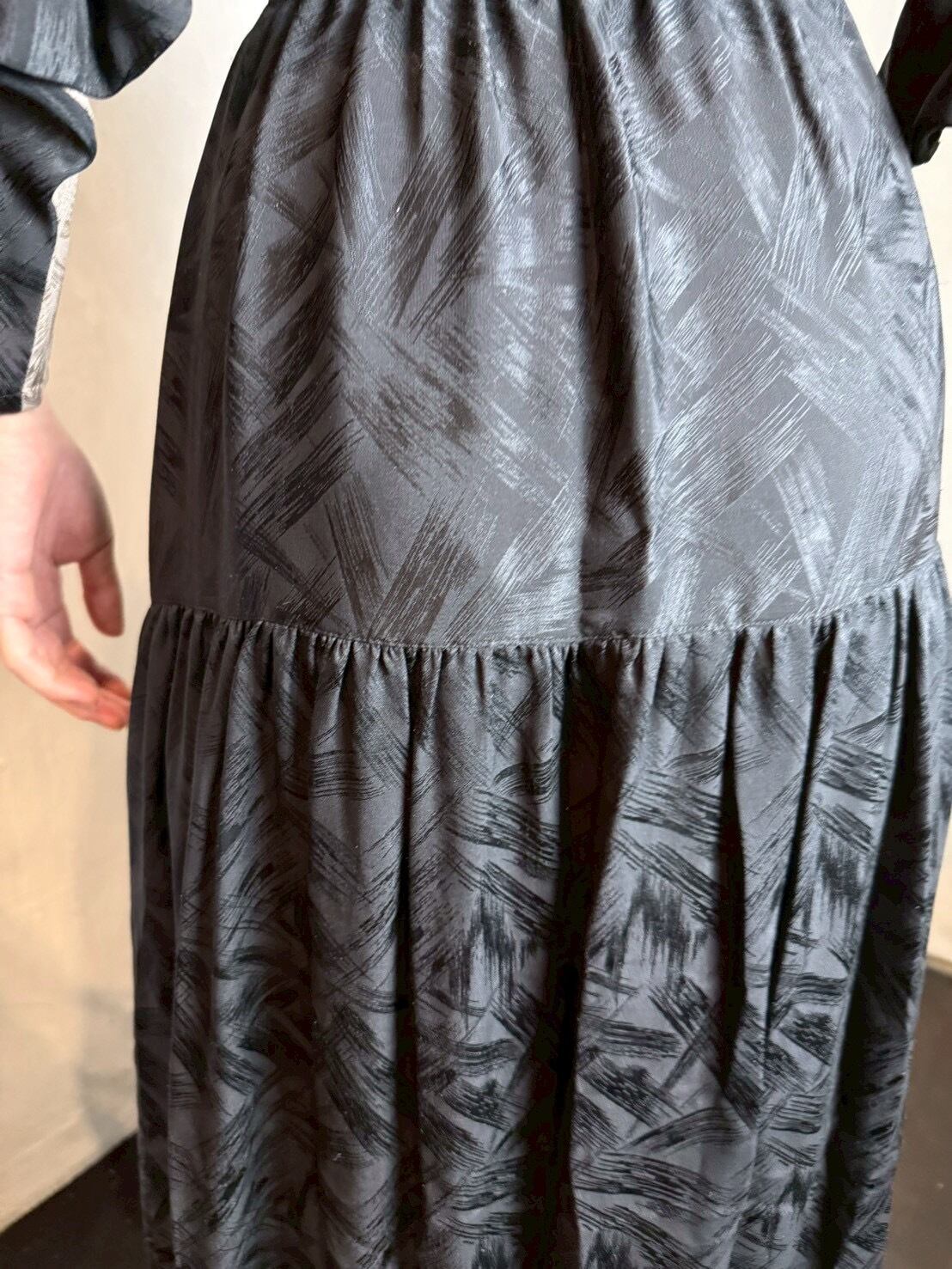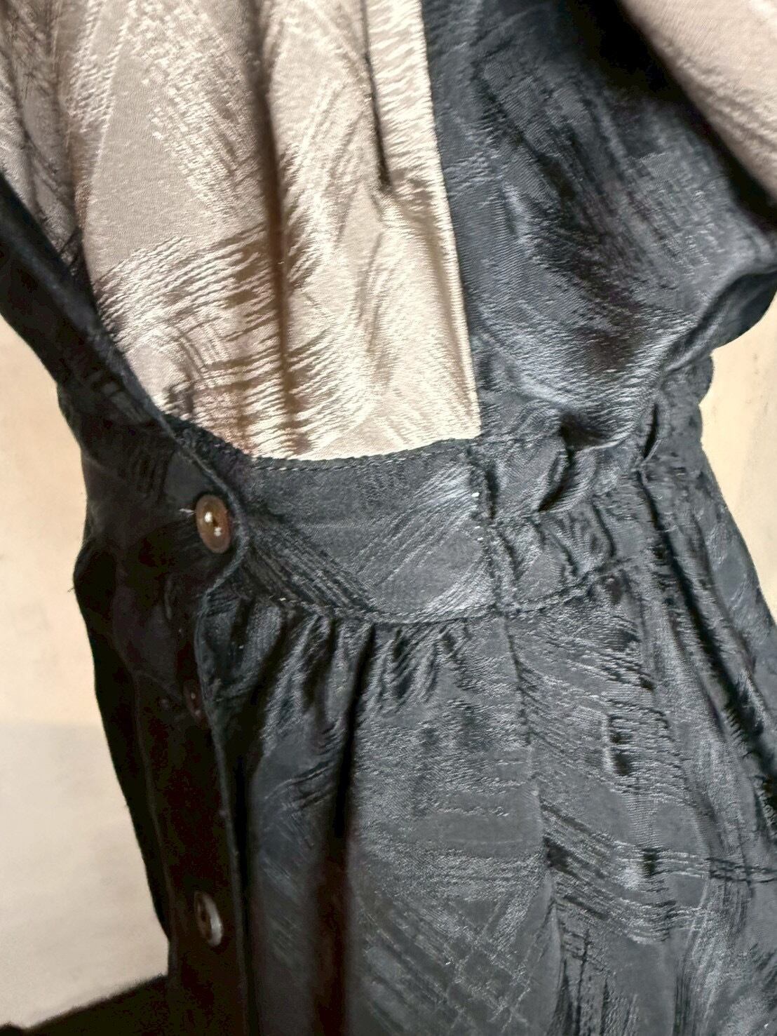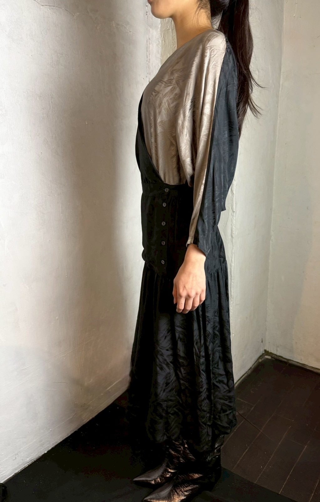 ブラック x グレージュの潔い 80’s バイカラーワンピース。織柄入りの上質なシルクテキスタイルで、華やかさの中に存在感をプラスしています。