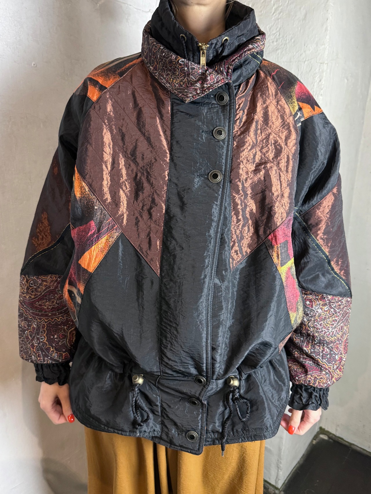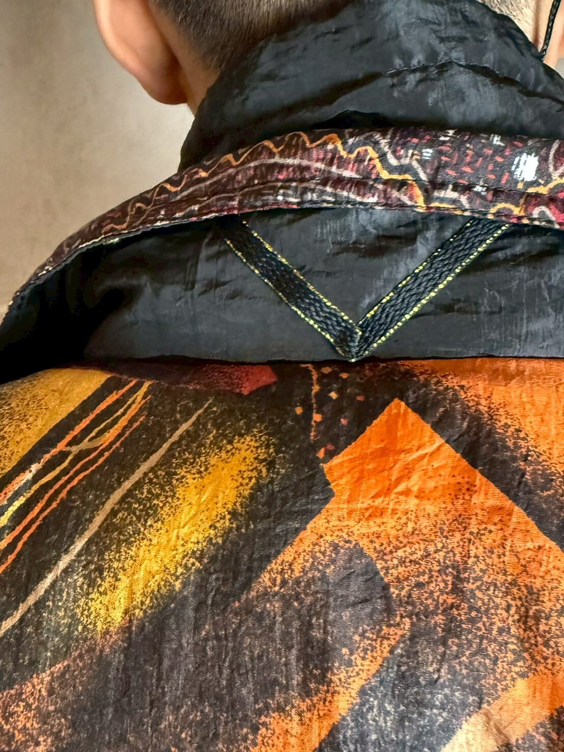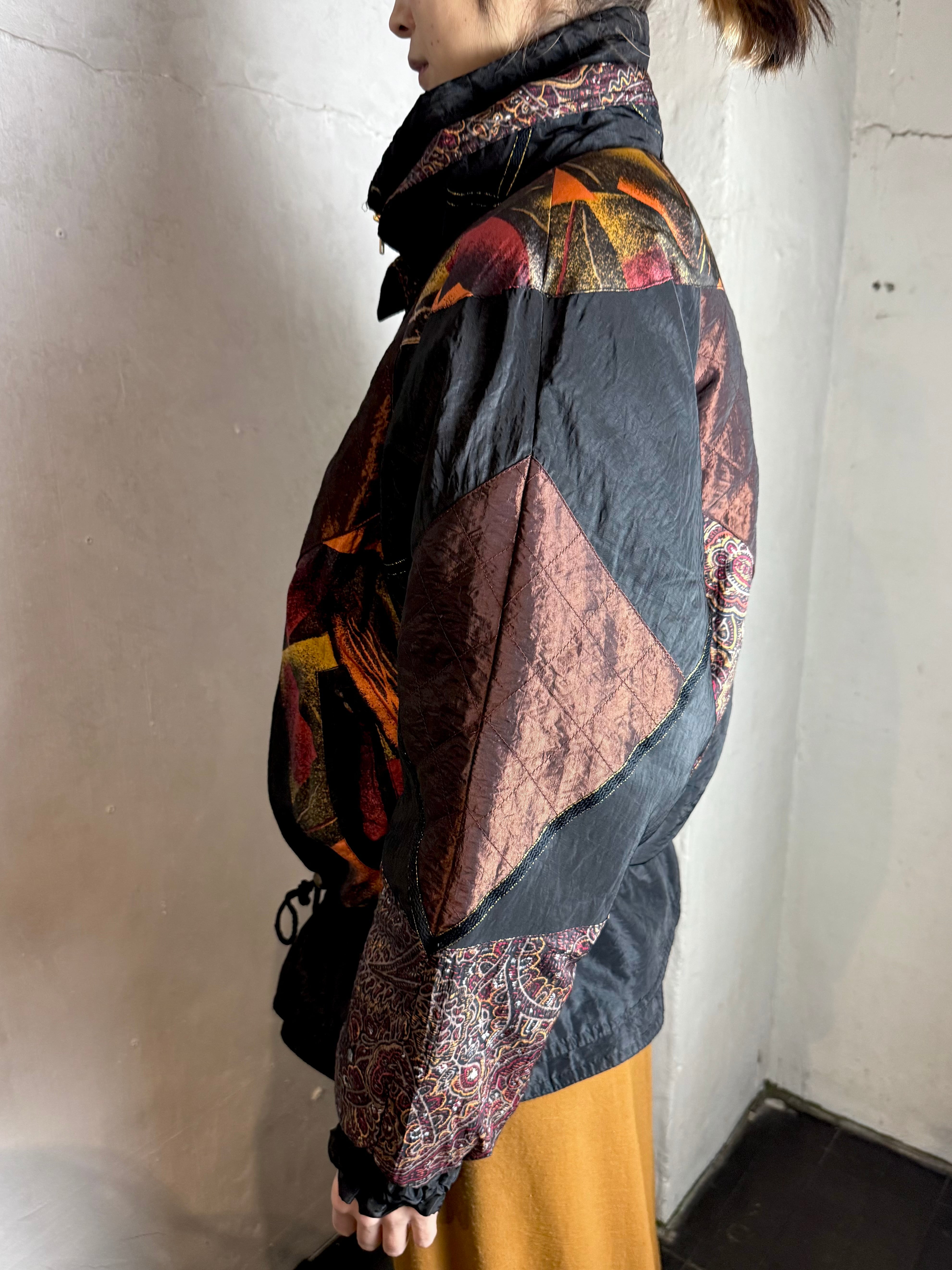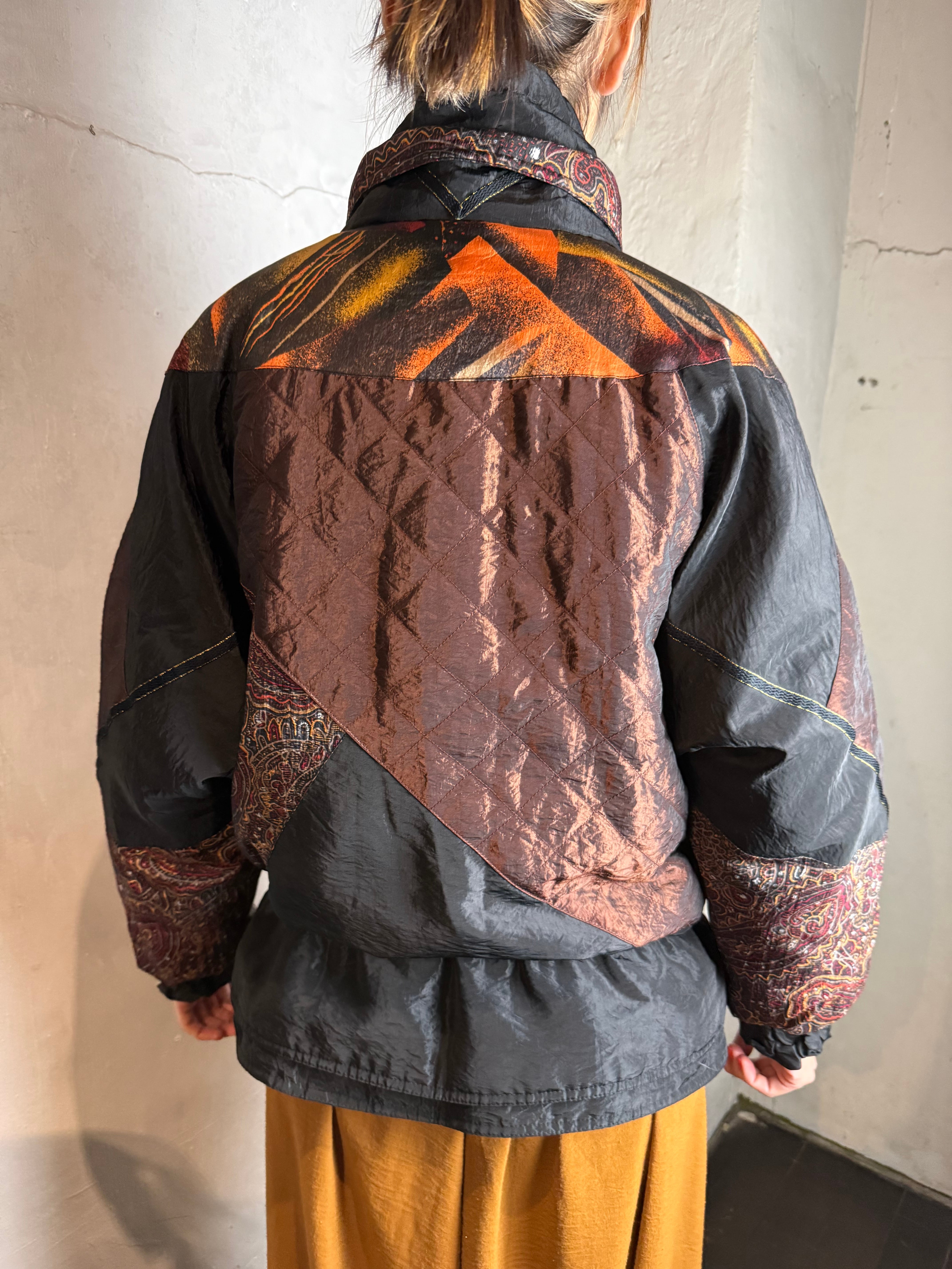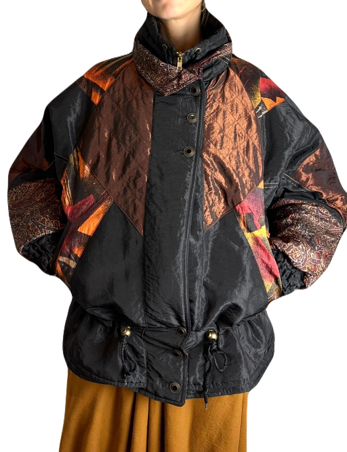 ブラックとブラウンのコーデに合わせやすいカラーリング。冬の乾いた空気に綺麗に映える暖色の差し色も加えたジオメトリックアートのような中綿入りジャケット。