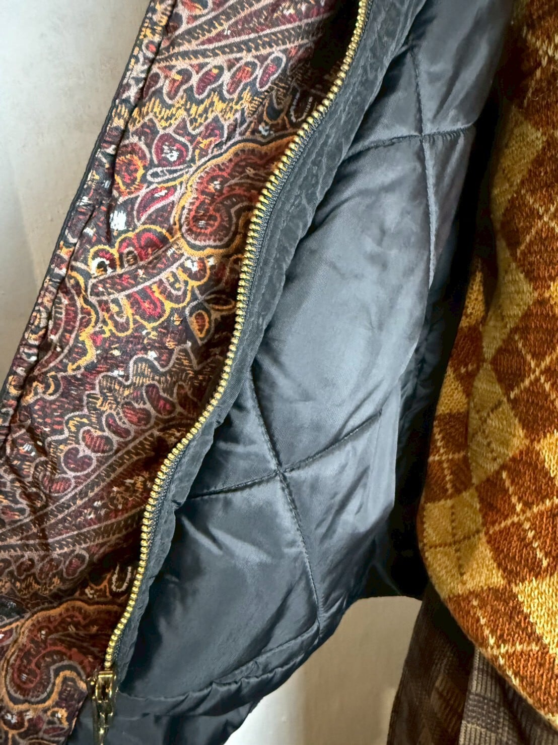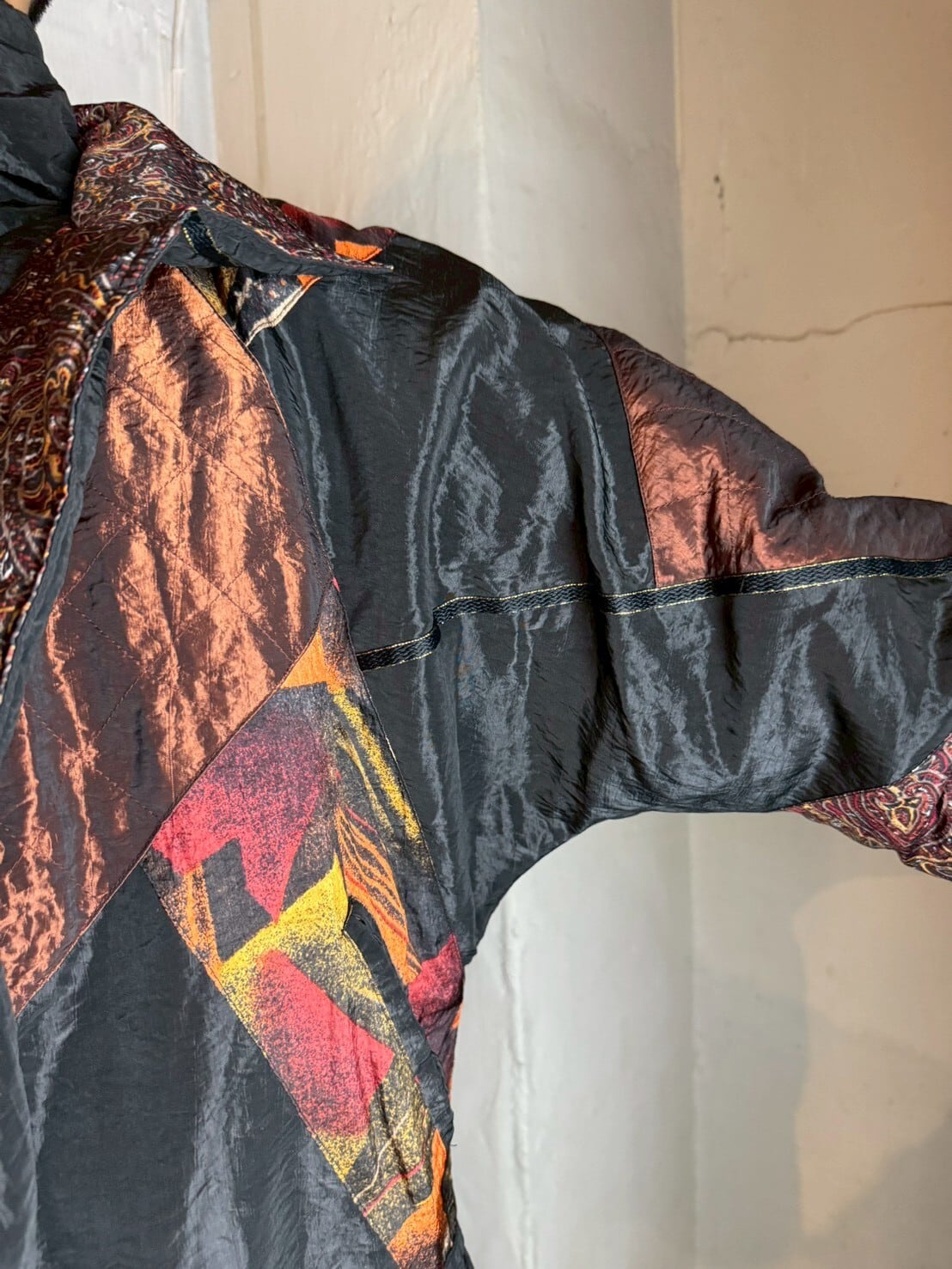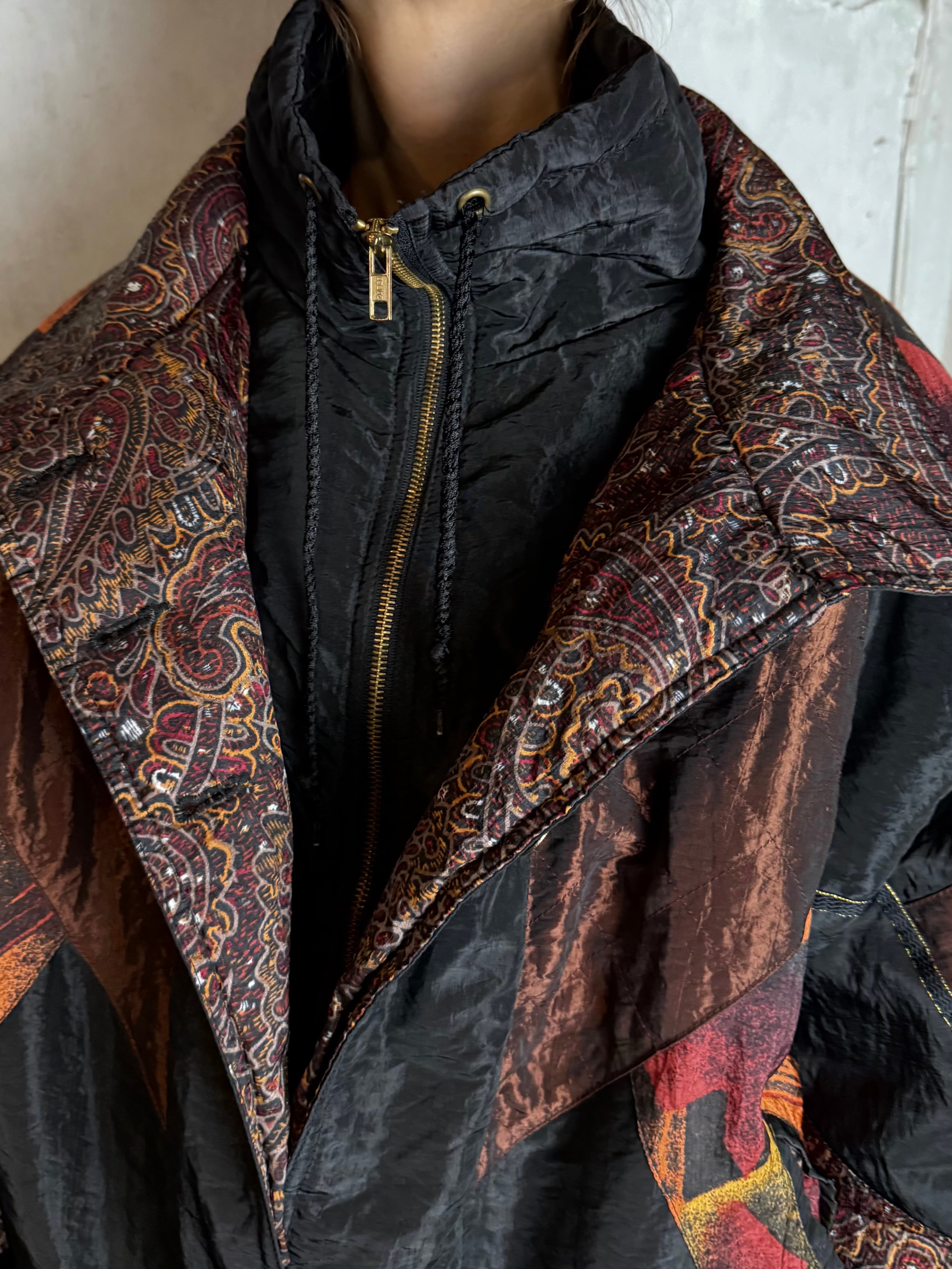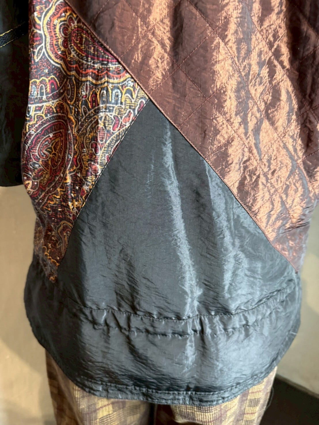 ブラックとブラウンのコーデに合わせやすいカラーリング。冬の乾いた空気に綺麗に映える暖色の差し色も加えたジオメトリックアートのような中綿入りジャケット。