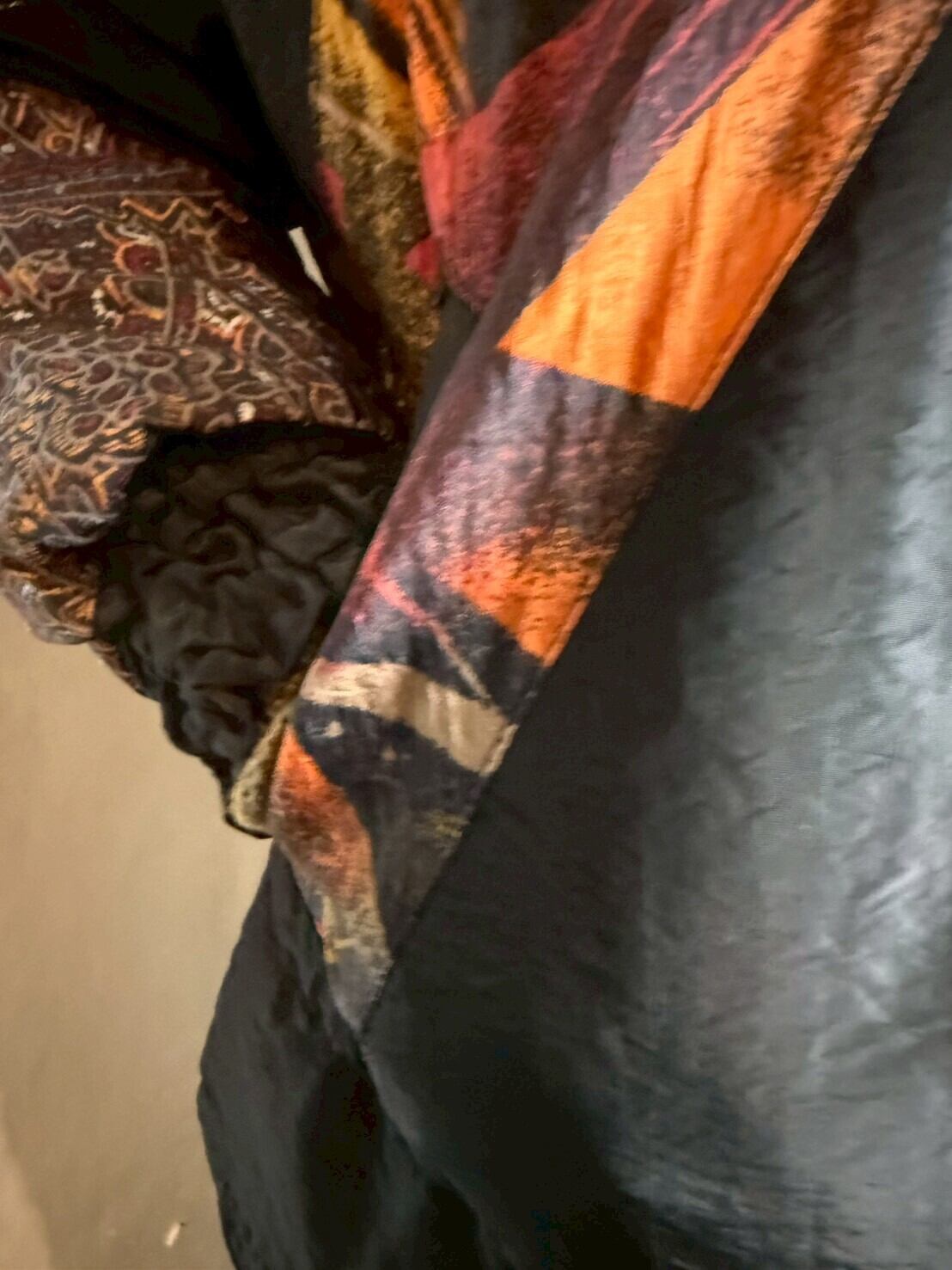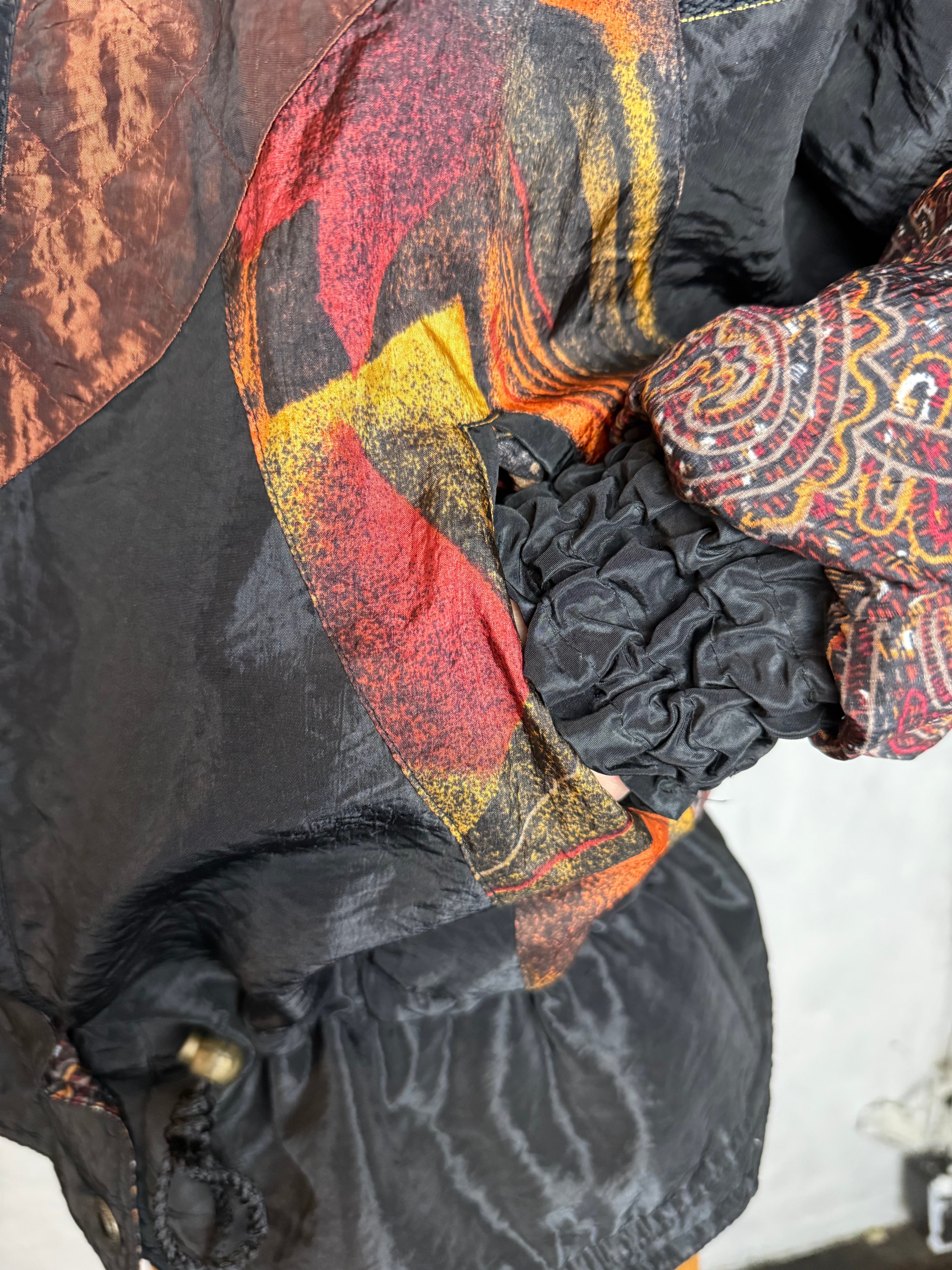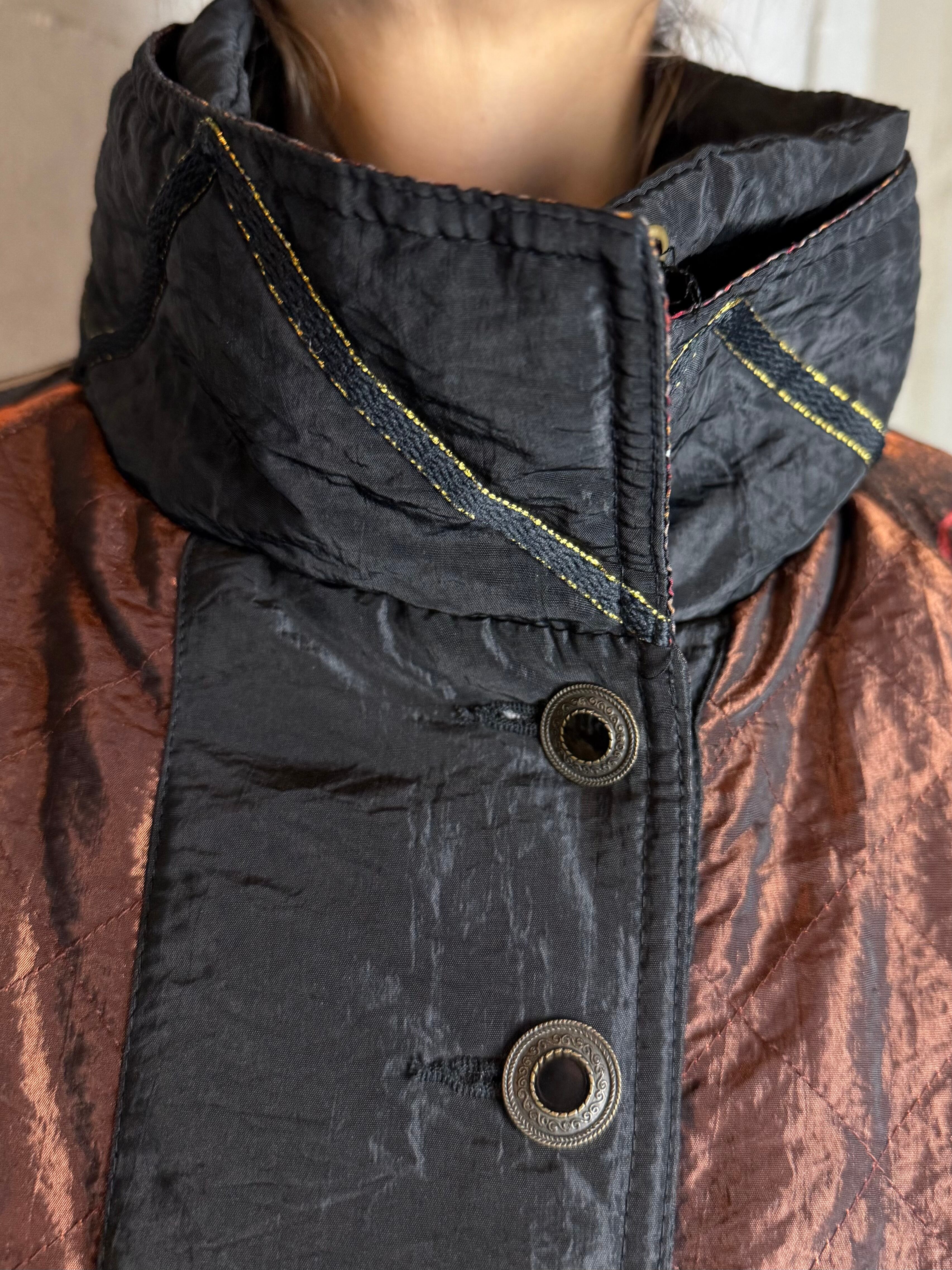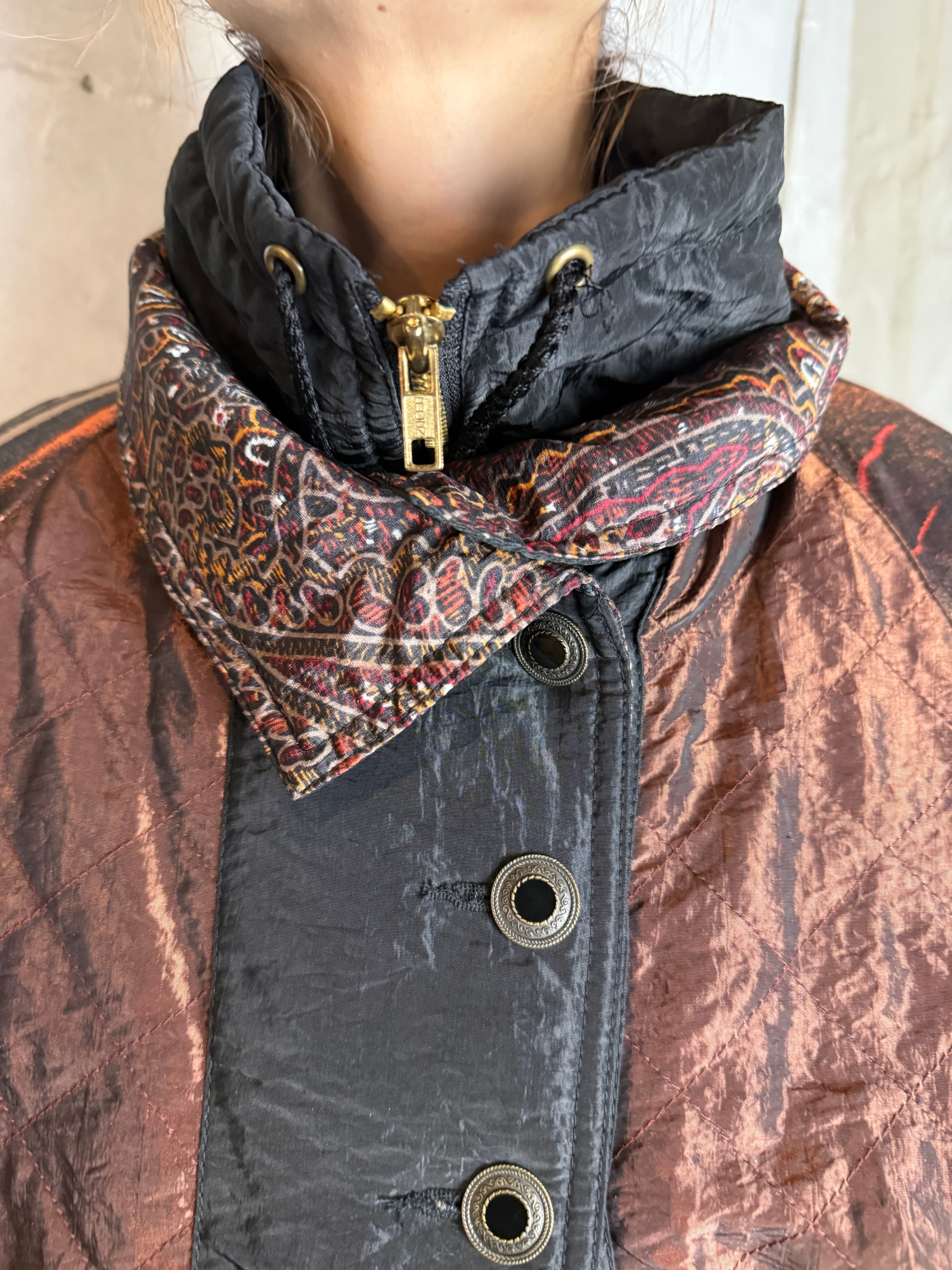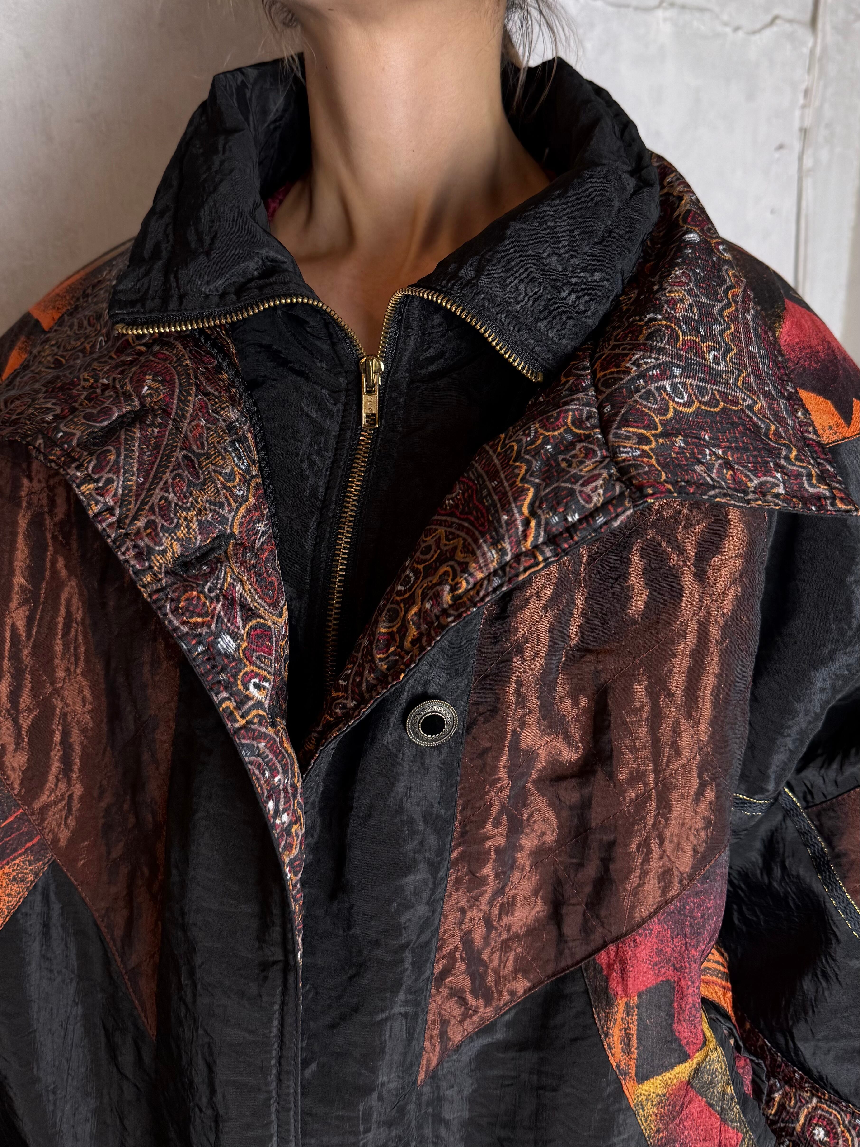 ブラックとブラウンのコーデに合わせやすいカラーリング。冬の乾いた空気に綺麗に映える暖色の差し色も加えたジオメトリックアートのような中綿入りジャケット。