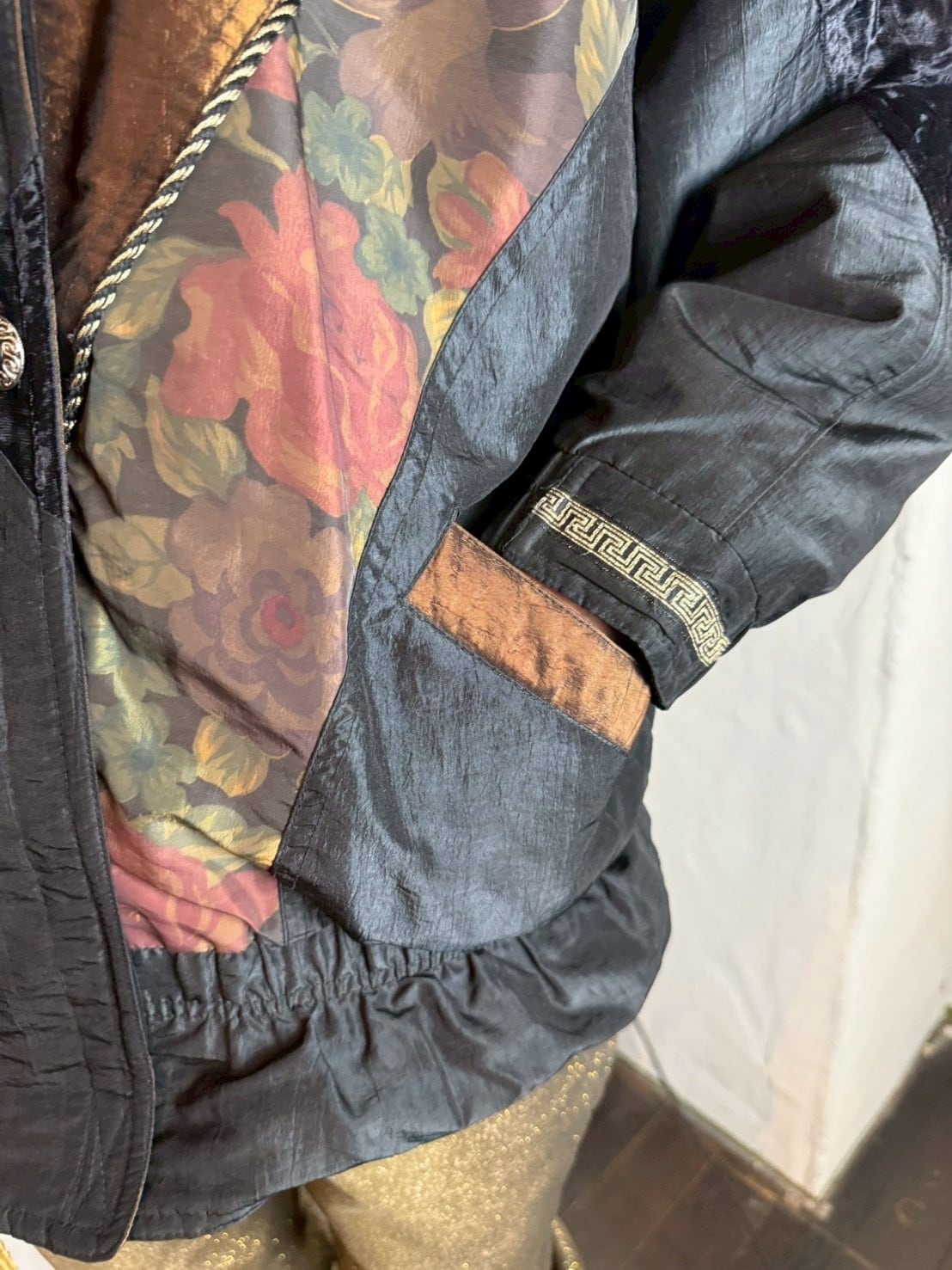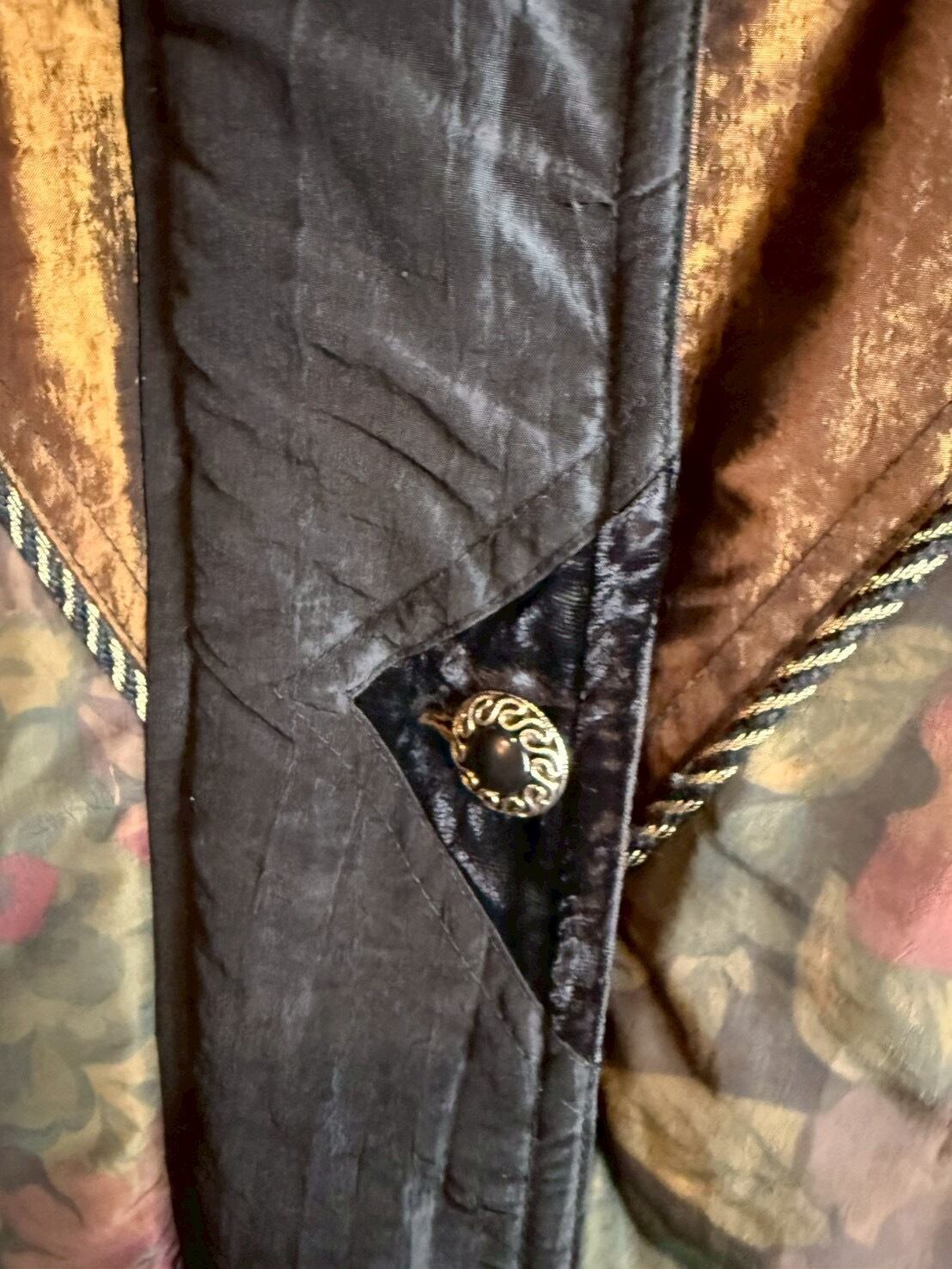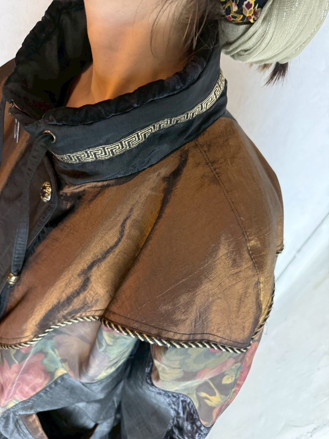 柔らかな光沢のある 玉虫ブラウンの生地やブレード、アンティーク感のあるボタンがアクセントになり、素敵な奥行きを作っています。