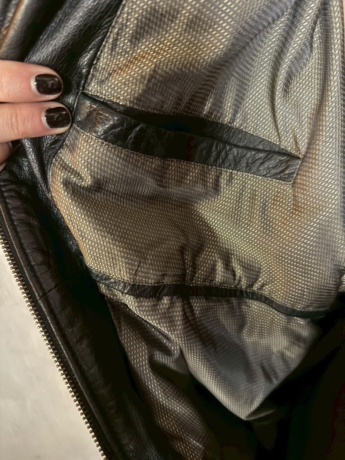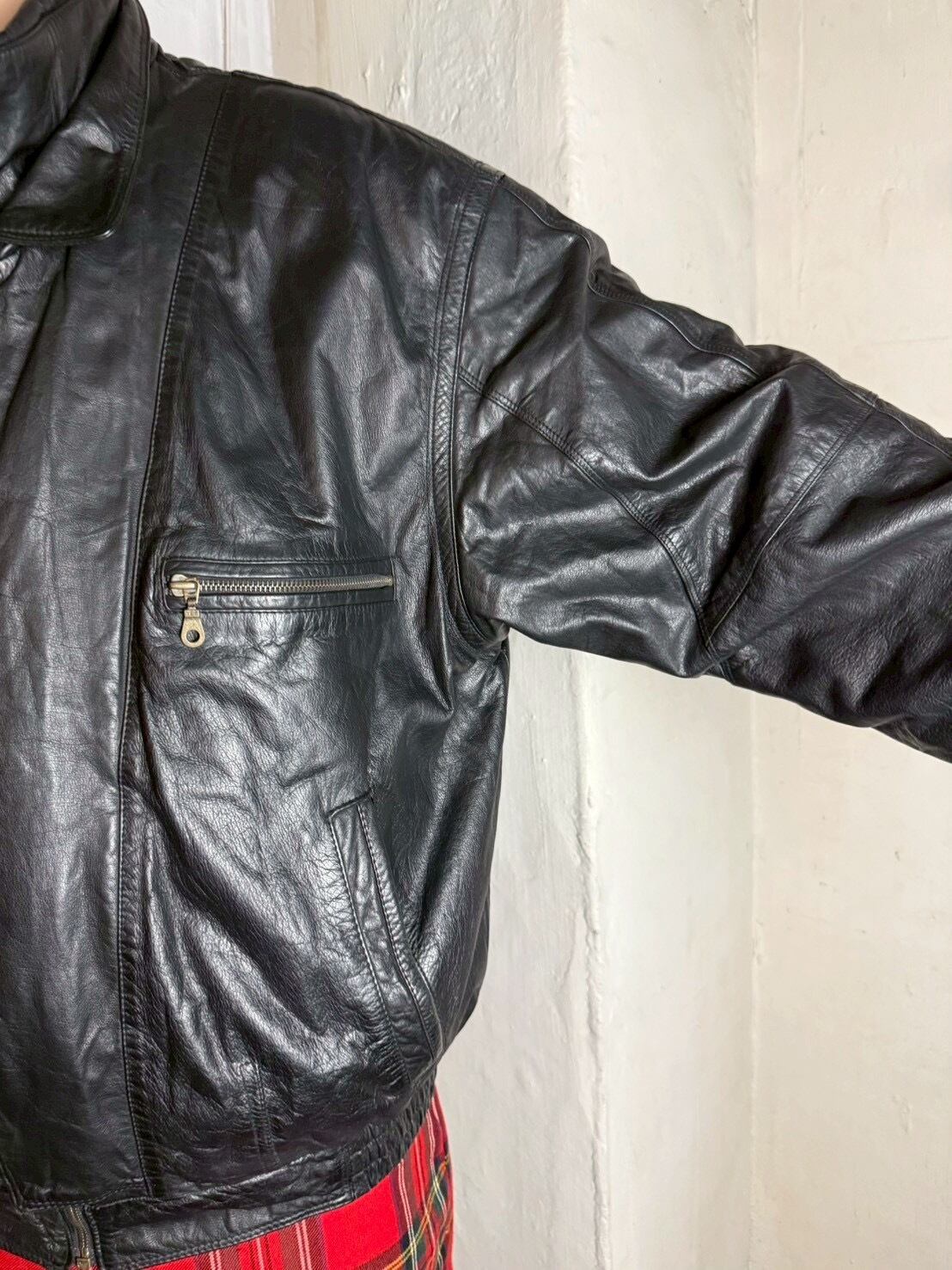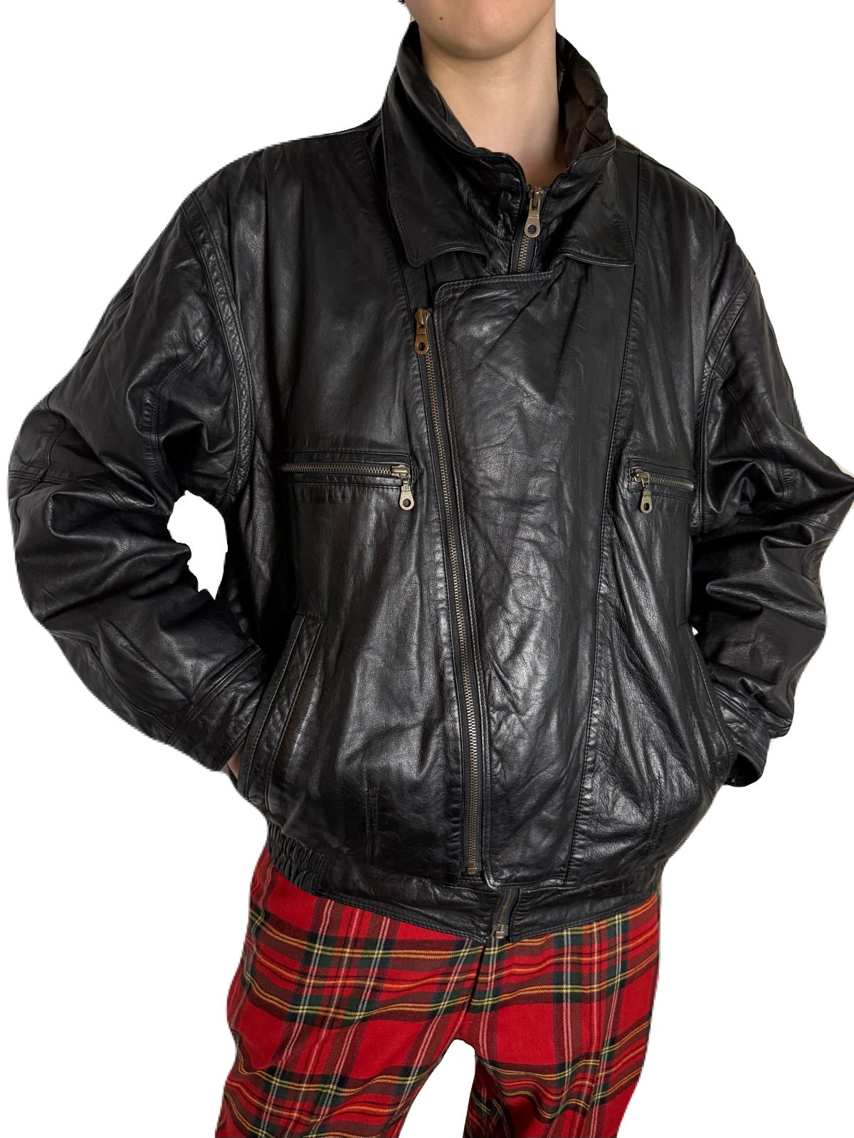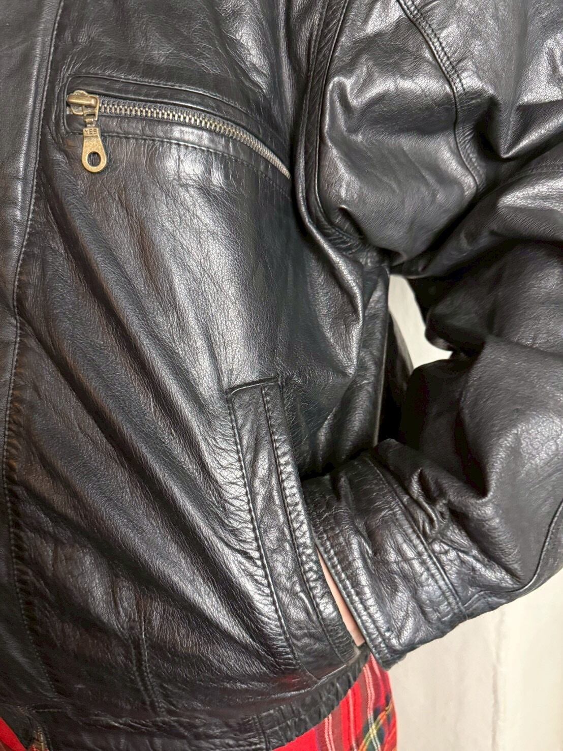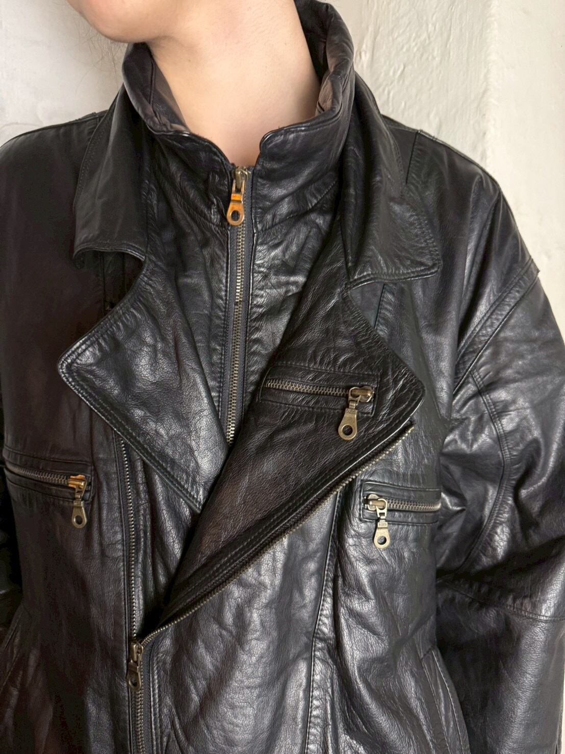 90’sの柔らかなレザージャケット。ネックの高いダブルカラーデザインが目を惹きます。