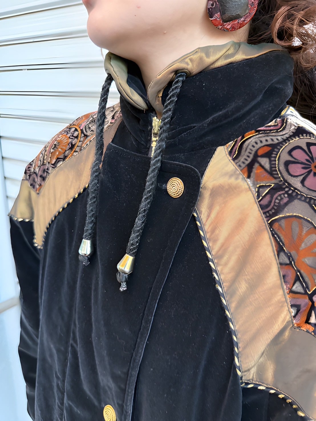 肩の部分にはノスタルジックなジオメトリックプリントのベロアが配され、その周りを玉虫生地やロープのブレードが素敵に飾っています。