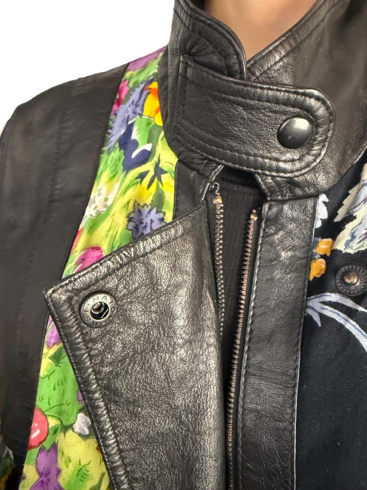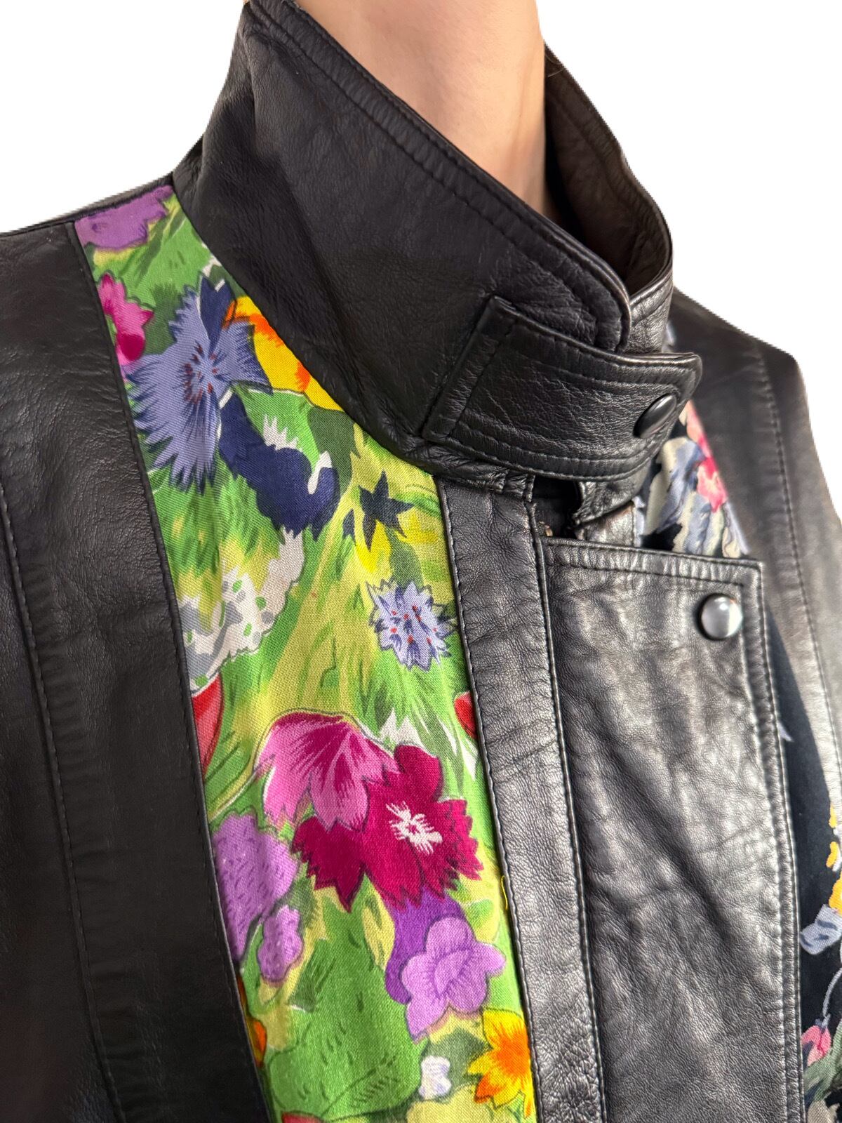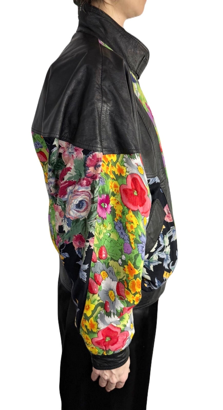 無骨さのあるレザーと それとは対照的なフラワーテキスタイルの組み合わせ。80’sならではの大胆な遊び心が何とも贅沢なブルゾン。