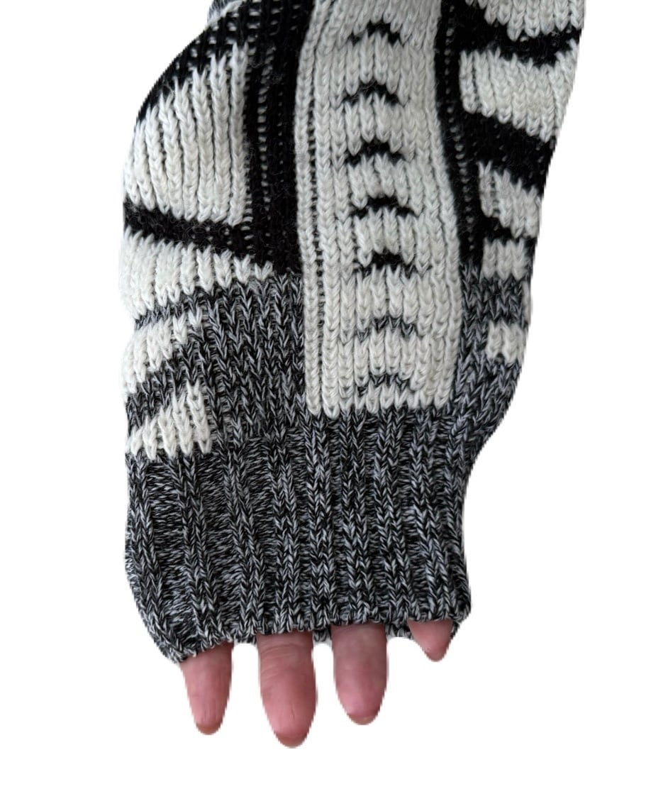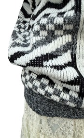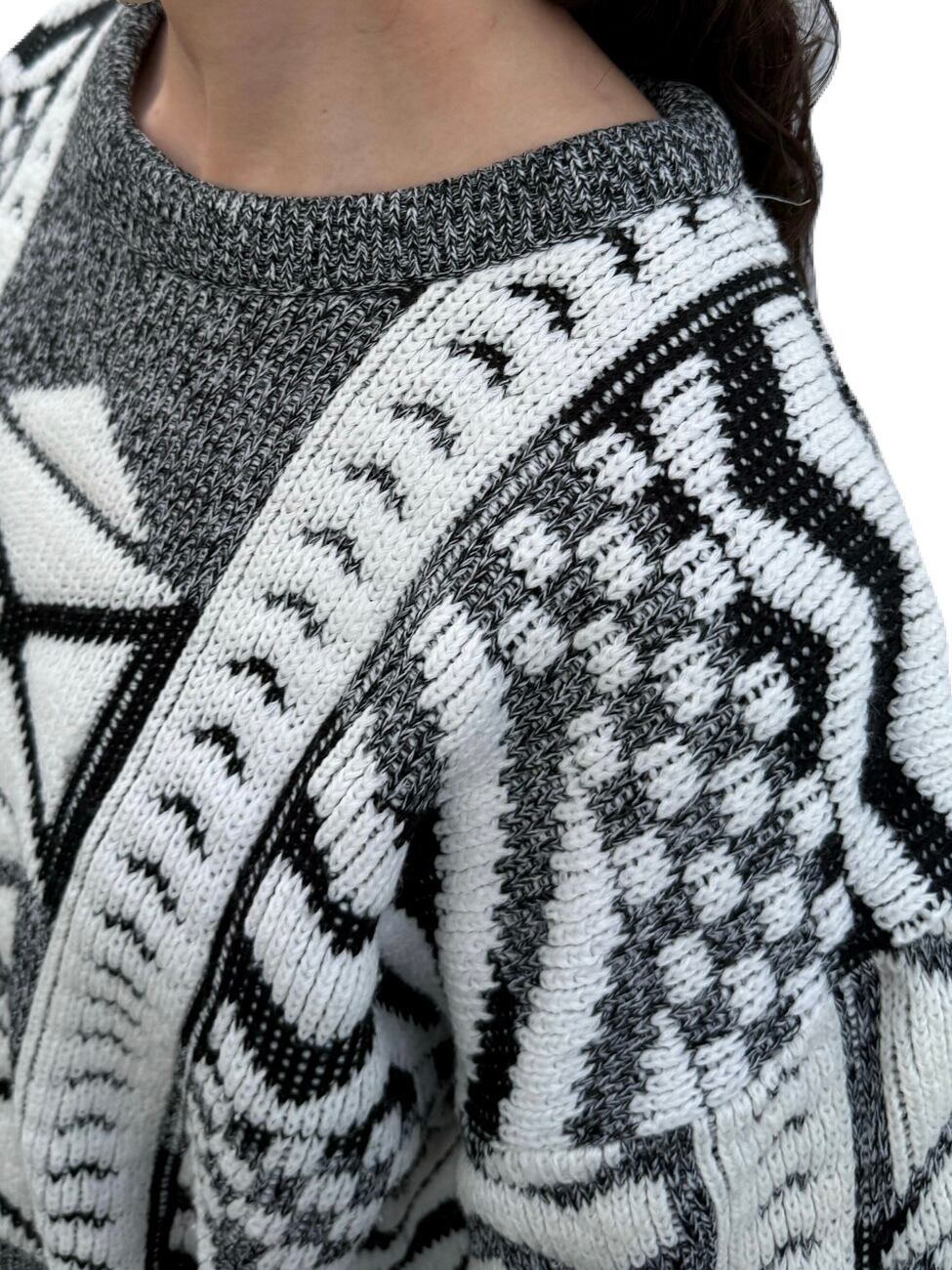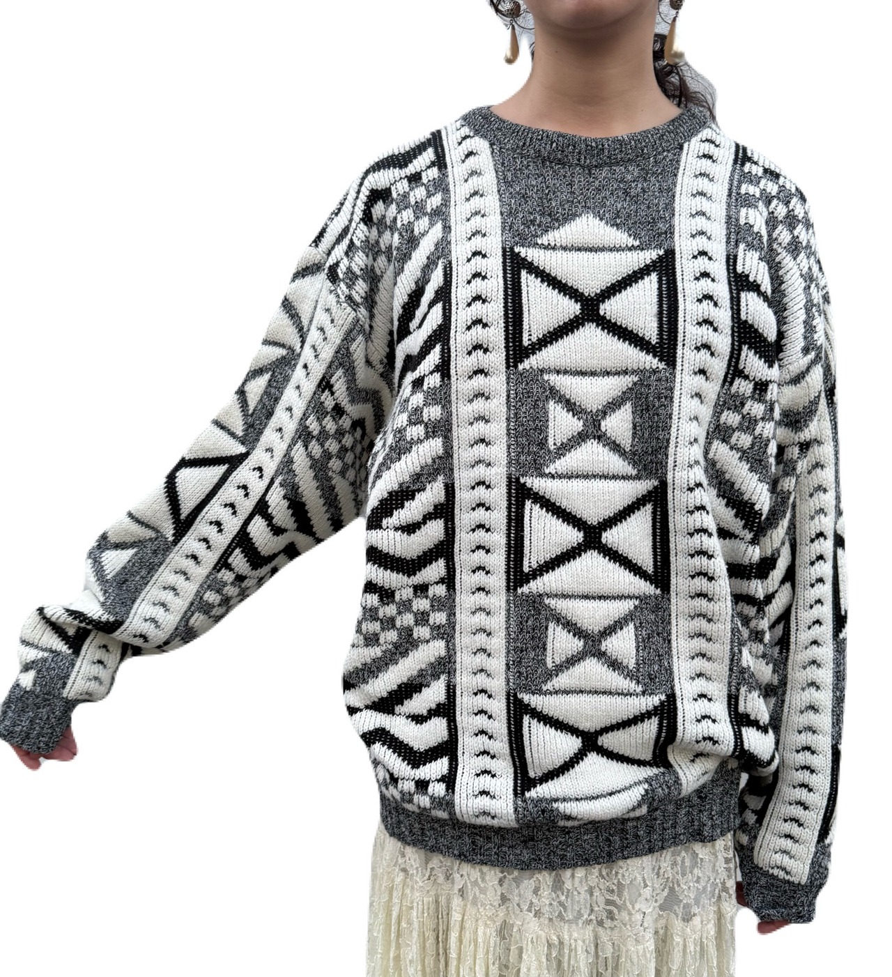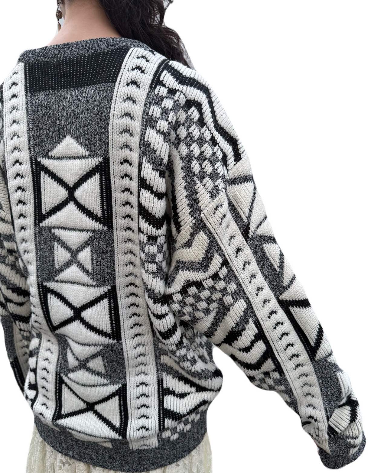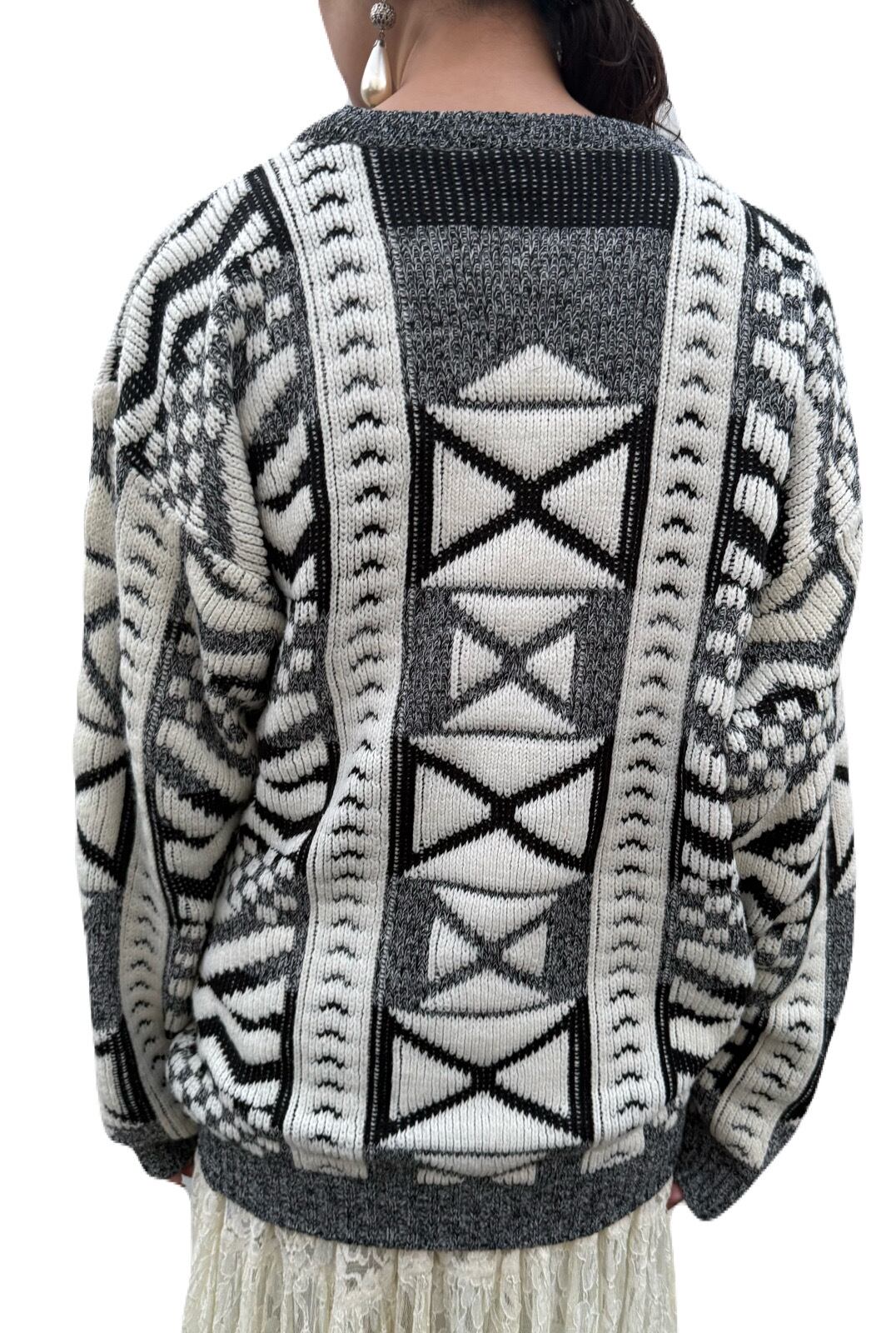 立体感のあるジオメトリックデザイン。シンプルな配色ながら、拘りの模様でコーディネートの主役になりそうなセーターです。