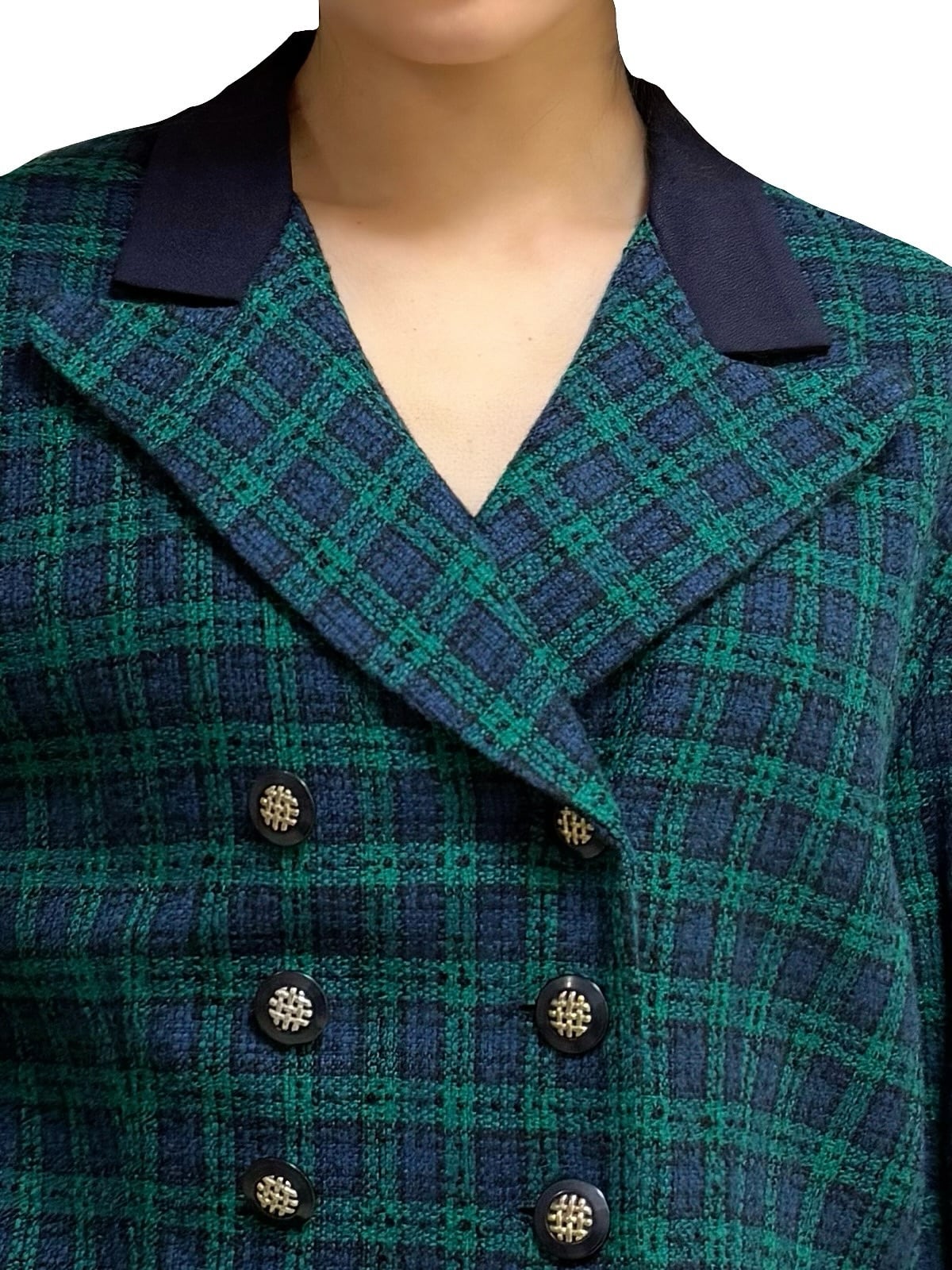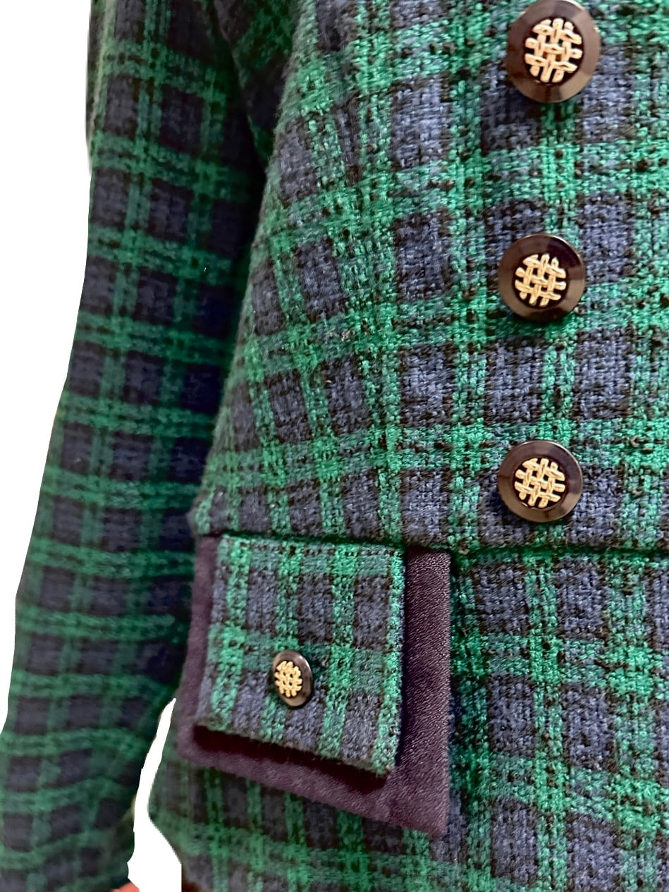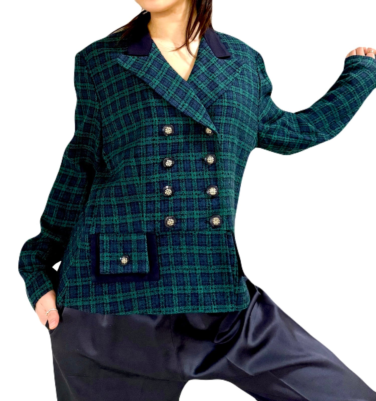 ブラックウォッチのタータンチェックに、ゴールドボタンが映える、80‘sヴィンテージジャケット。