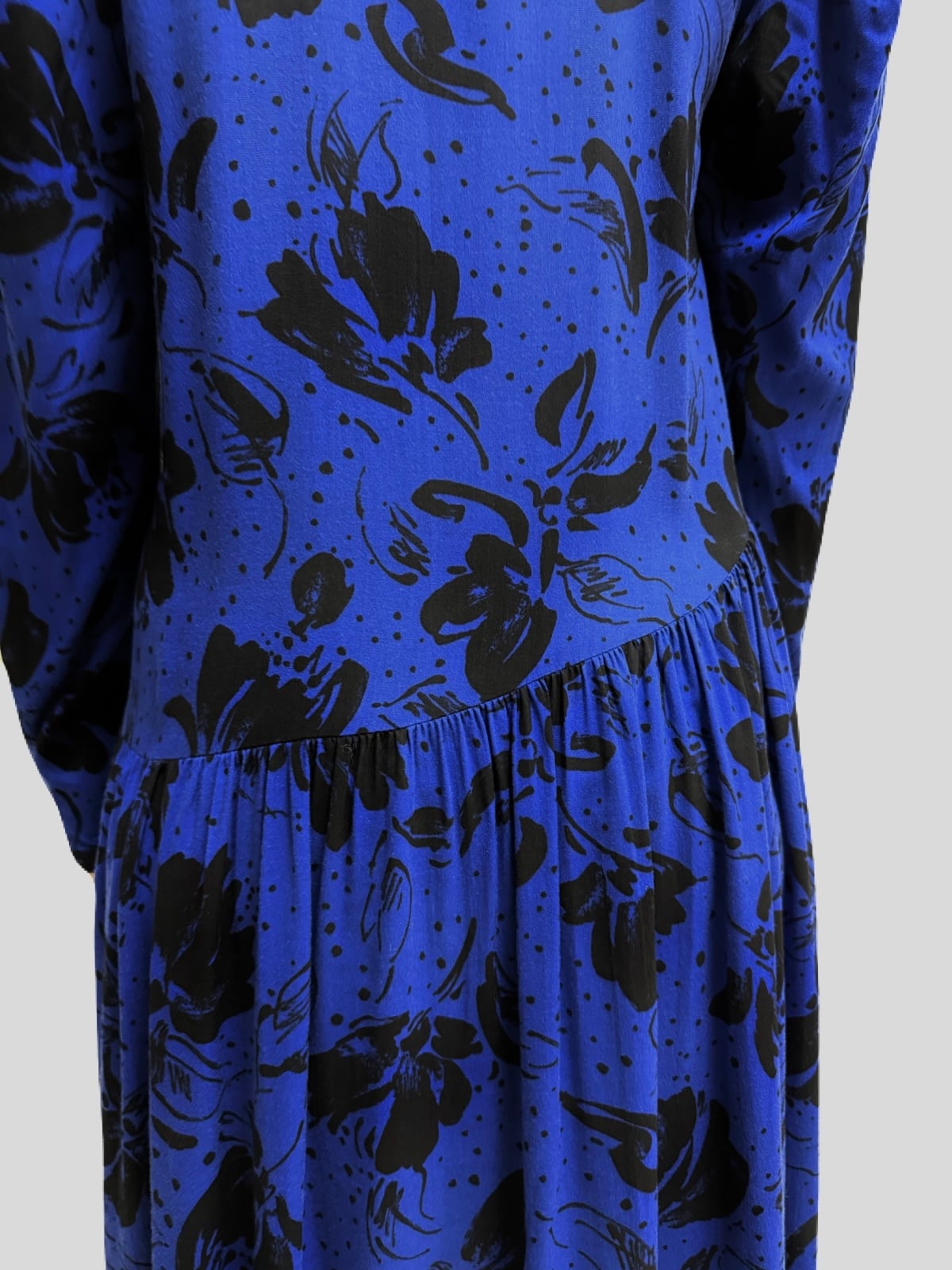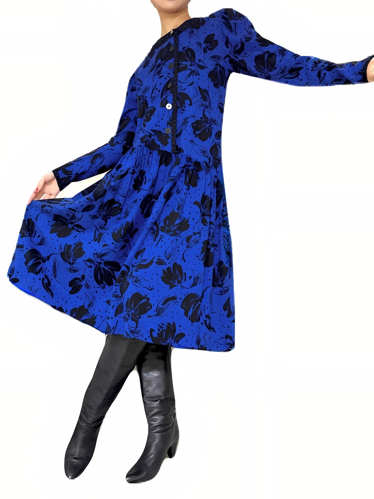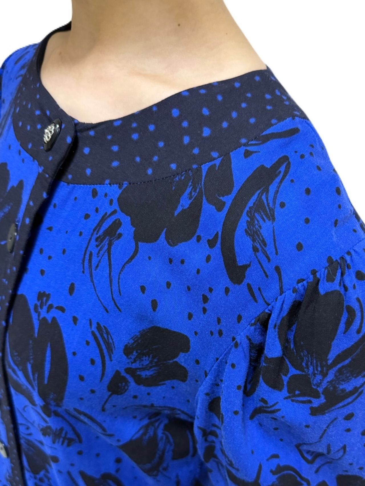 凛としたロイヤルブルーに、ハンドペイント風のフラワープリントが広がる、シックなヴィンテージワンピース。