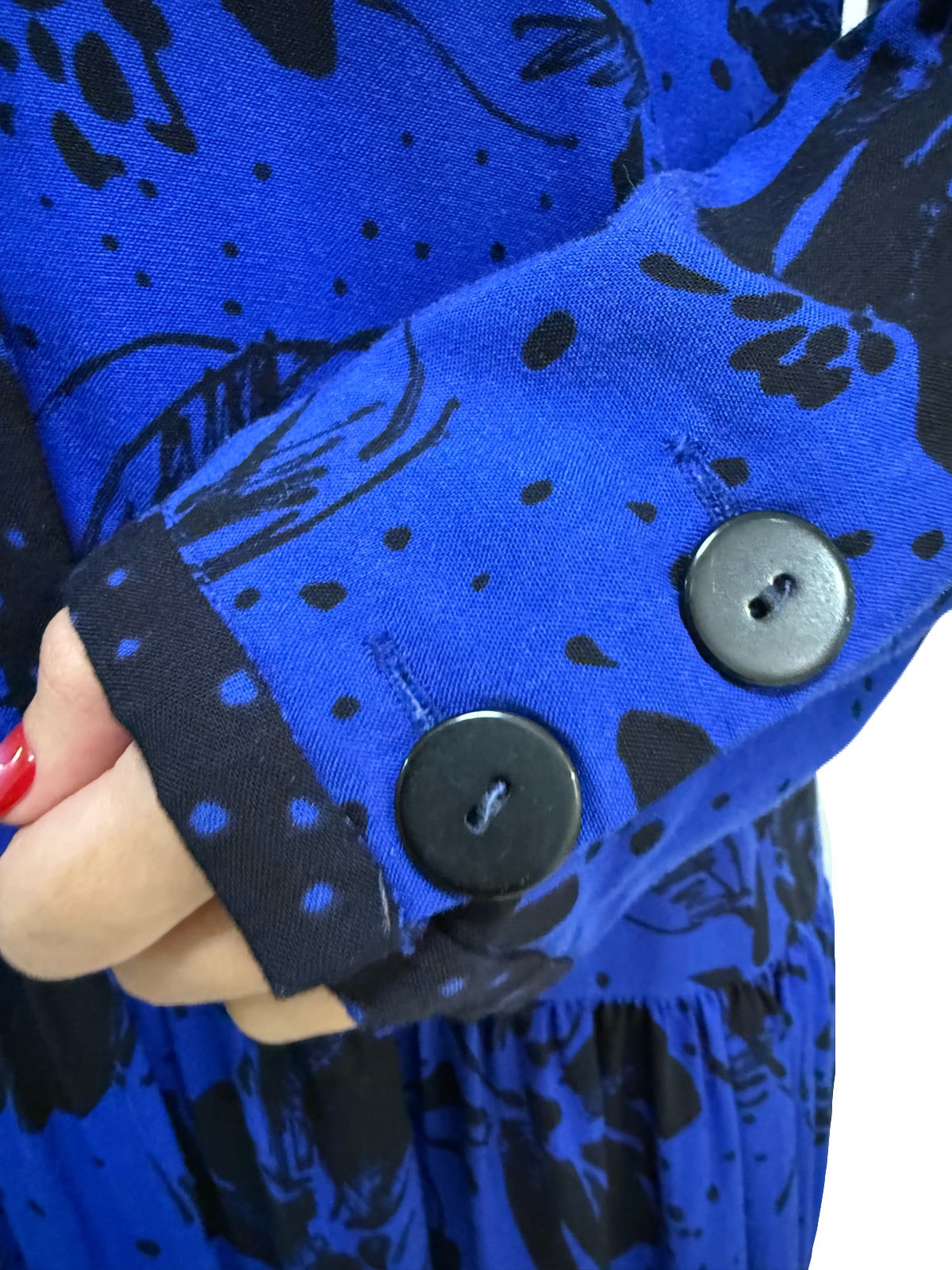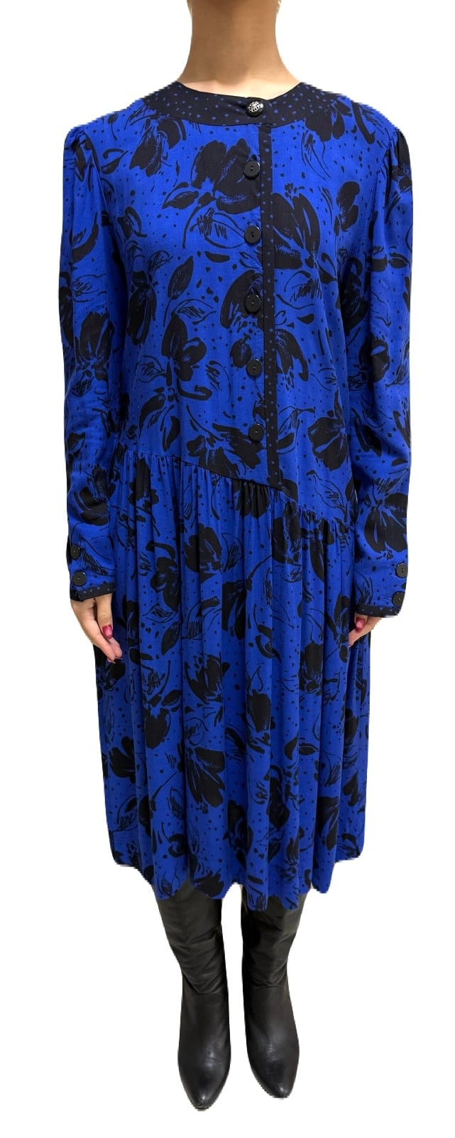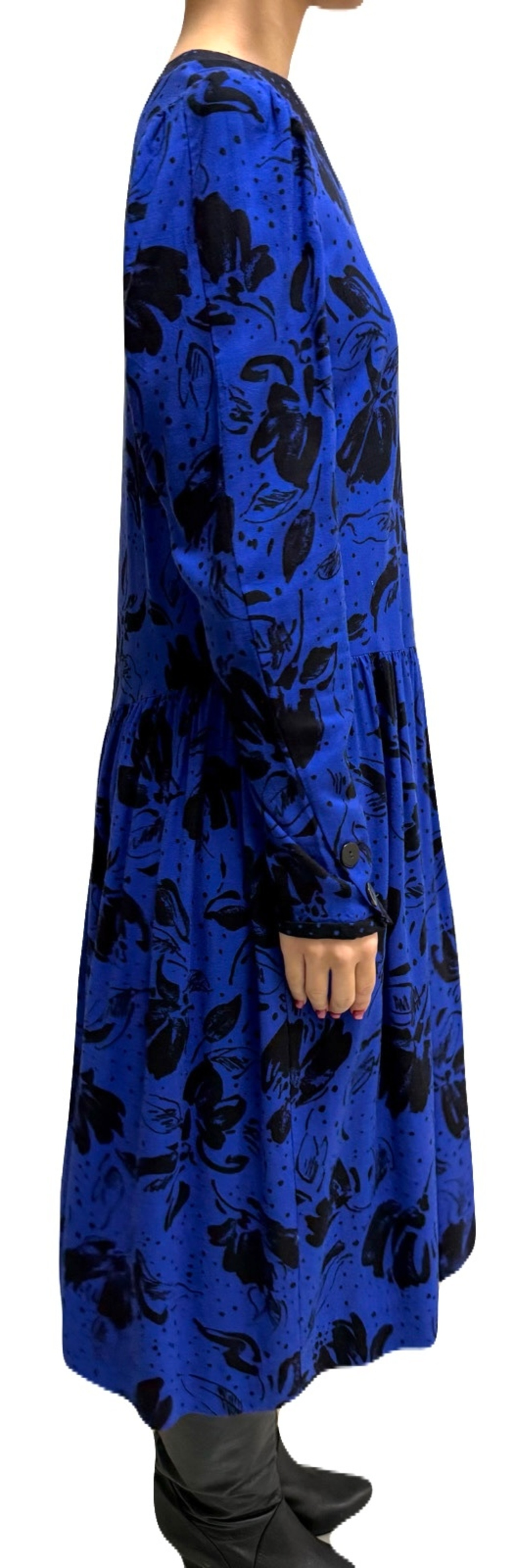 凛としたロイヤルブルーに、ハンドペイント風のフラワープリントが広がる、シックなヴィンテージワンピース。