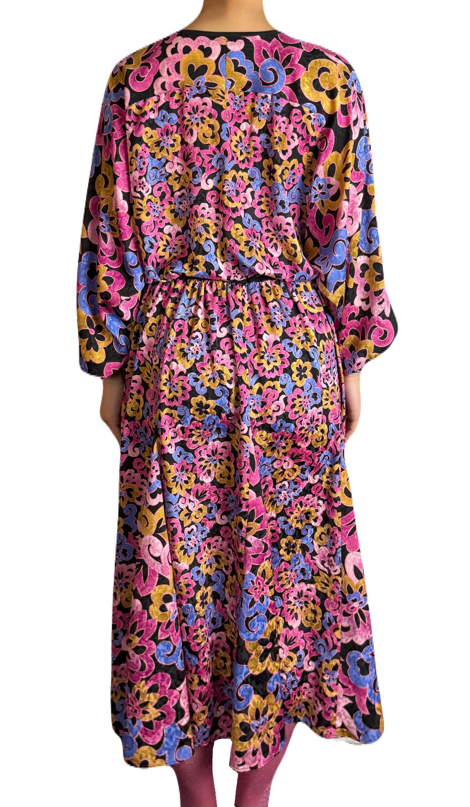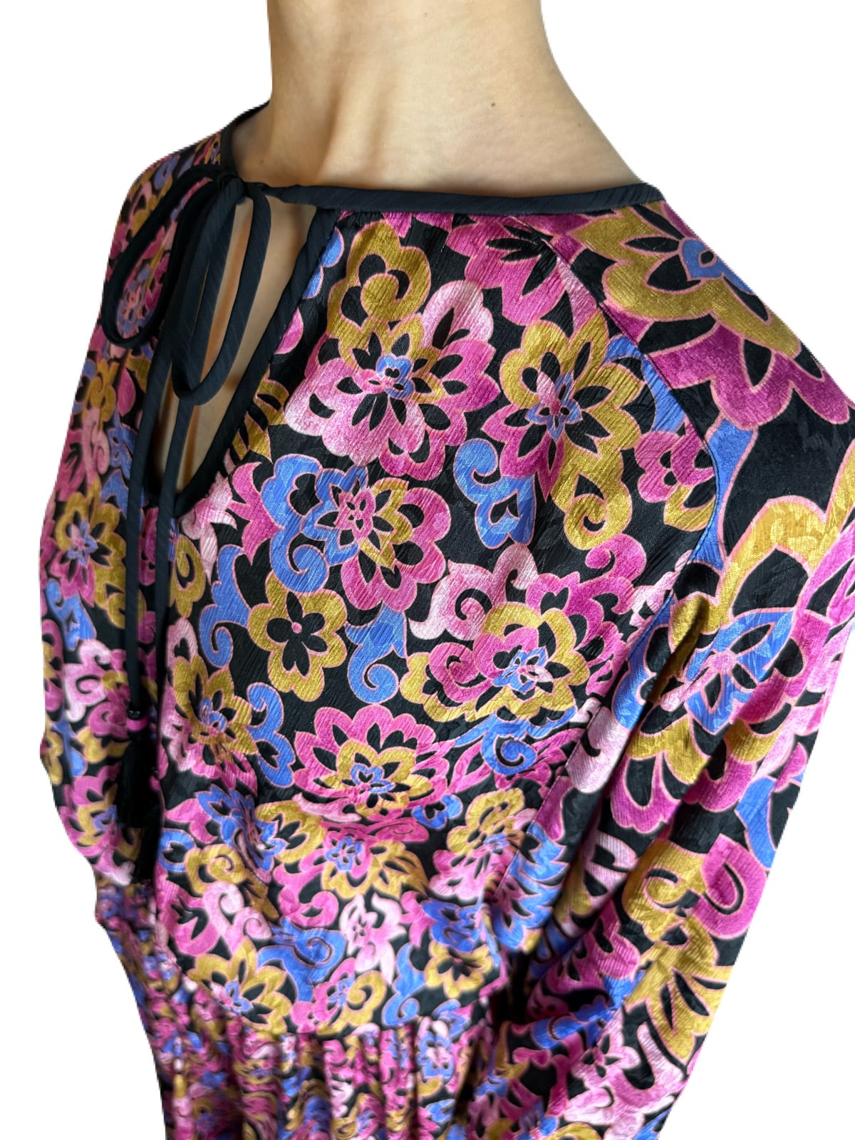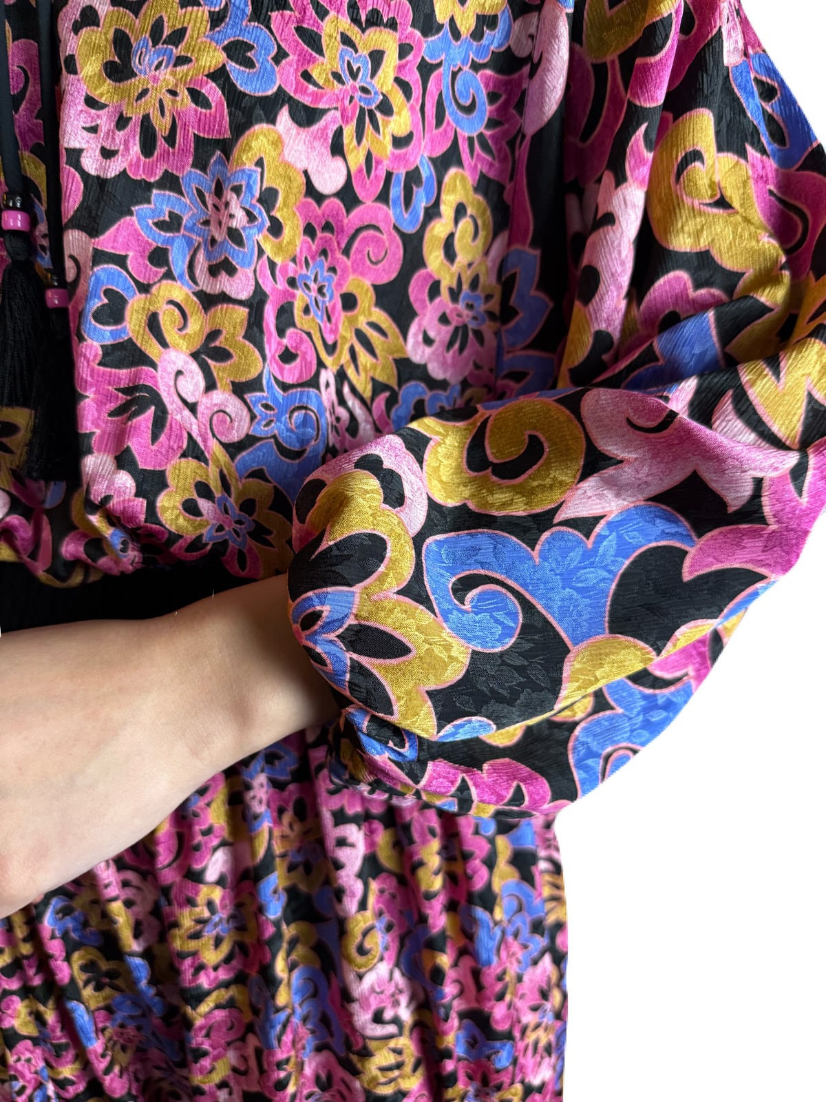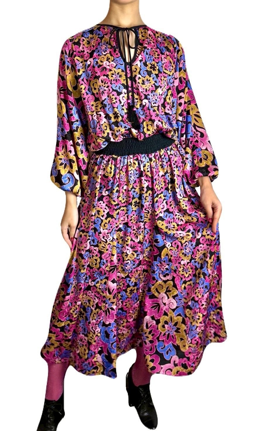 ブラックを基調にフラワープリントが広がる 希少な長袖のシンプルデザインのDiane Freis ワンピース。