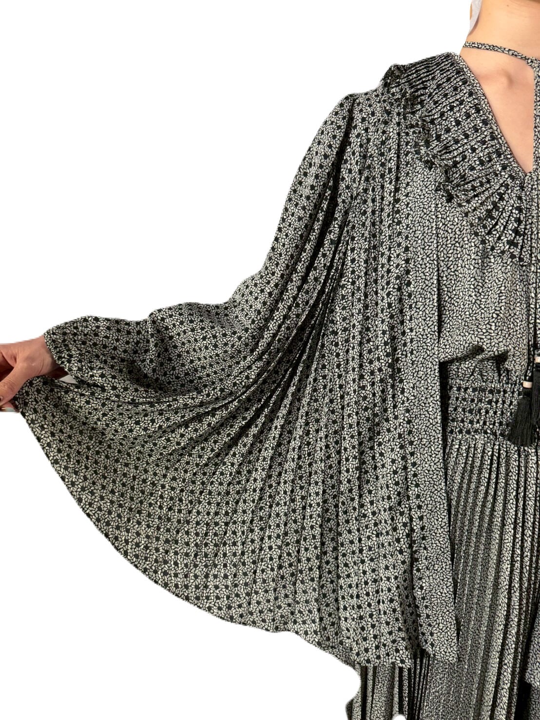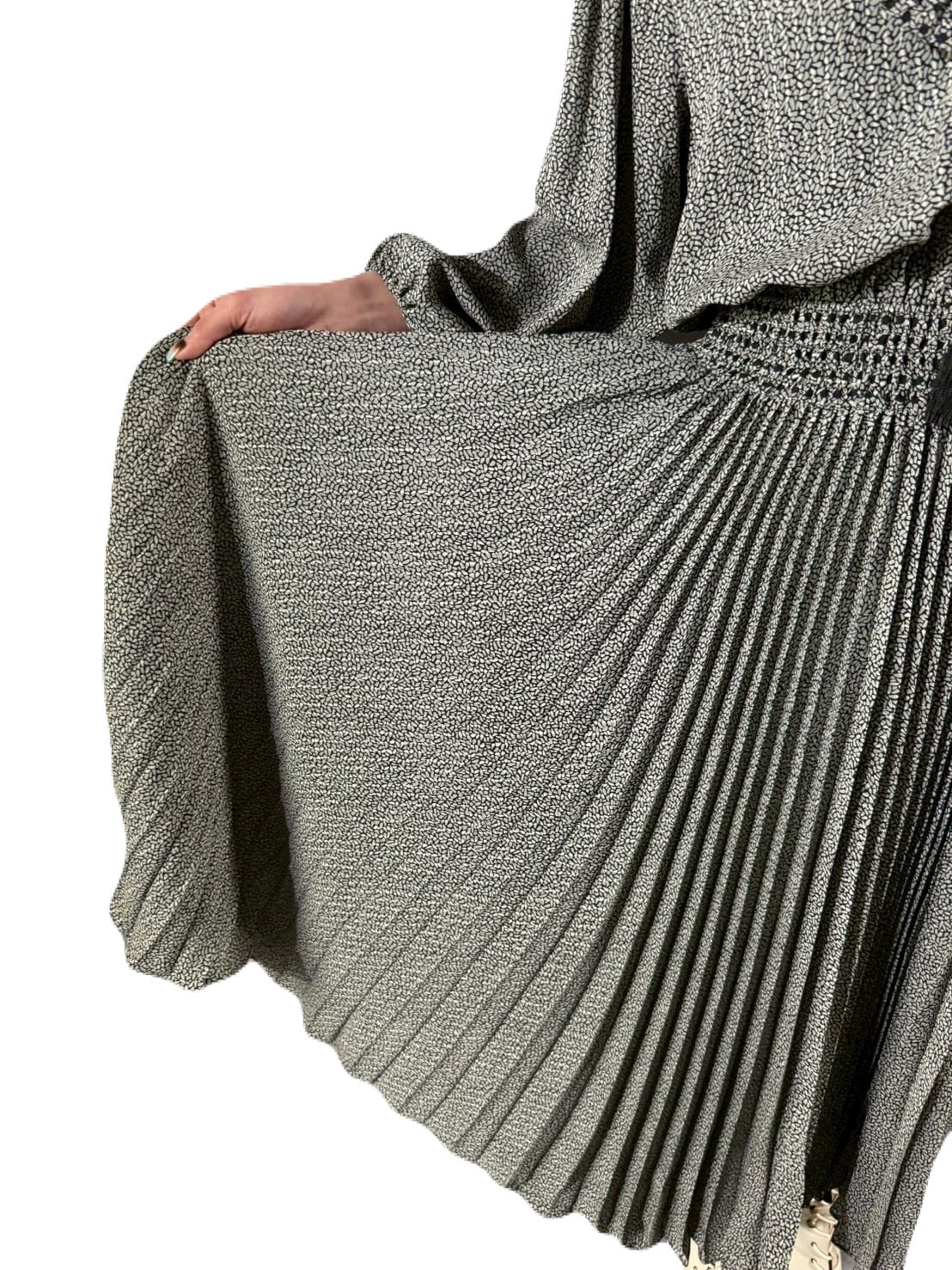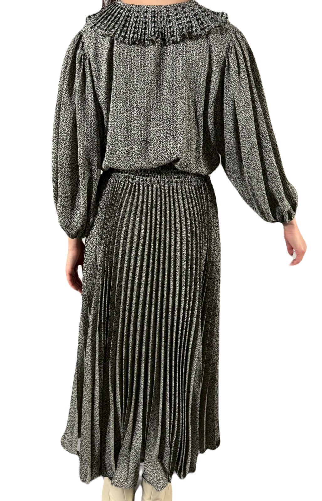 ワンピースのボトムは生地をたっぷりと使ったアコーディオンプリーツで、歩くたびに優雅にゆらめく動きがとても美しいです。